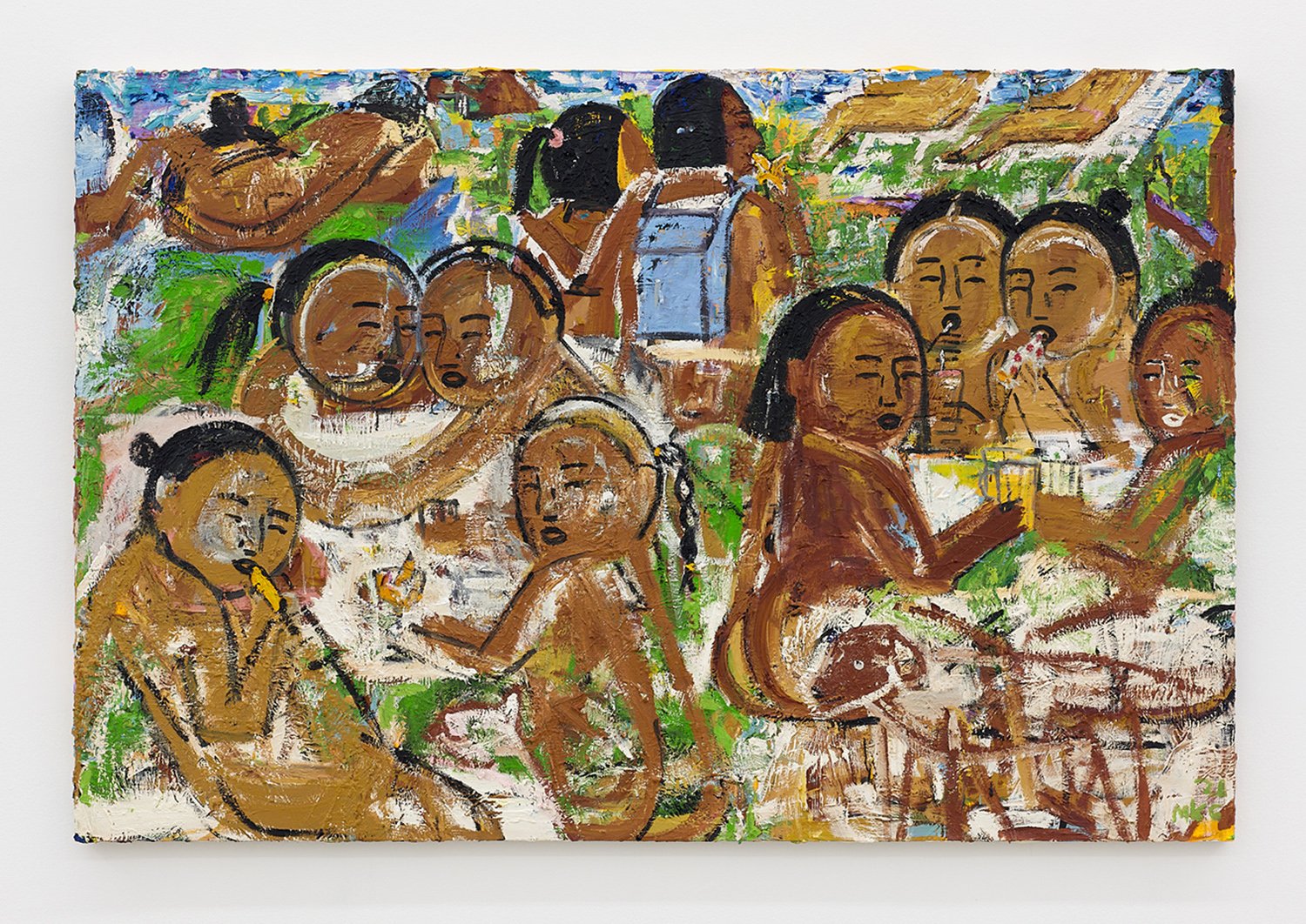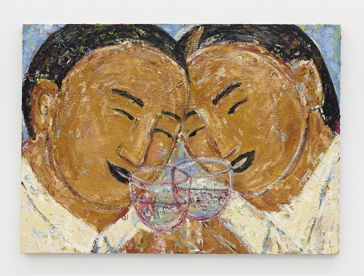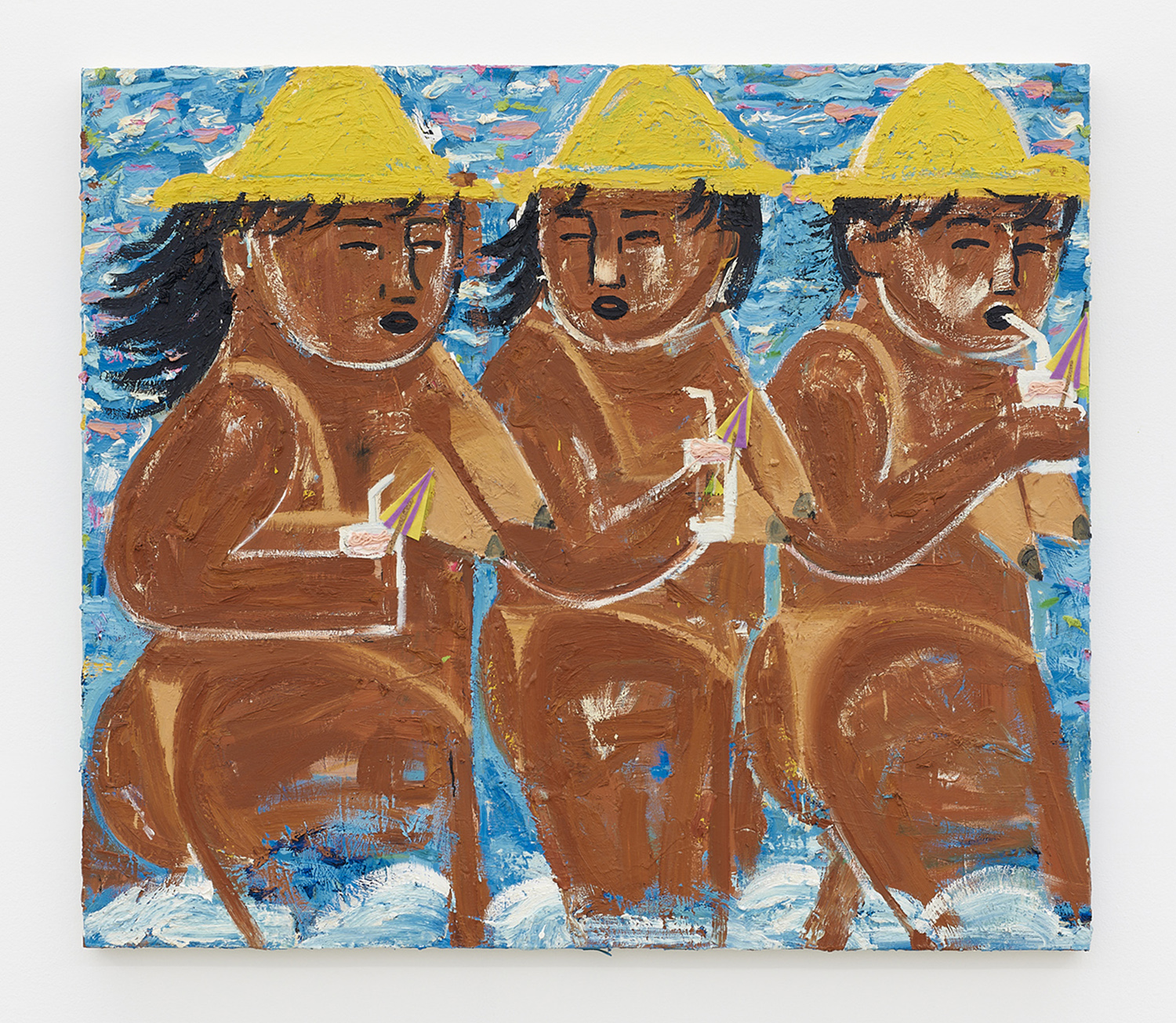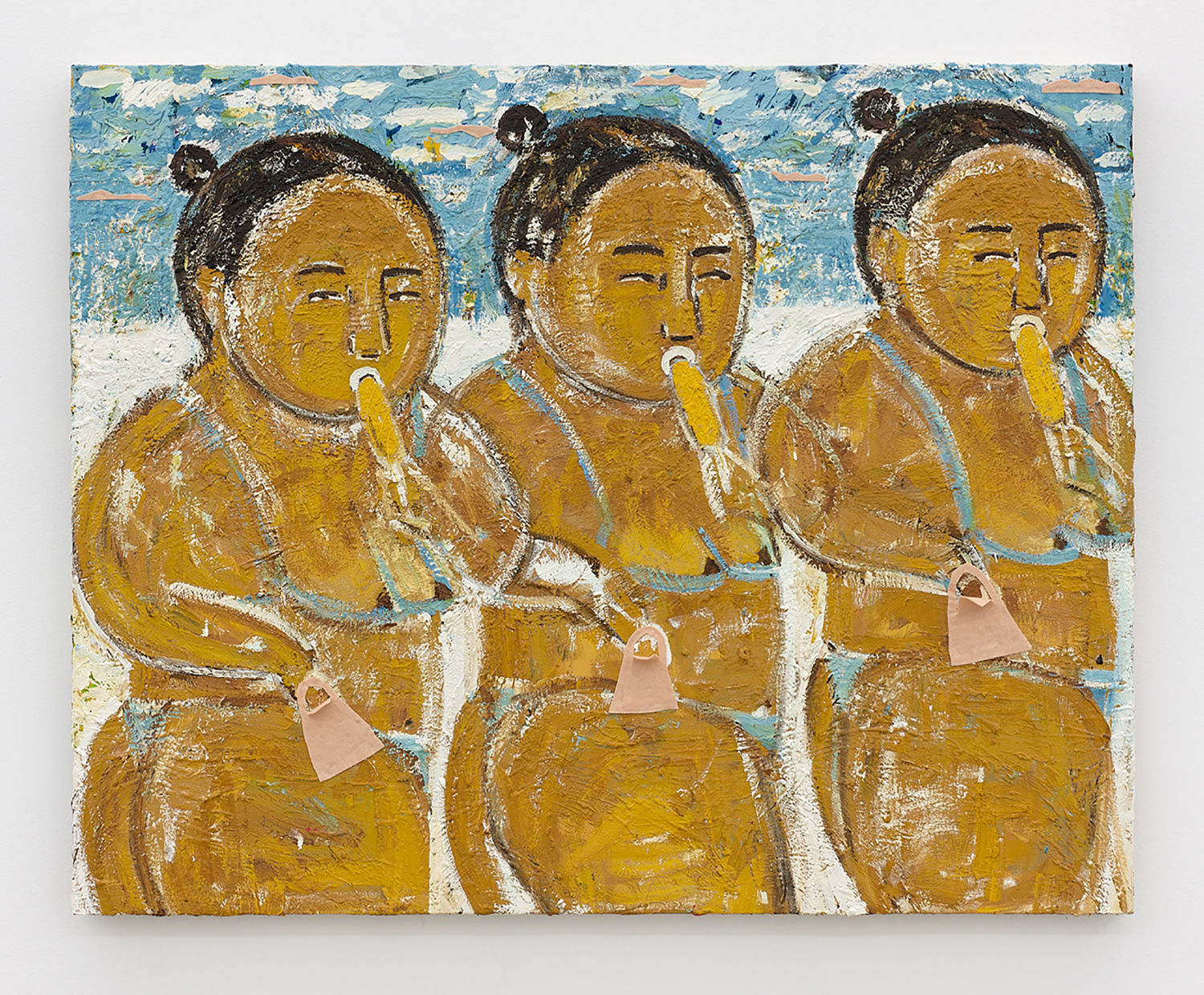 Full of camaraderie and joie de vivre, Baguettes includes not only long, delicious loafs of bread but also refers to “chopsticks” in French and calls to mind the community with which we share our meals. Garza’s charming heroines convene for more than sustenance: they beam with fulfillment and pleasure as they sip from their glasses and graze upon various carbs, many of which take on the undeniably phallic shape of French bread. The preparation and consumption of food is not just a way to dabble in hedonism but is also closely tied to personal tradition and nostalgia, which is reflected in the layered process of Garza’s painting. Gradually building up the surface by applying thick strokes of paint over and over again, the artist is perhaps immersed in fond memories of moments spent with her loved ones.