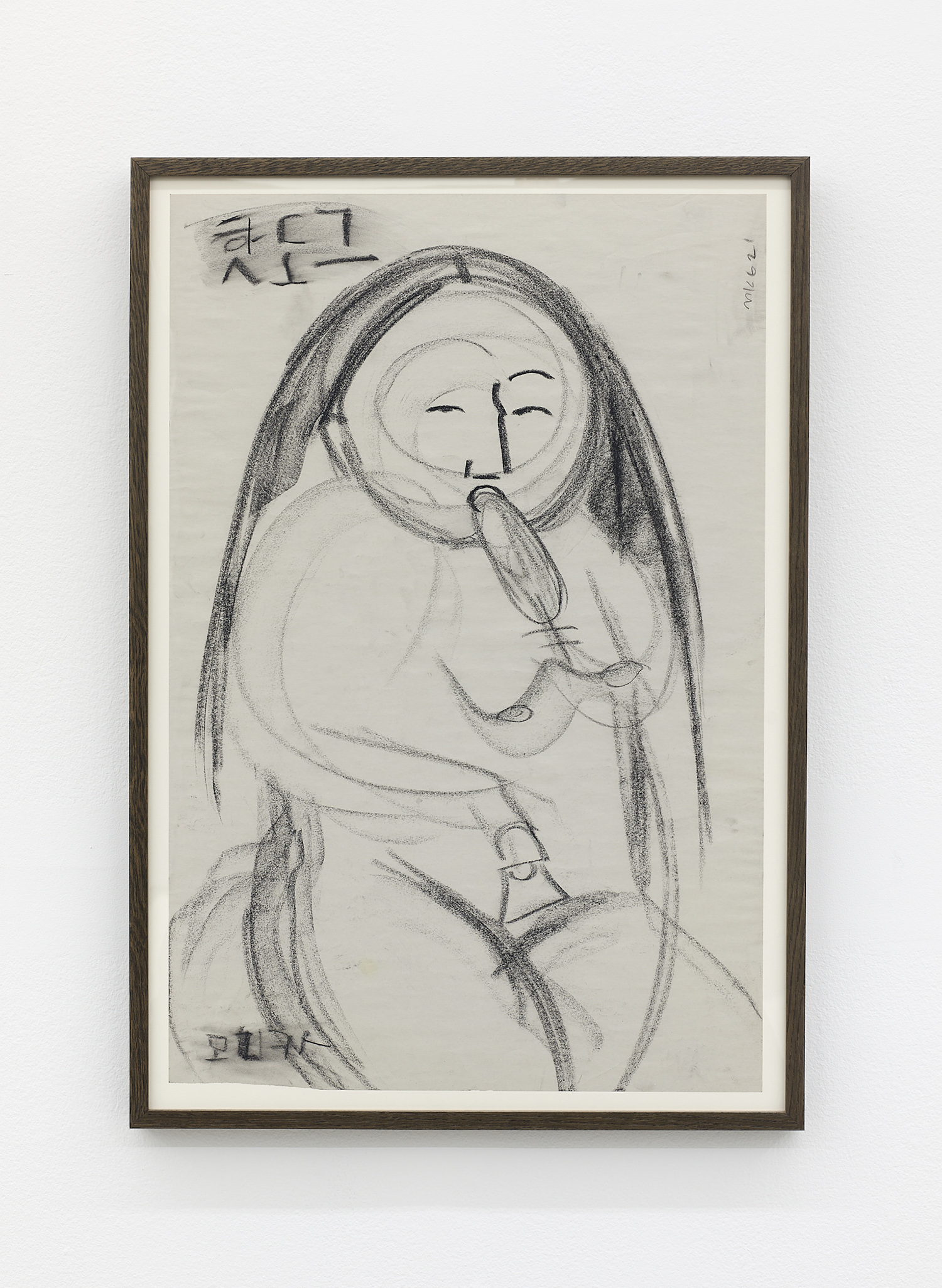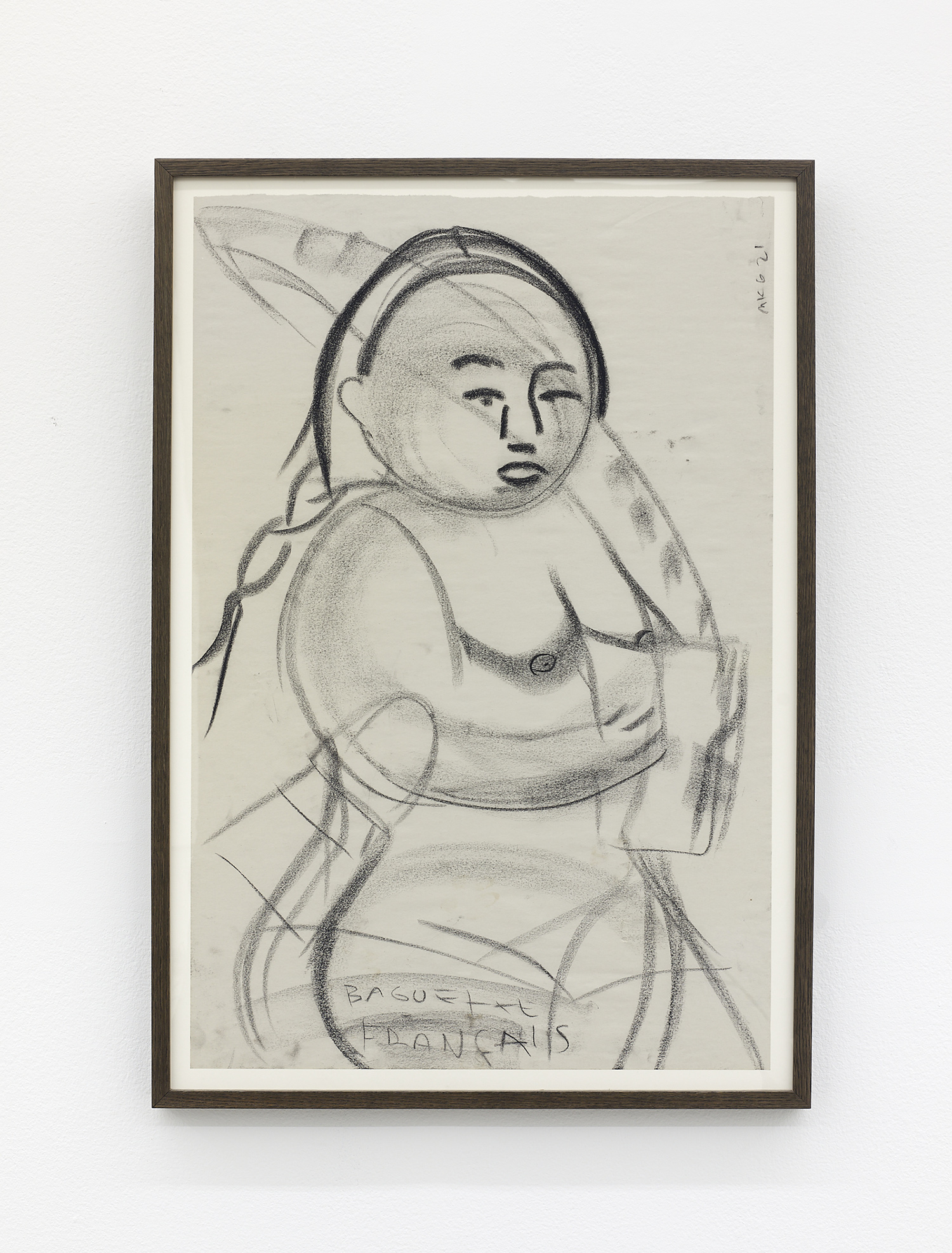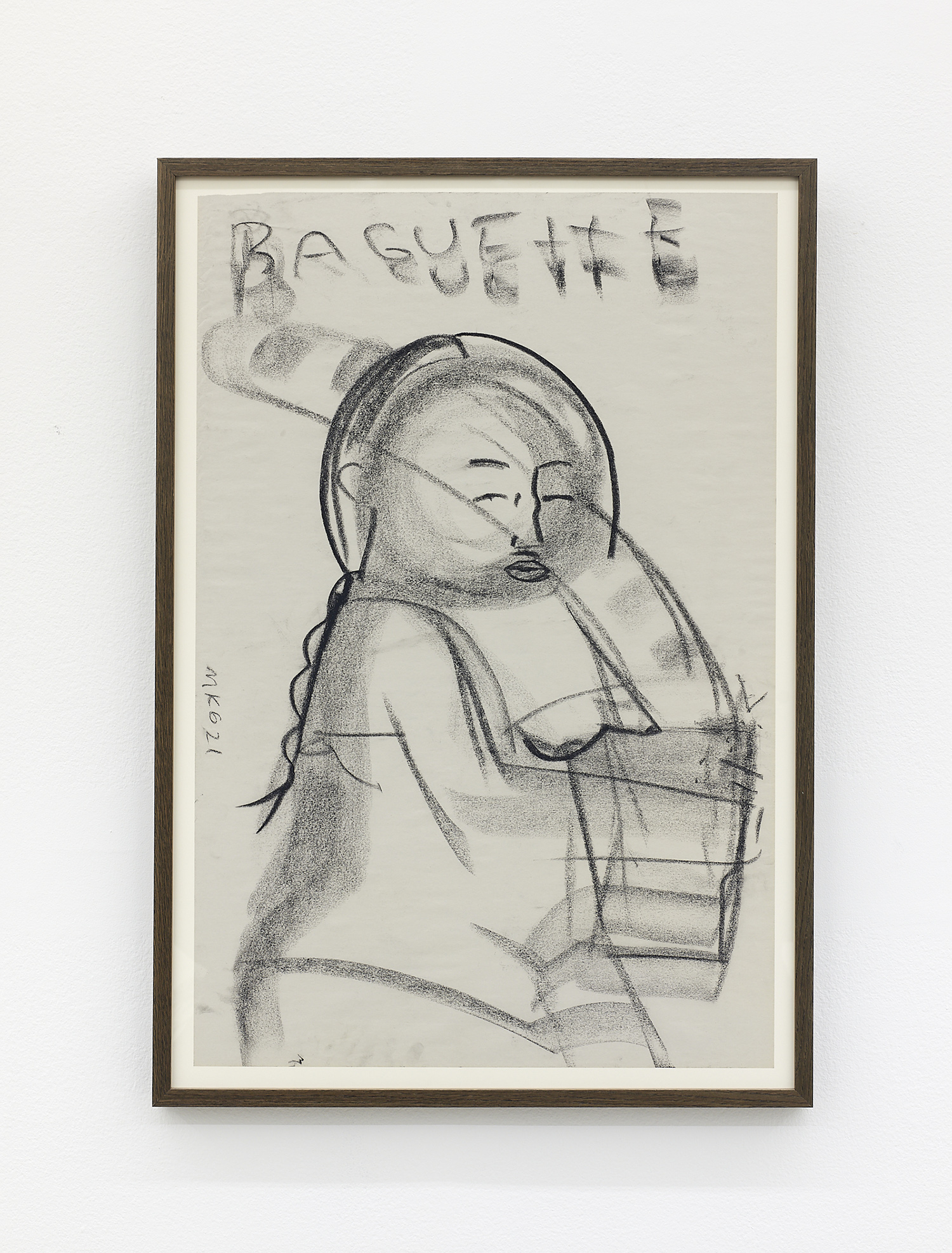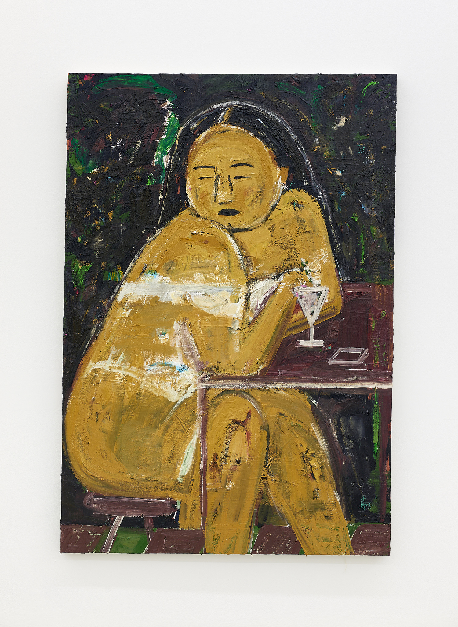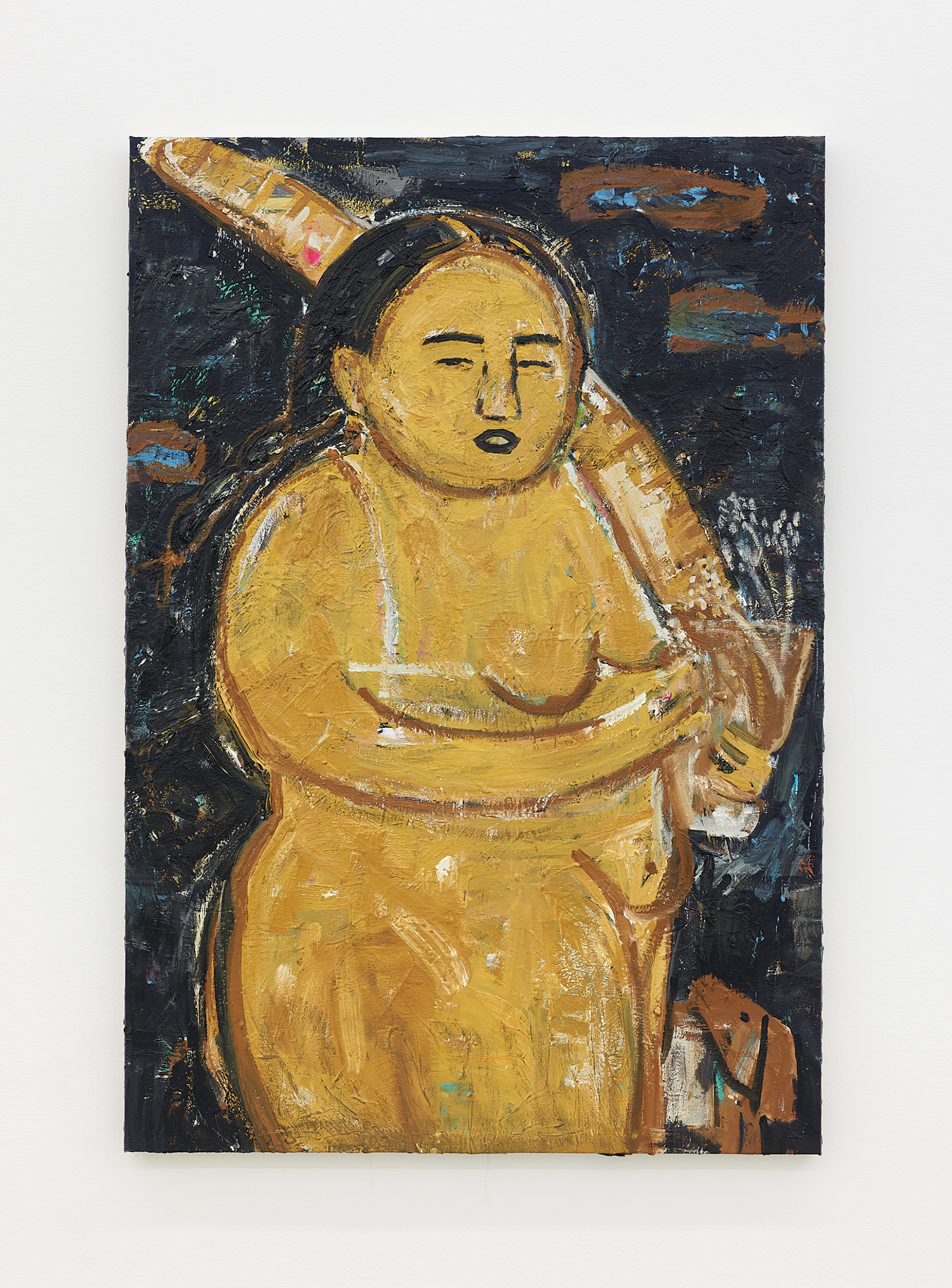 Full of camaraderie and joie de vivre, Baguettes includes not only long, delicious loafs of bread but also refers to “chopsticks” in French and calls to mind the community with which we share our meals. Garza’s charming heroines convene for more than sustenance: they beam with fulfillment and pleasure as they sip from their glasses and graze upon various carbs, many of which take on the undeniably phallic shape of French bread. The preparation and consumption of food is not just a way to dabble in hedonism but is also closely tied to personal tradition and nostalgia, which is reflected in the layered process of Garza’s painting. Gradually building up the surface by applying thick strokes of paint over and over again, the artist is perhaps immersed in fond memories of moments spent with her loved ones.