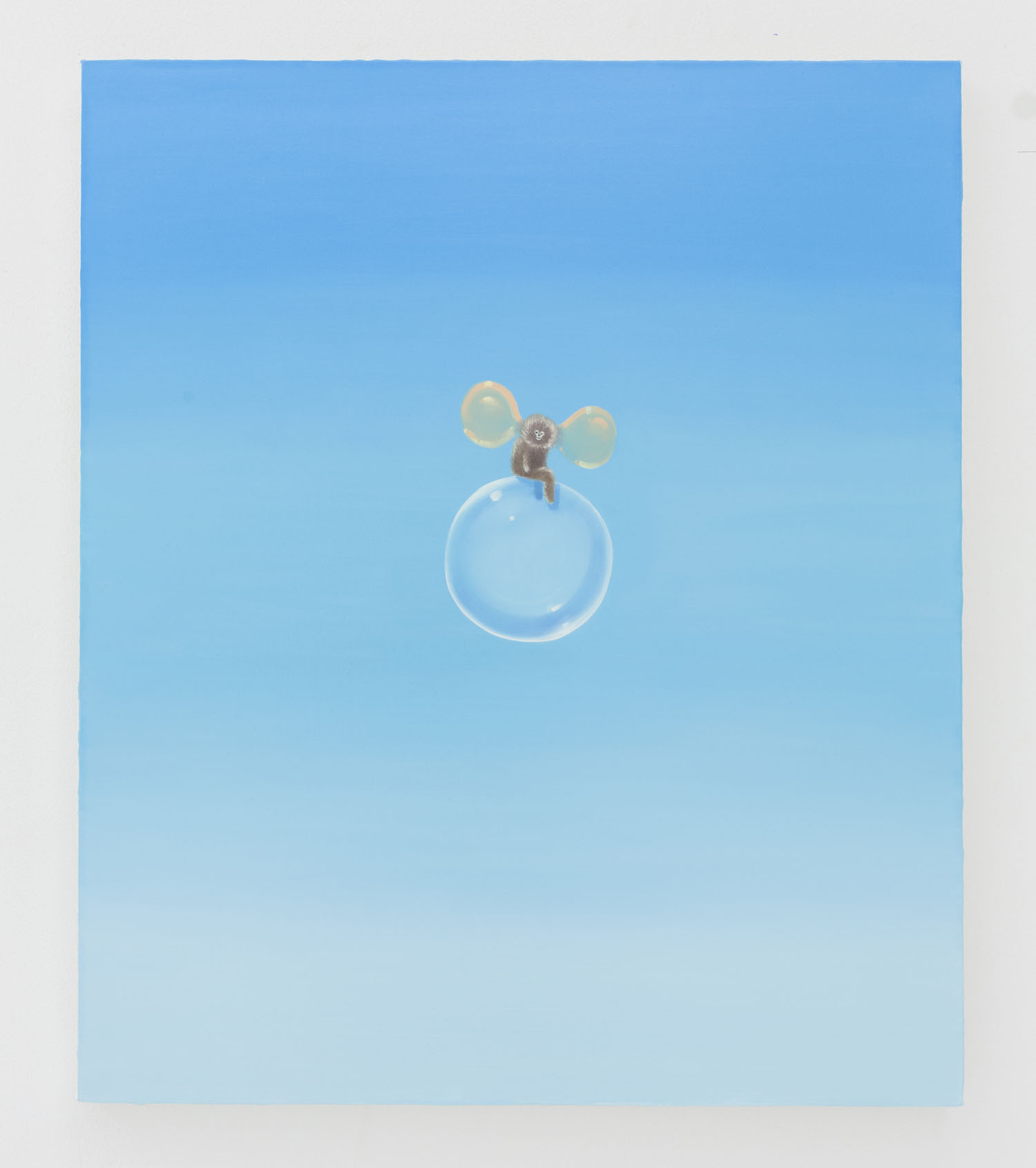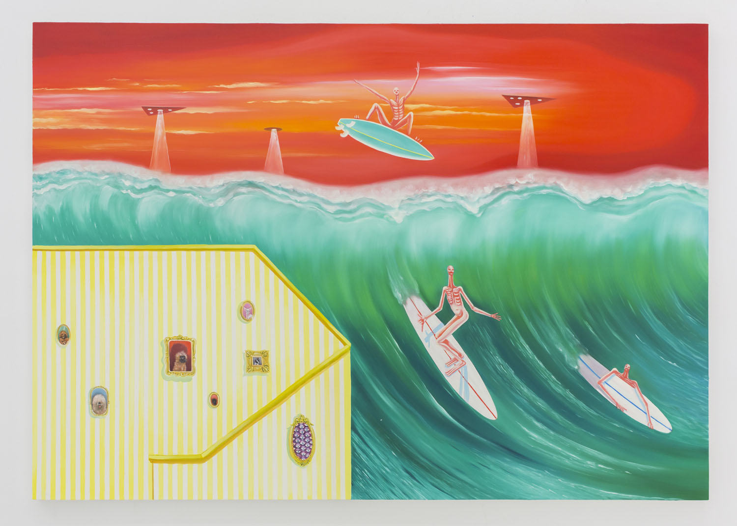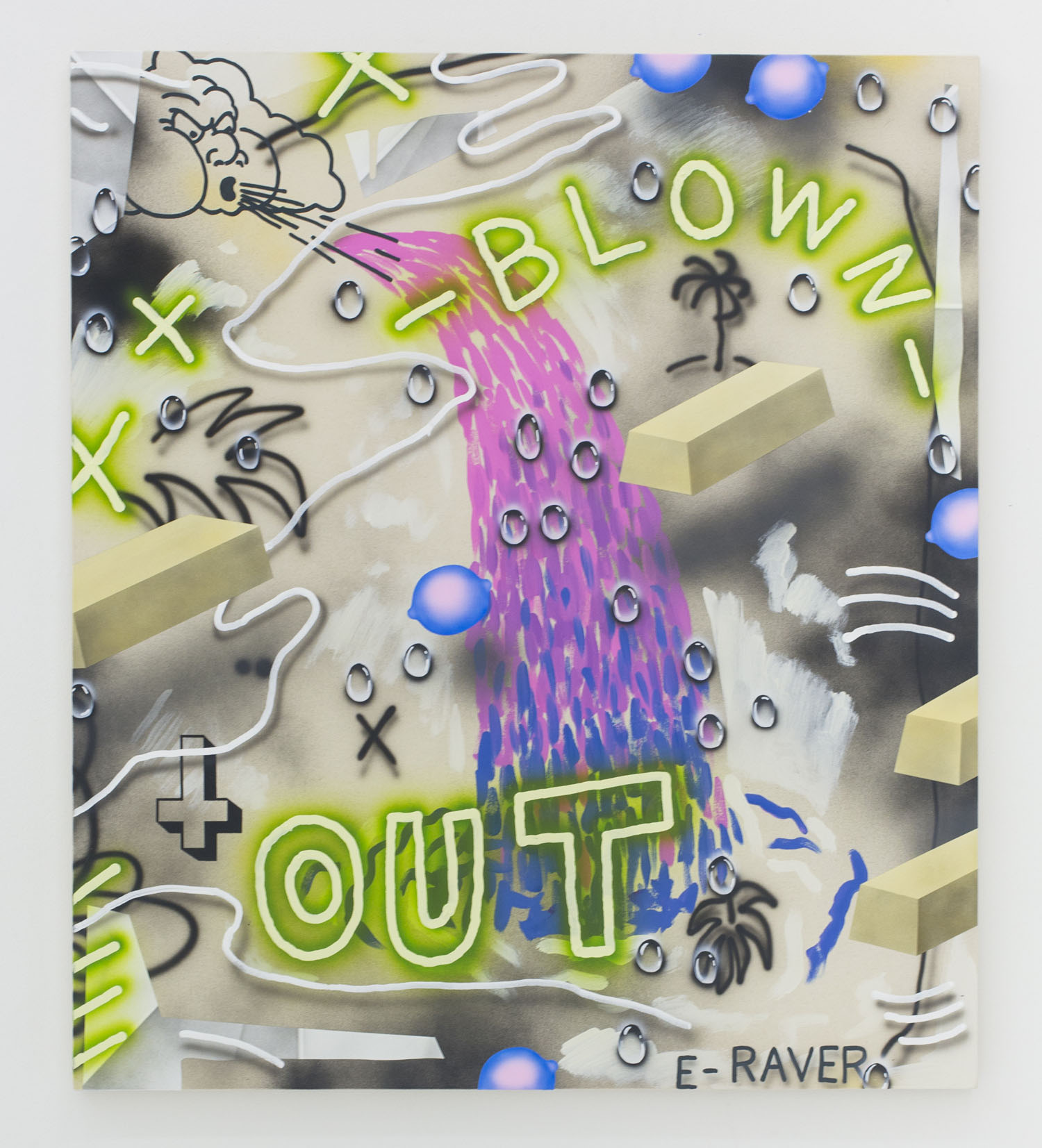 From the aggressively painted and colored “masks” by Ryan Schneider to the delicately lined dream-like paintings on pink panel by Lola Montes Schnabel, the techniques in the show vary, but the confidently illogical use of color continues through the group. A canary yellow cat on a hot pink nude in Todd James’ painting strongly resonates with Matisse’s contours of flat color and makes a specific nod, perhaps, with its bright red background. Josh Reames’ “bad internet” painting of slick airbrushed edges and drop shadows feature pungently indigo lemons and black palm trees. Perhaps furthest “out there” in the realm of bizarro color is Ryan Michael Ford who offers us bright red skies and lakes of lava, aliens and plushies, plus “bubble humpers,” whatever those are, pictured above.
