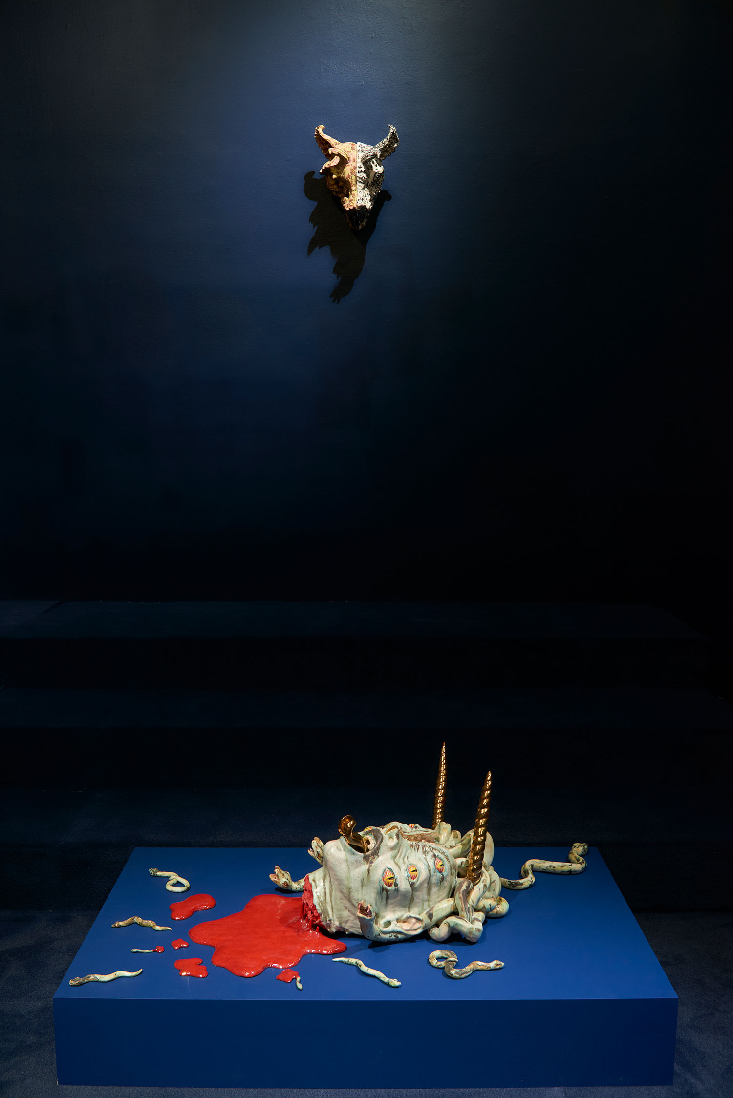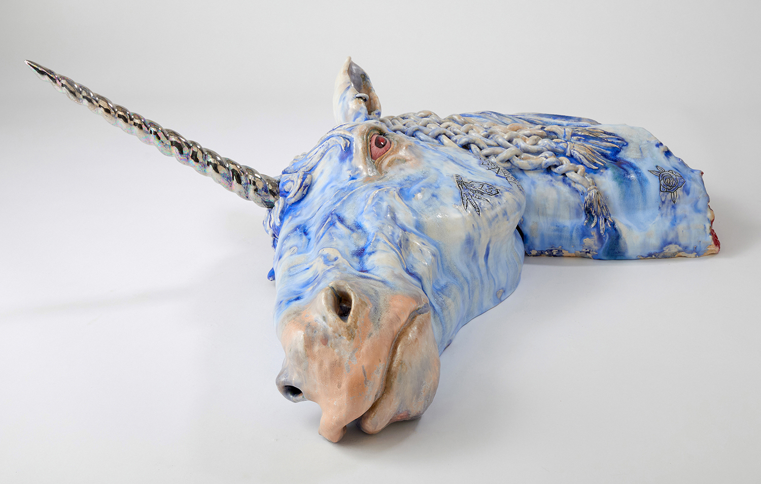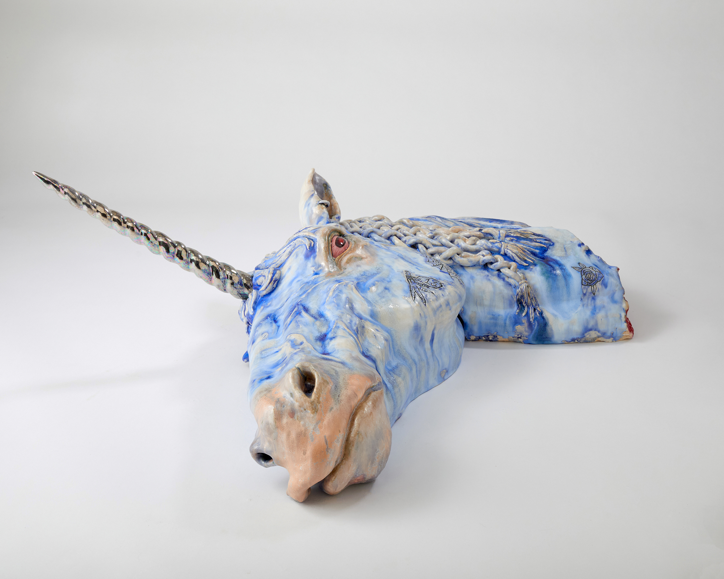 Unicorn, 2022, ceramic, glaze, underglaze, luster, 10 x 31 x 27 inches, 25 x 79 x 69 cm