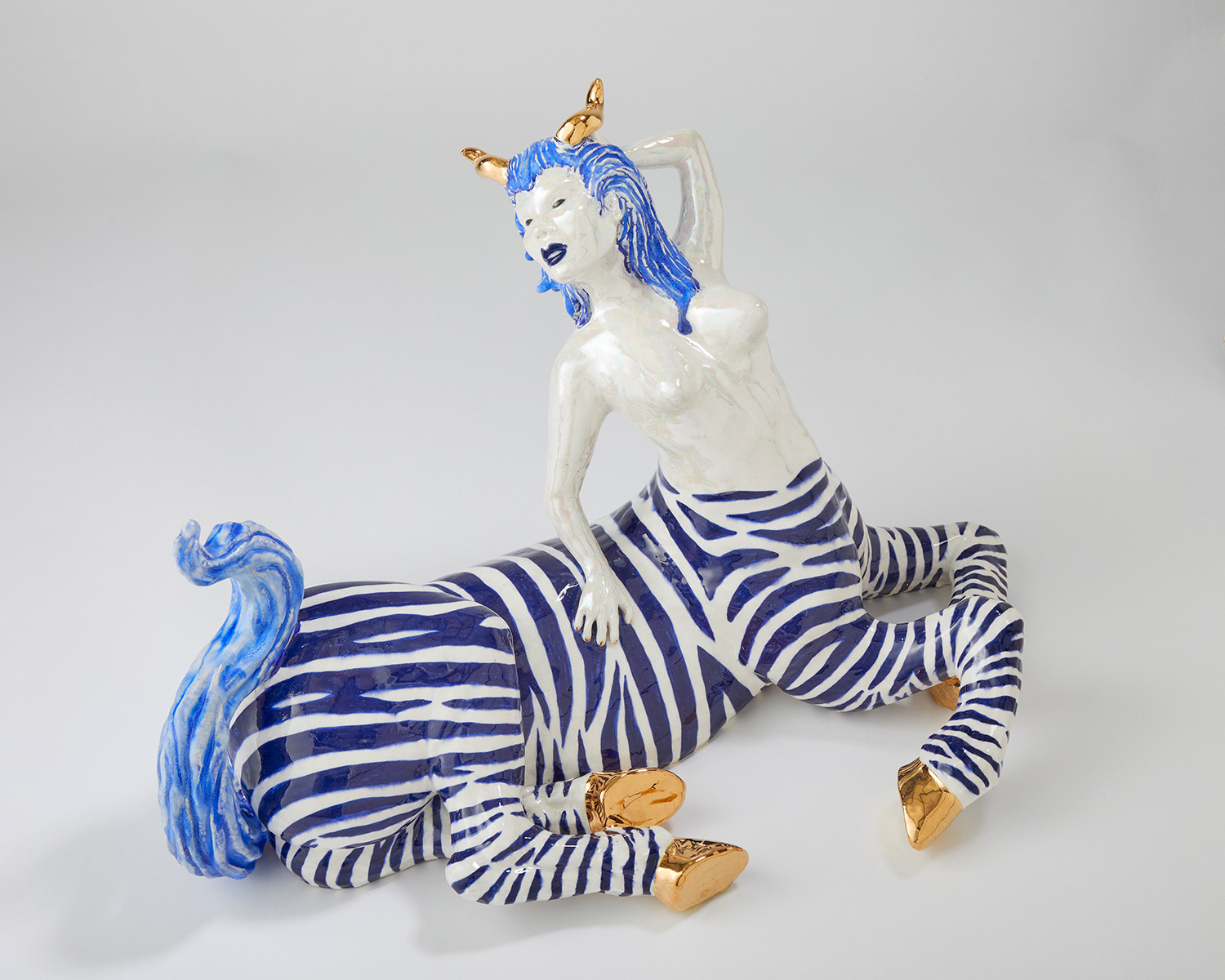 Connie The Centaur, 2022, ceramic, underglaze, glaze, luster, 14 x 23 x 15 inches, 36 x 58 x 58 cm