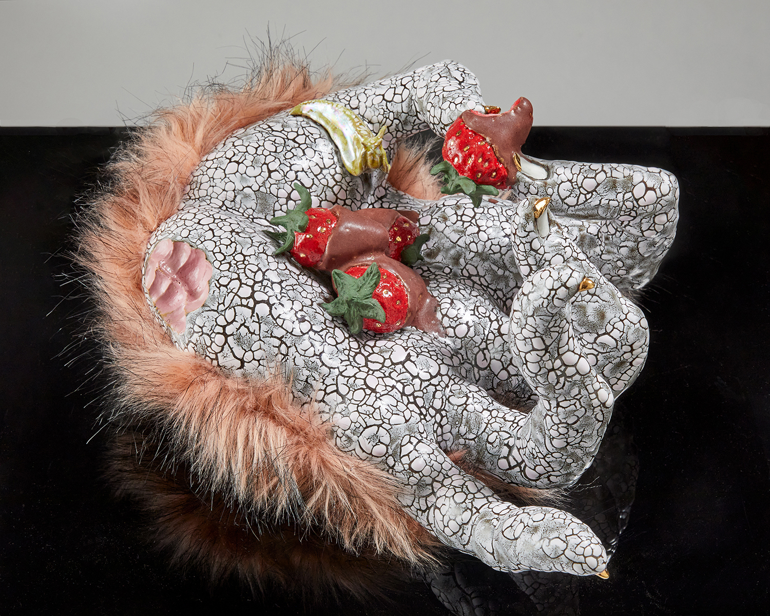 Love Curse, 2022, ceramic, glaze, luster, fake fur, 7 x 13 x 11 inches, 18 x 33 x 28 cm