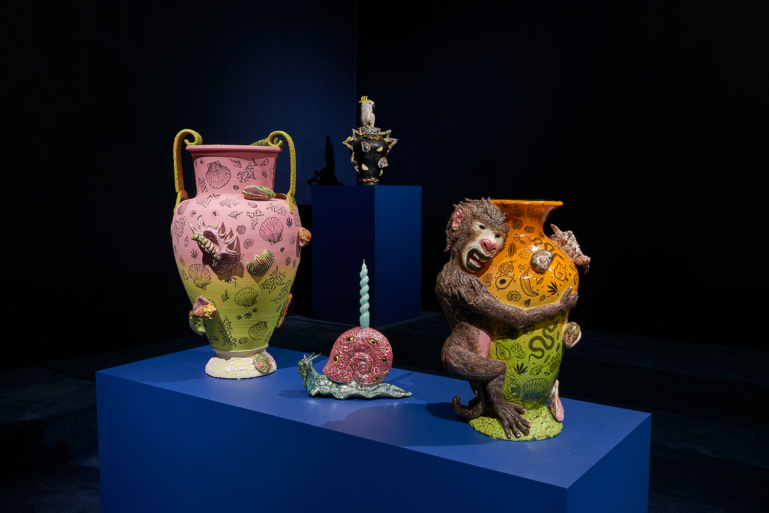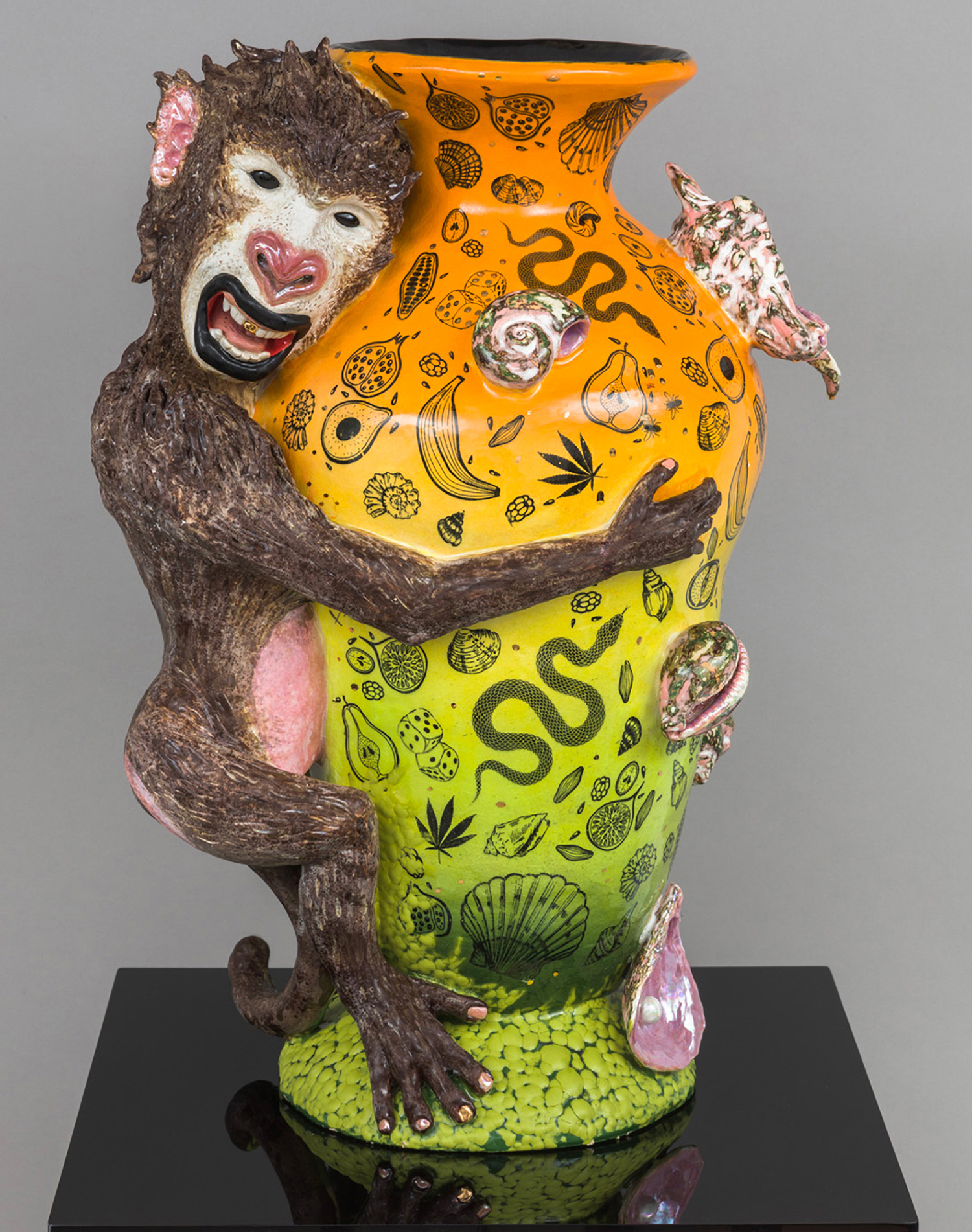 Monkey Vase, 2022, ceramic, underglaze, glaze, luster, 21 x 15 x 11 inches, 53 x 38 x 28 cm