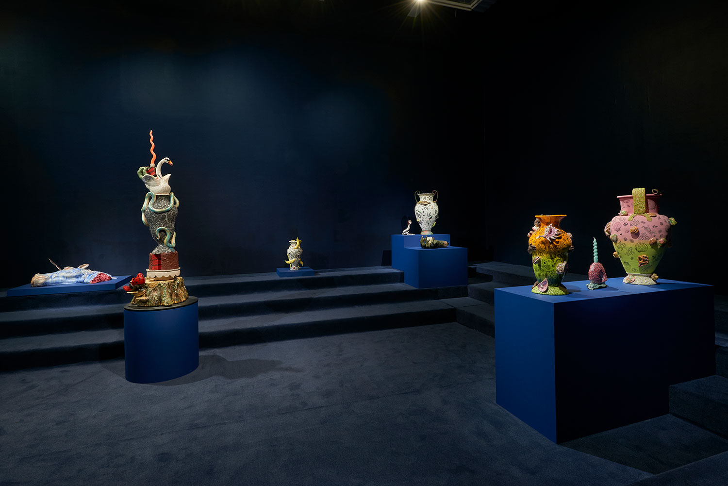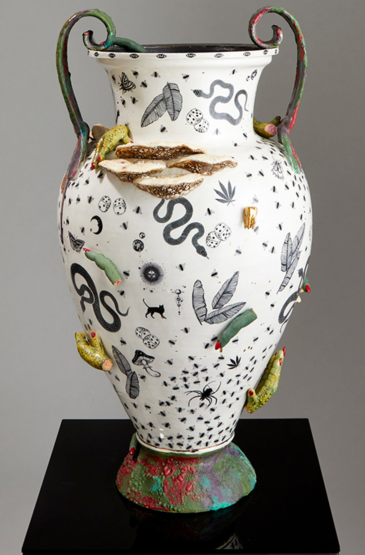 Aphrodisiac Amphora, 2022, ceramic, glaze, underglaze, luster, epoxy, 29 x 16 x 16 inches, 74 x 36 x 36 cm