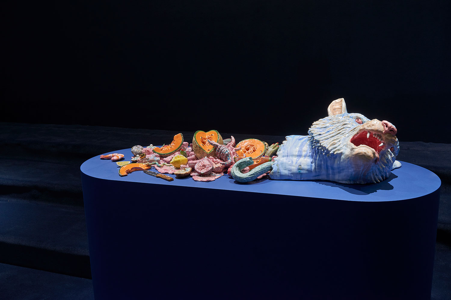 Tiger Head Cornucopia (Fuck Yeah!), 2022, ceramic, glaze, underglaze, luster, epoxy, 10 x 52 x 18 inches, 45 x 152 x 33 cm