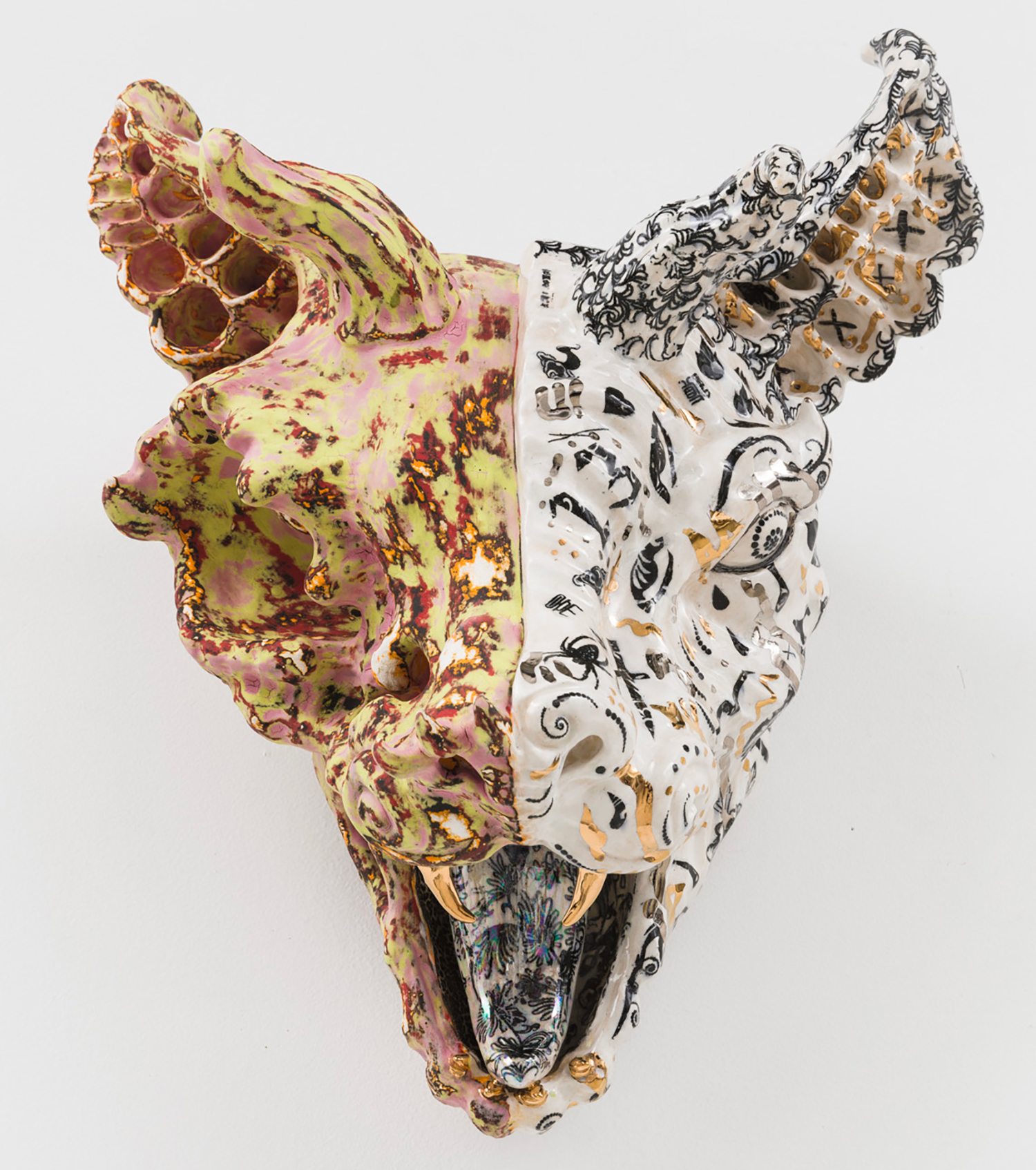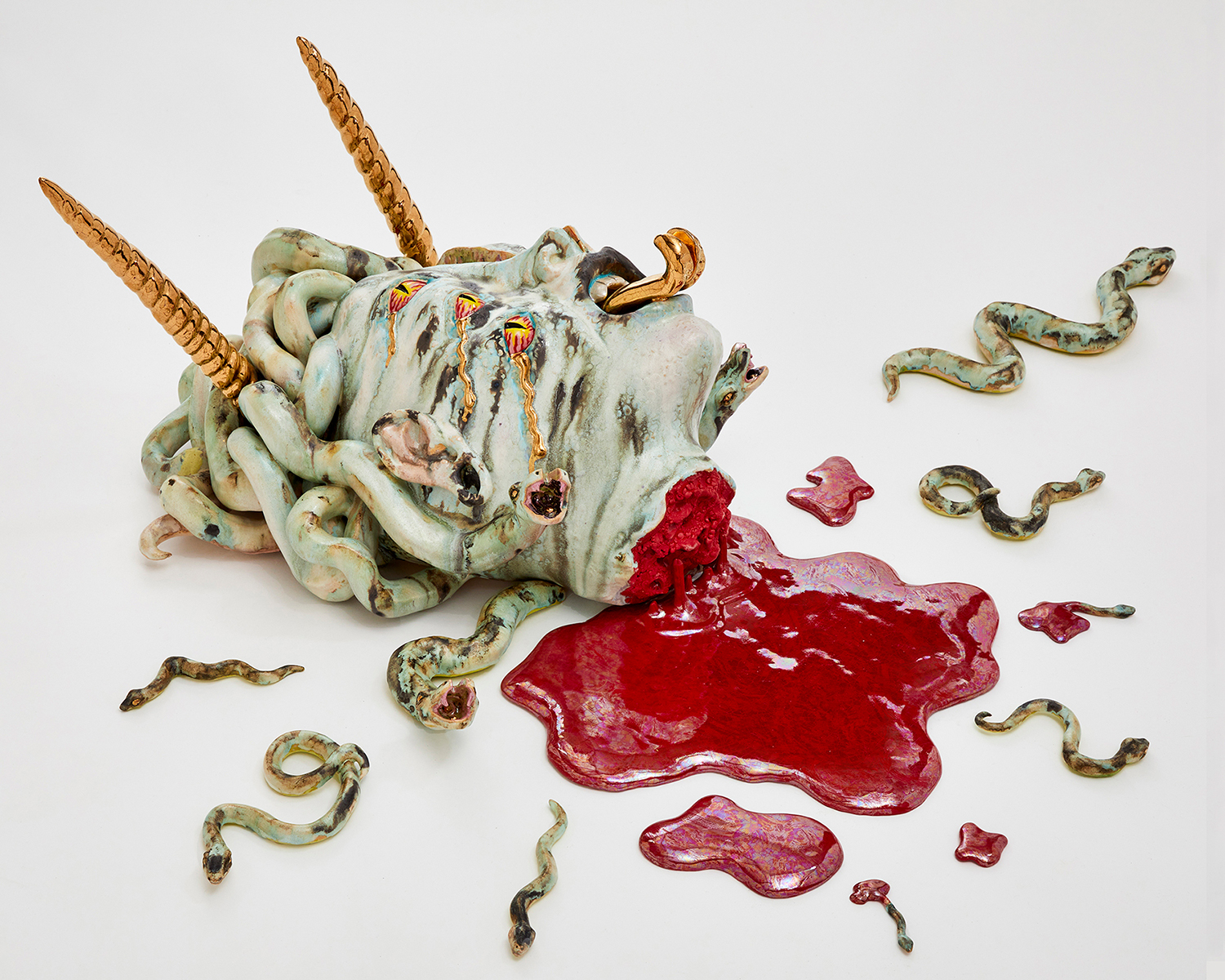 The title prepares us for entry; a pop cultural nod to a lyric from Nirvana’s “In Bloom,” followed by a polite description indicating, in this case, that we will both laugh and weep. Jackson uses the classical form of the stoic amphora vase and applies her contemporary riotous spin, adorning and therefore animating the sculptures with surprises such as ceramic sea shells, chicken feet, and shelf fungus. Her provocative decapitated head sculptures include a medusa, a unicorn and a severed tiger head morphing into a cornucopia. Stand alone characters include a snake lady, a zebra centaur, and new iterations of her signature beastly paws offering tempting, albeit possibly dangerous, treats such as strawberries freshly dipped in chocolate. All of the work brings to mind the powerful words of poet Carmen Giménez Smith in her poem Fragments From the Confessions, “Decoupage the jar with mouths, cut from Cosmo, mister death, fill it with our minstrel blood, or the placenta from our collective lacunae, grow lascivious magnolias in it, heavy lipped and lush with pollen, the jar houses my illusions, of eating men like hairballs.”