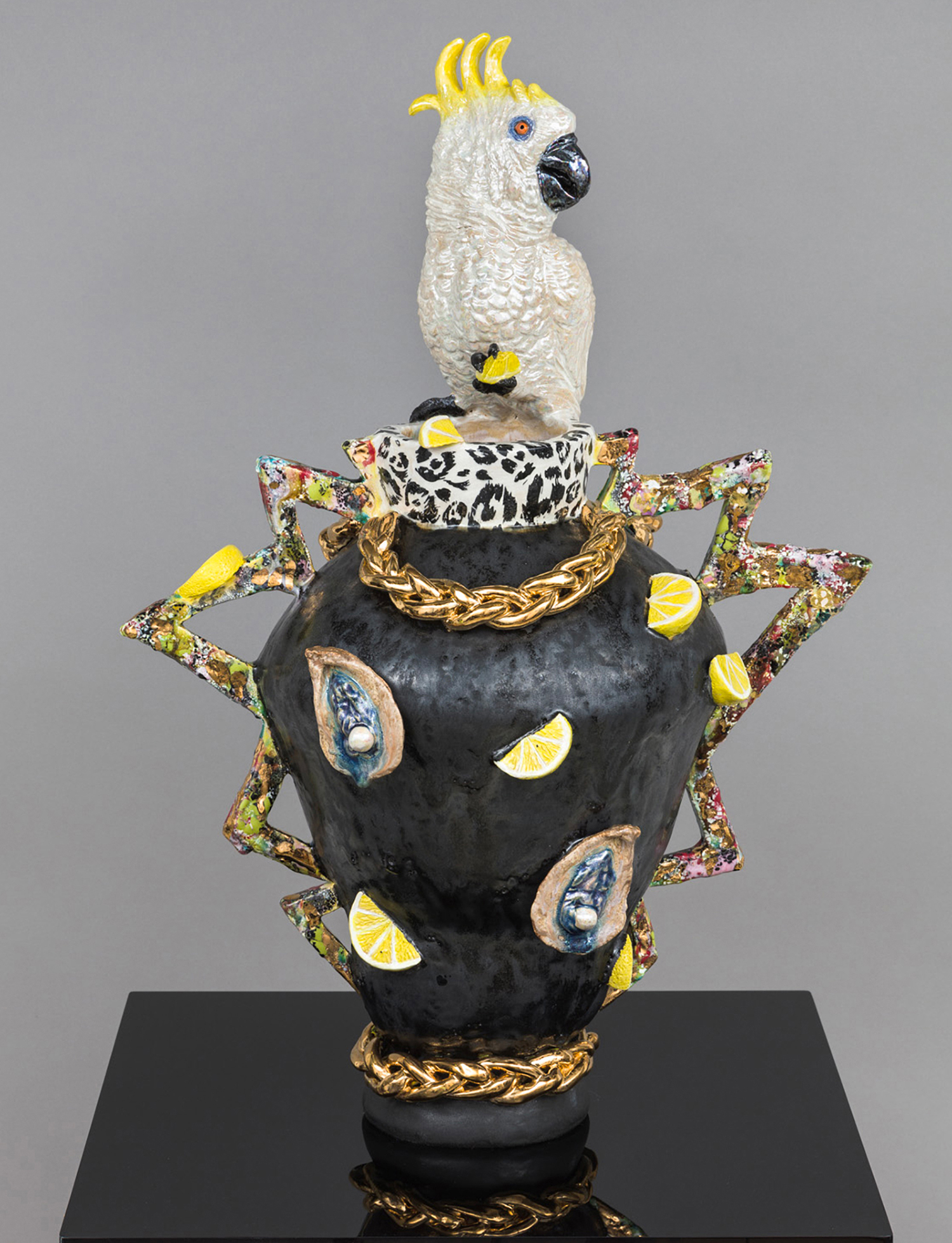 Cockatoo Vase, 2022, ceramic, underglaze, glaze, luster, 23 x 15.5 x 10 inches, 58 x 39 x 25 cm
