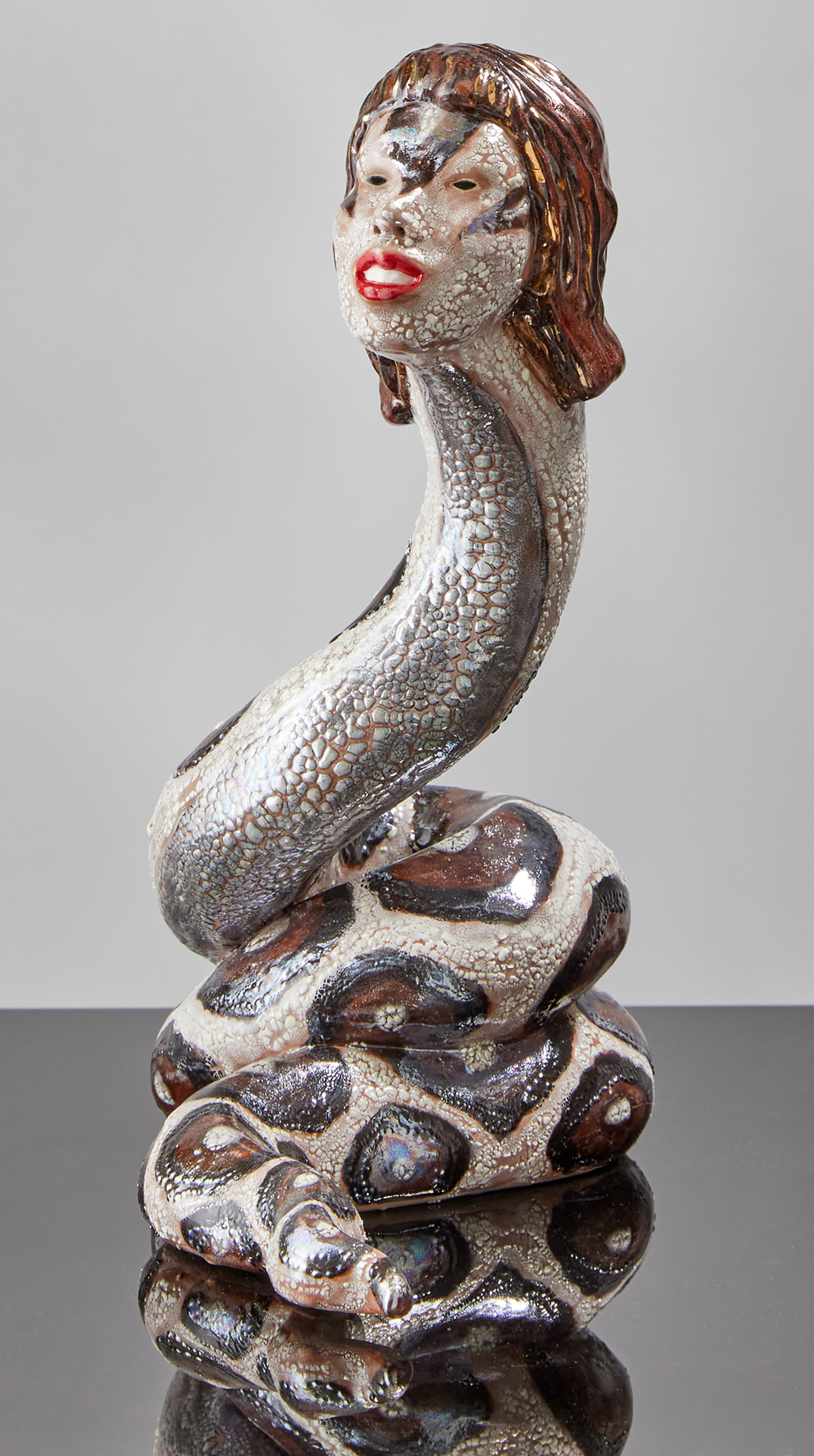 Snake Lady, 2022, ceramic, glaze, underglaze, luster, 9.5 x 9 x 4.5 inches, 24 x 23 x 11 cm