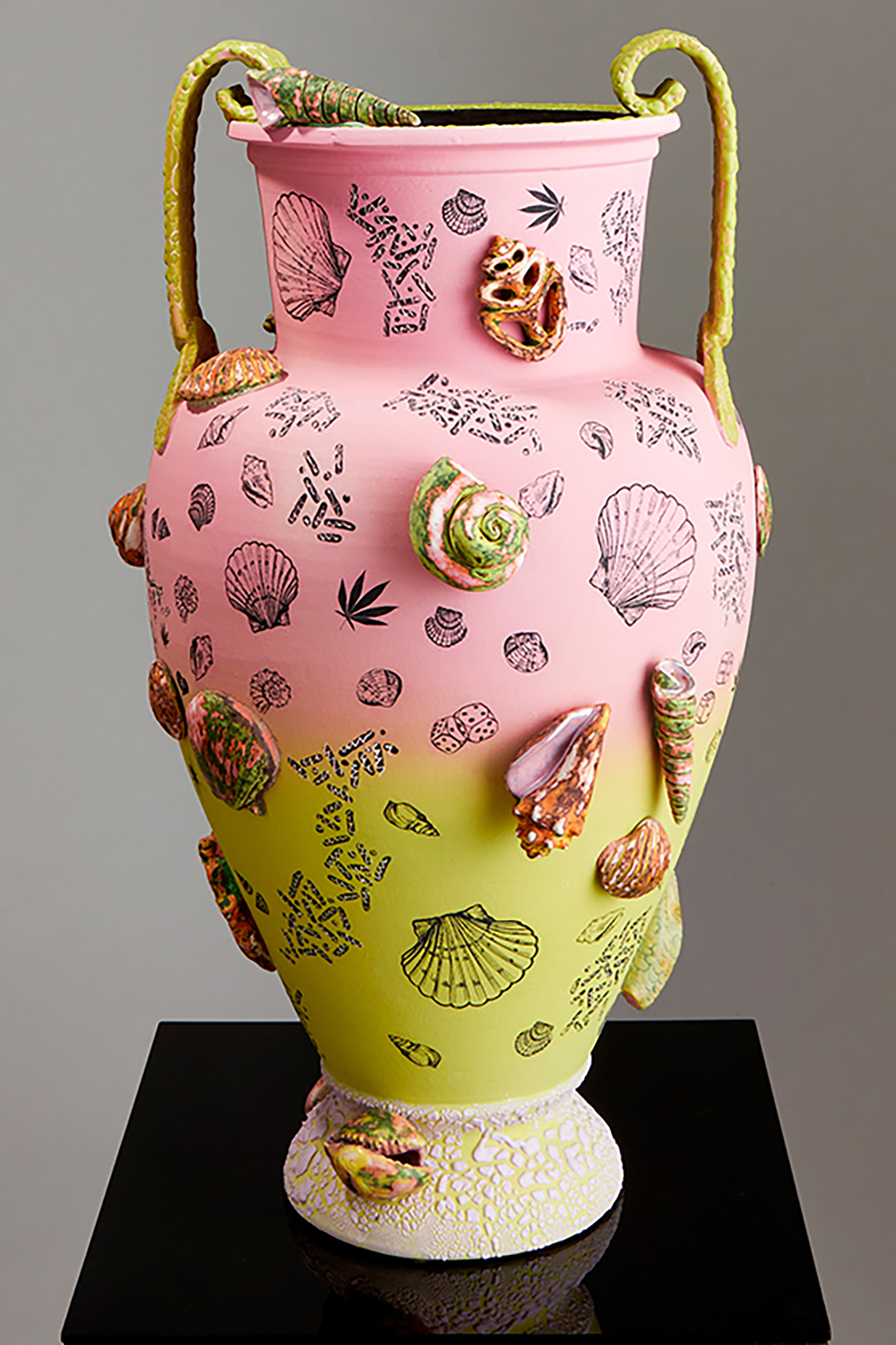 Surf Punk Shell Amphora, 2022, ceramic, glaze, underglaze, luster, gold leaf, epoxy, 29 x 14 x 14 inches, 74 x 36 x 36 cm