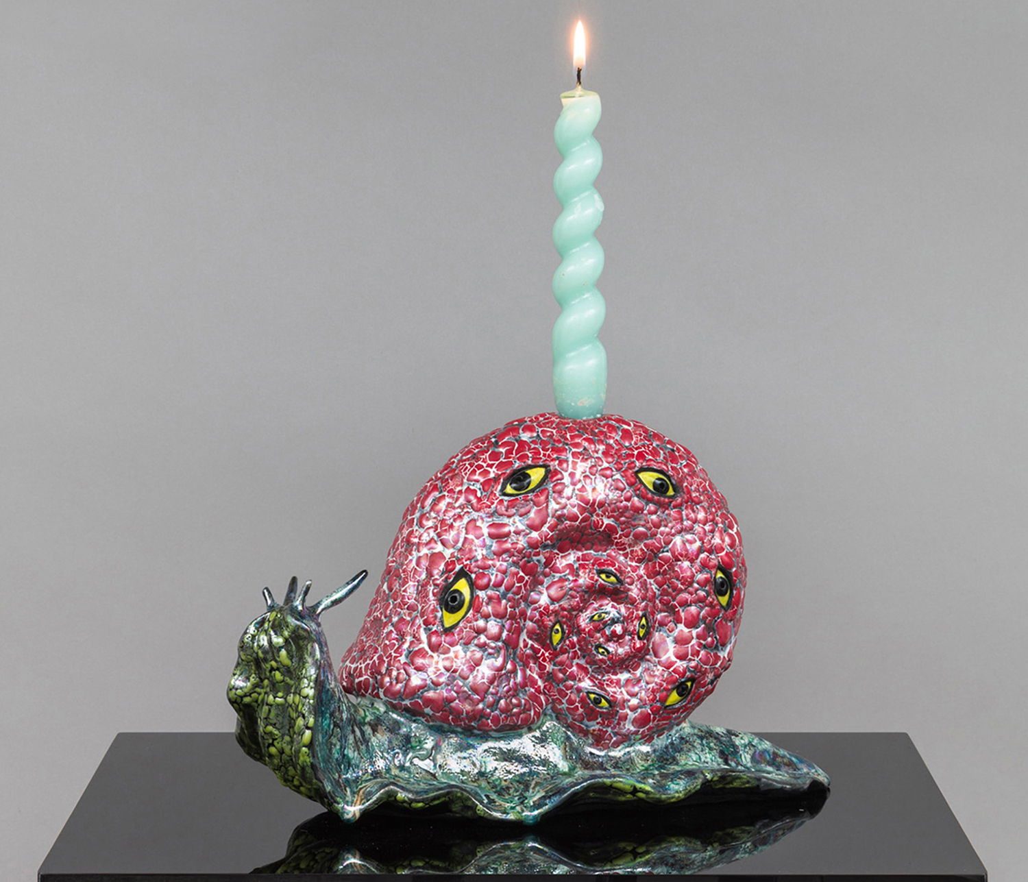 All Seeing Snail Candle Holder (Yellow Eyed), 2022, ceramic, underglaze, glaze, luster, candle, 7.5 x 12 x 4.5 inches, 19 x 31 x 11 cm