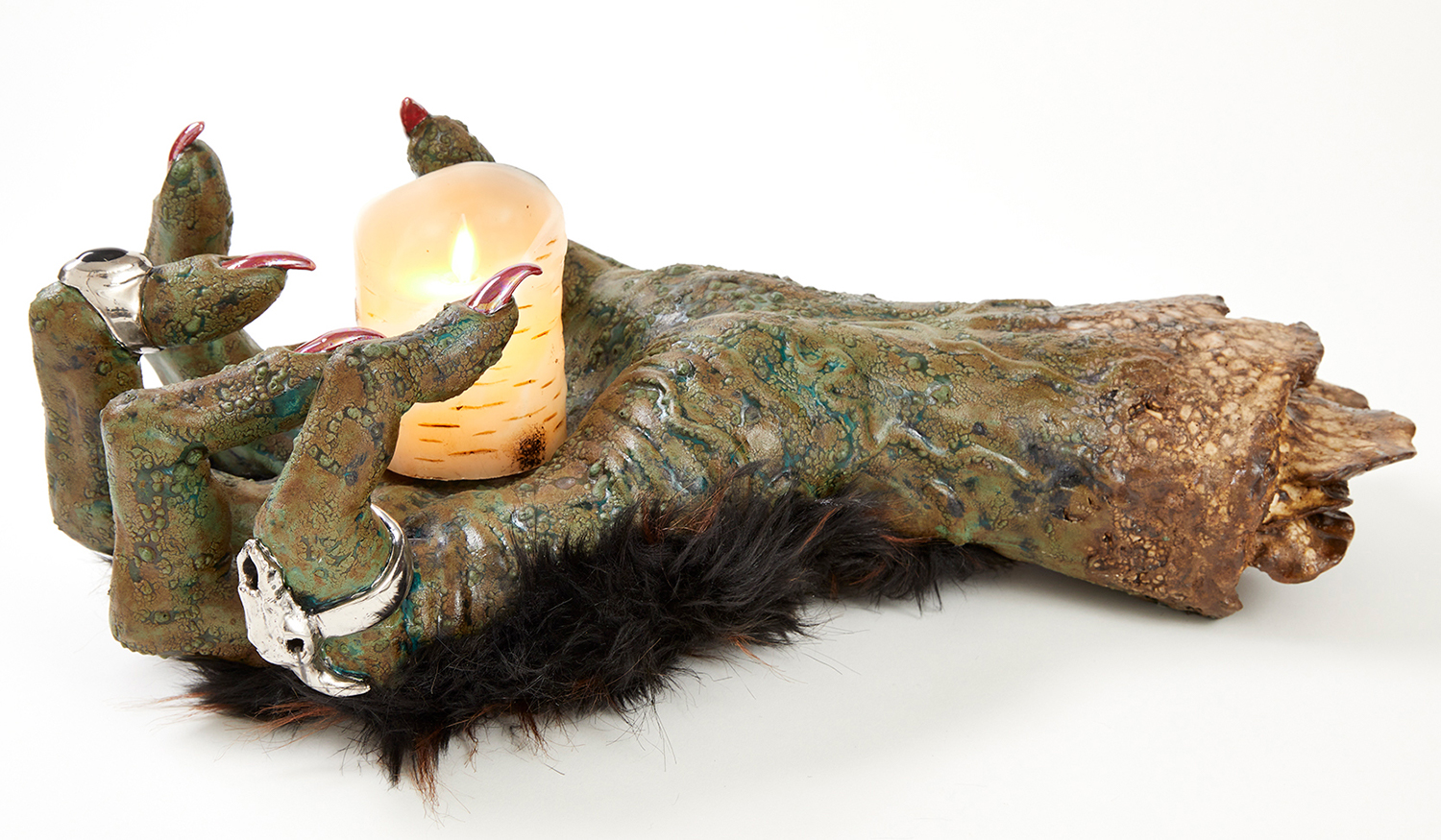 Sorceress’s Light, 2022, ceramic, glaze, underglaze, luster, fake fur, candle, batteries, 8 x 22 x 11 inches, 19 x 56 x 25 cm