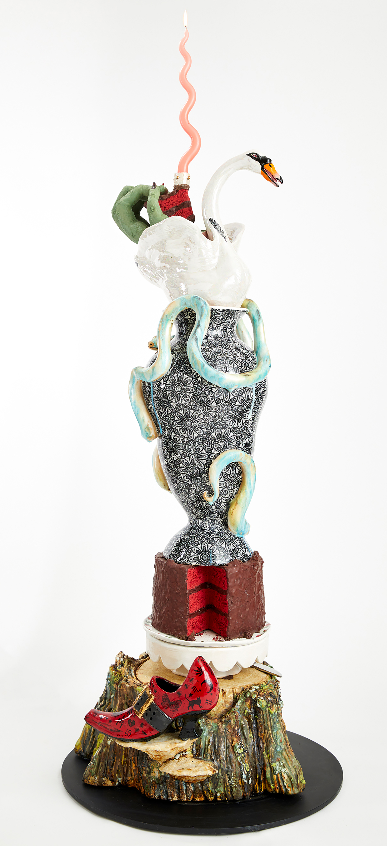 Red Velvet Candle Holder, 2022, ceramic, glaze, underglaze, ceramic decals, luster, lace nails, metal stand, epoxy, 64 x 21 x 21 inches, 163 x 53 x 52 cm
