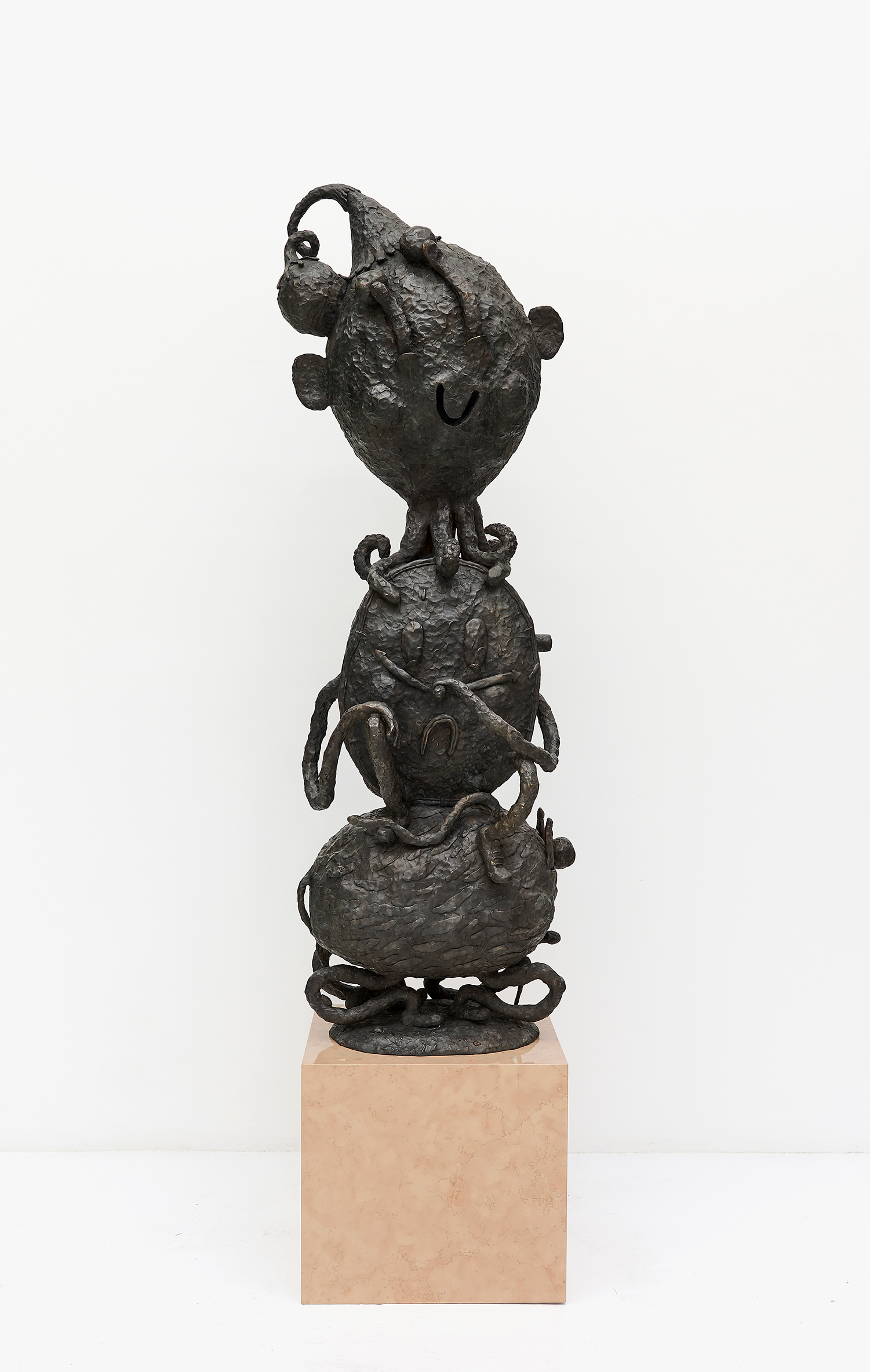 Joakim Ojanen, Climb Up Here Guys, the View is Way Better!, 2021, bronze, marble, Sculpture: 76 x 26 x 20 inches, 194 x 67 x 50 cm, Marble pedestal: 19.5 x 21.5 x 18 inches, 50 x 55 x 45 cm