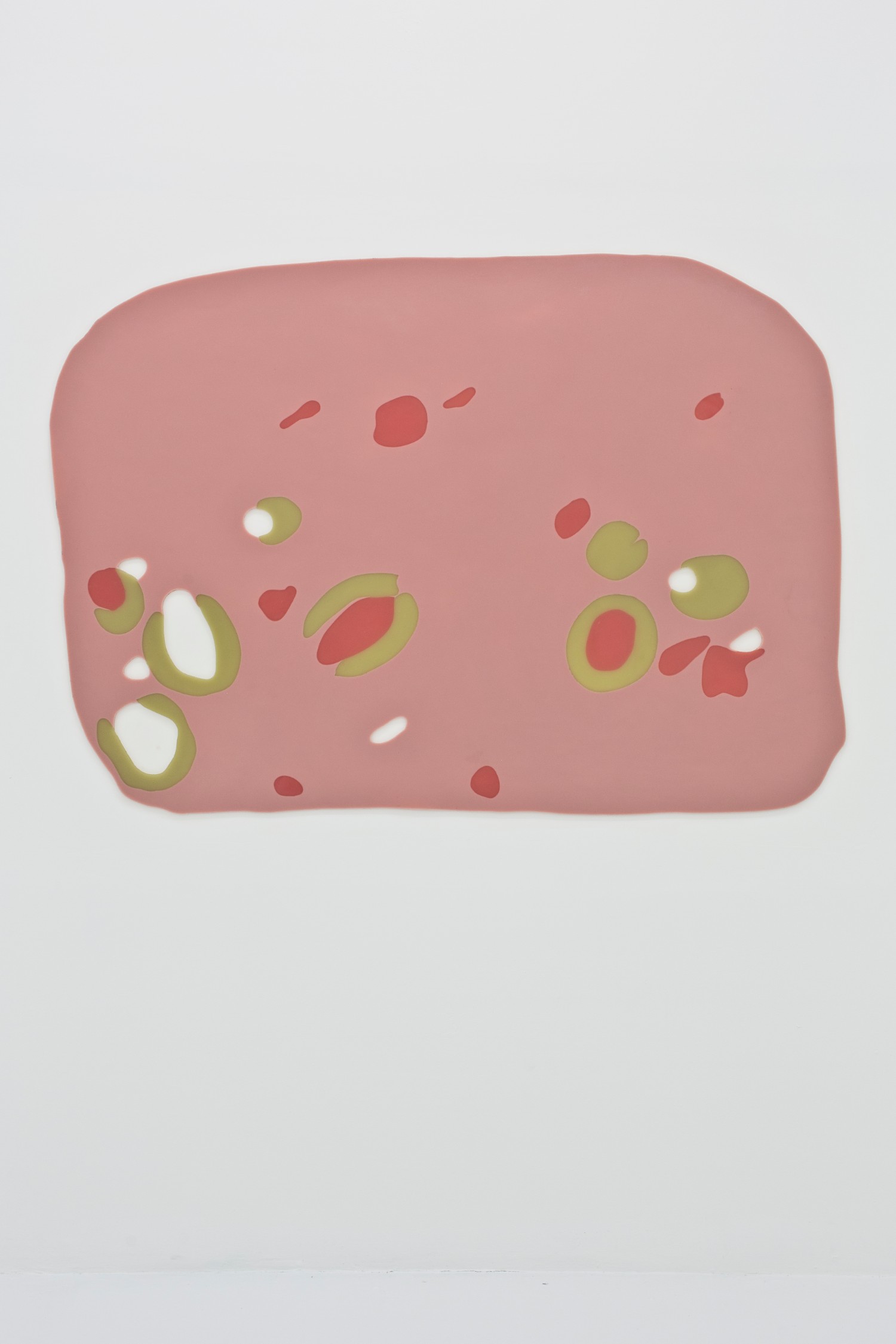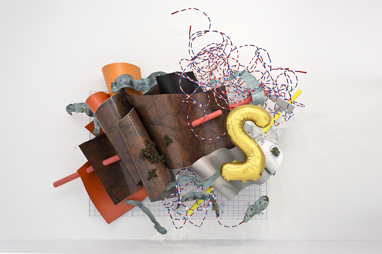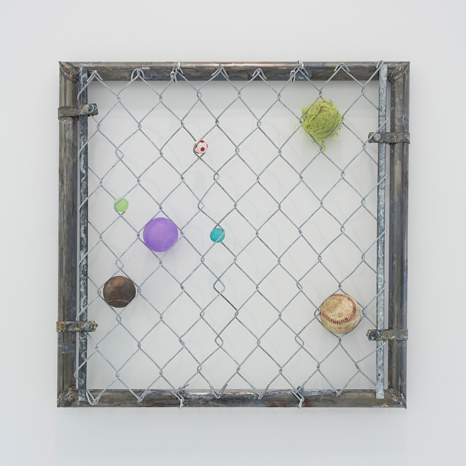 Evan Robarts uses a weathered chain link fence as his canvas and places found colored balls where he would otherwise want to apply paint. Martha Friedman casts colored rubber to make what looks like a slice of pimento loaf stuck to the wall; the rectilinear format makes us look at the pimento placement as “composition” and the scale shift from tiny to huge loaf lends itself to looking at lunchmeat as landscape.