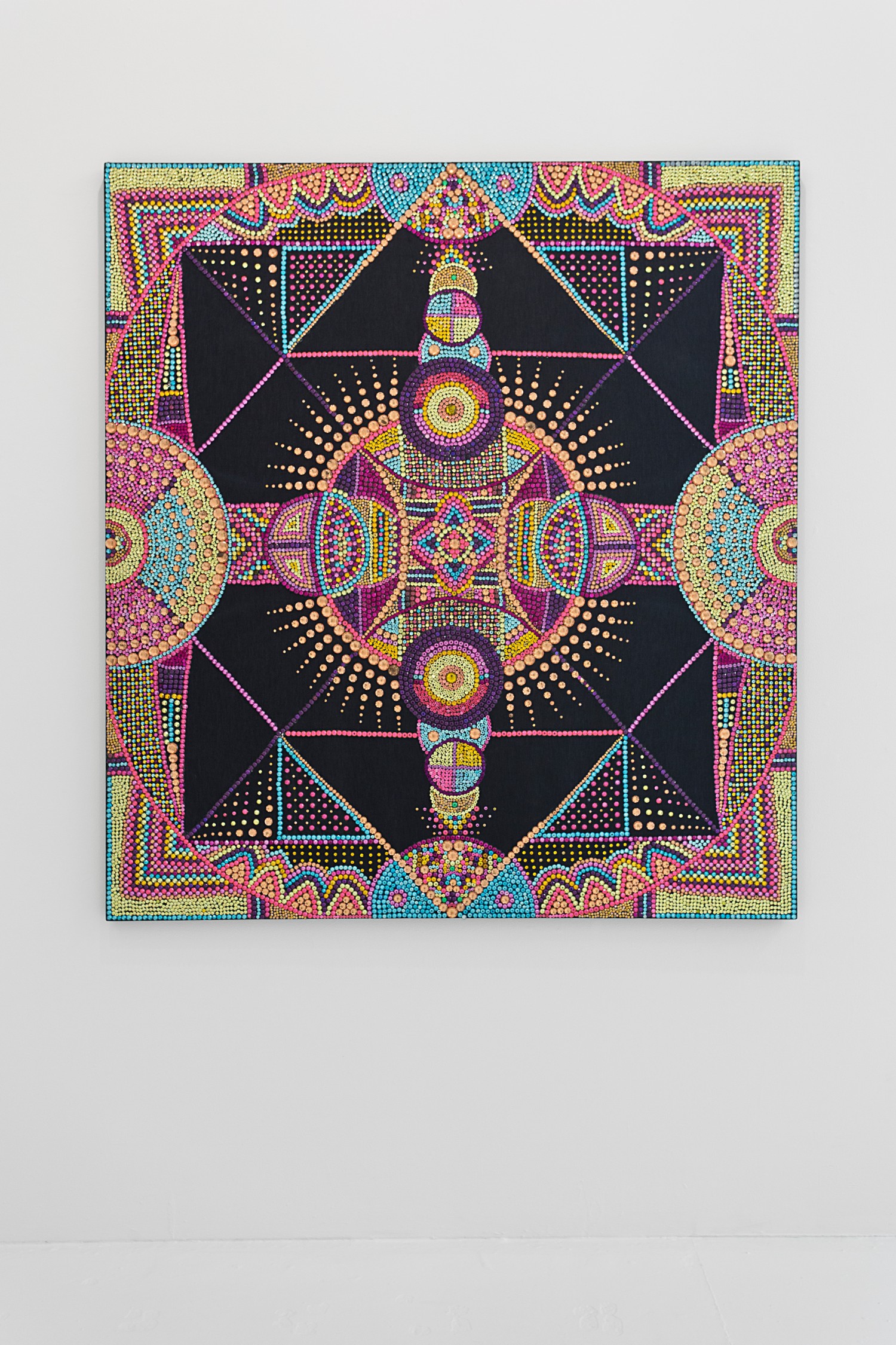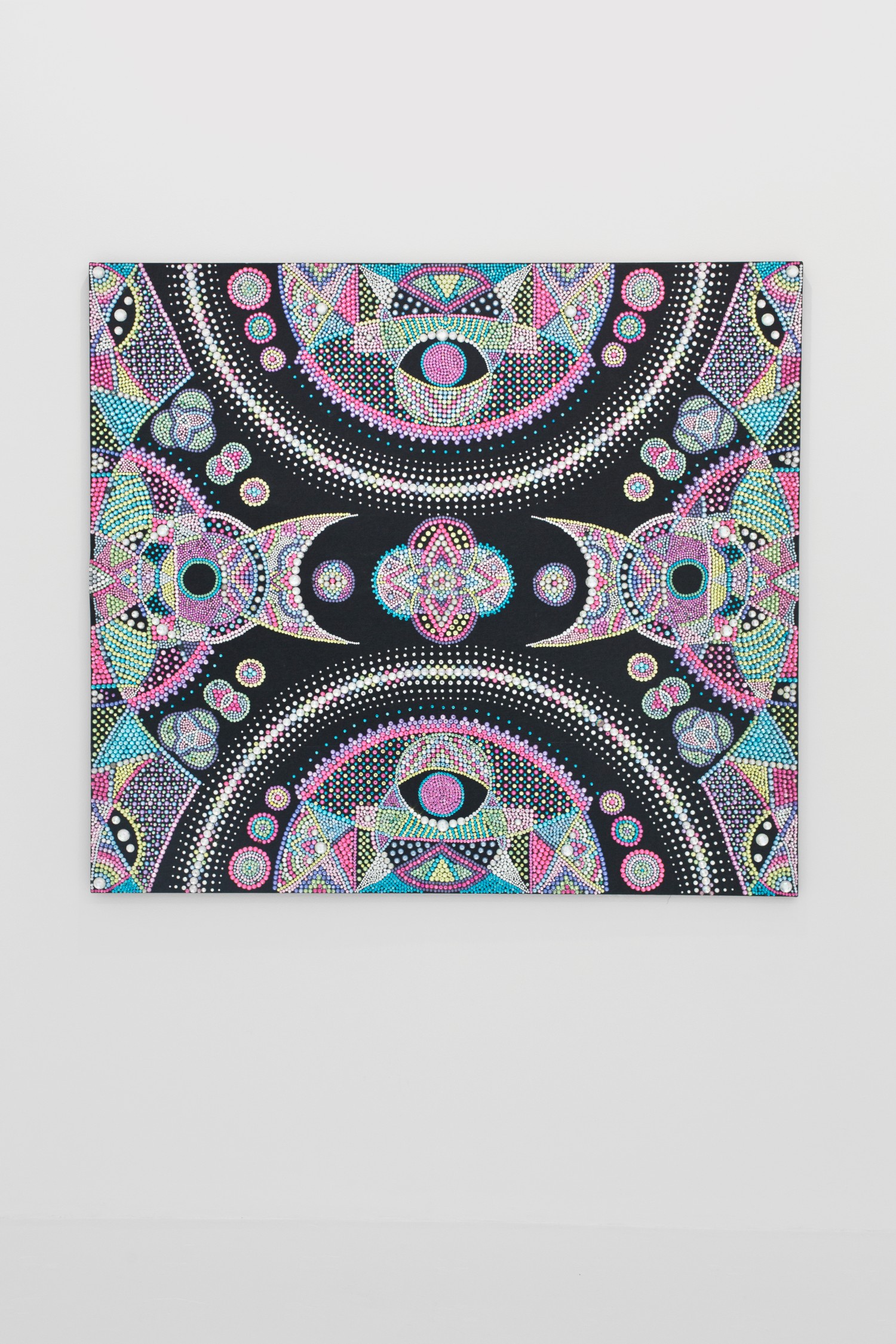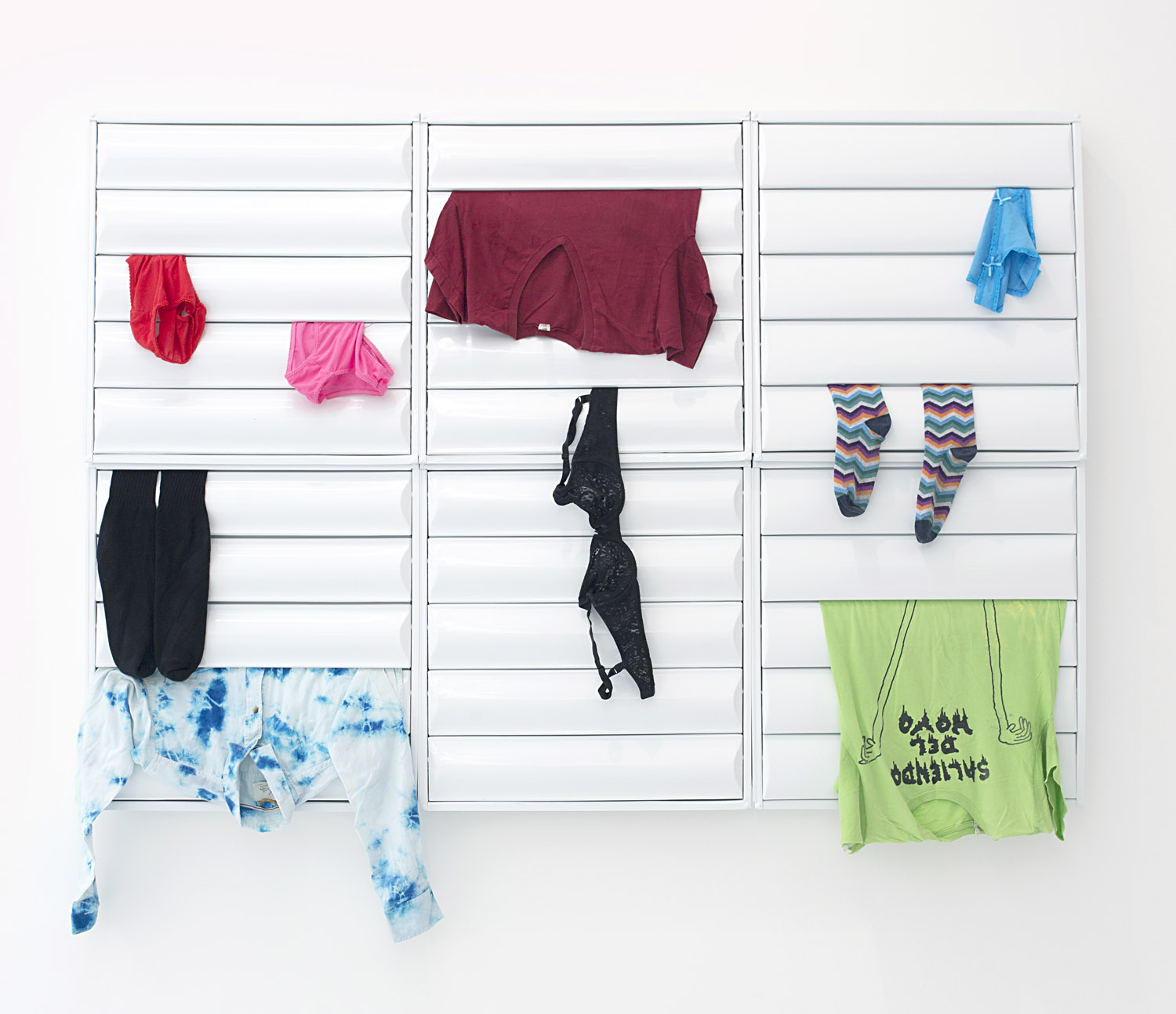 In fact all the works here tempt us to approach them and read them as paintings, but all somehow confound us. Bob Eikelboom composes his painting with magnets, Evie Falci with rhinestones, Gabriel Pionkowski woven with painted threads. Nick Theobald’s luminous compositions are created by wax and Will Stewart’s with glue. Juni Figueroa arranges clothes in a white window blind system to create a very memorable send up of “high art,” specifically abstract painting, with this “tropical readymade.”