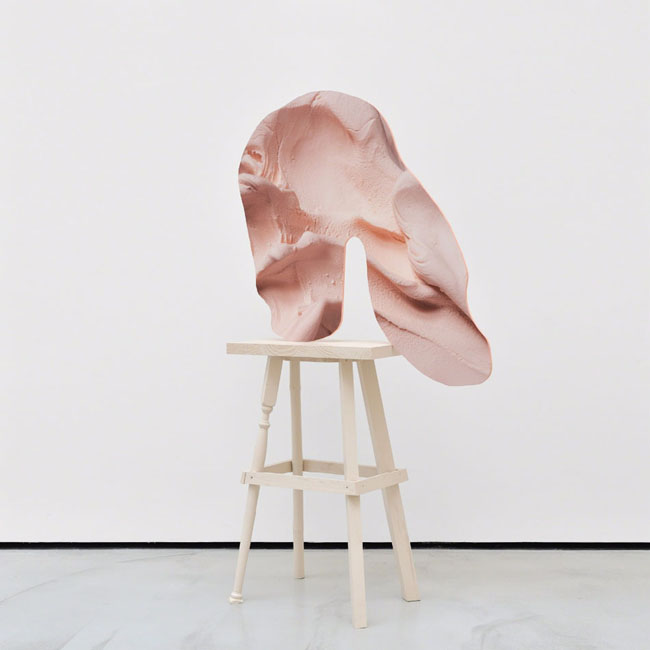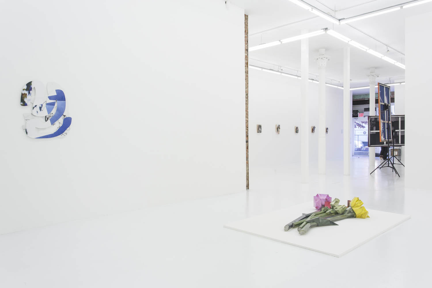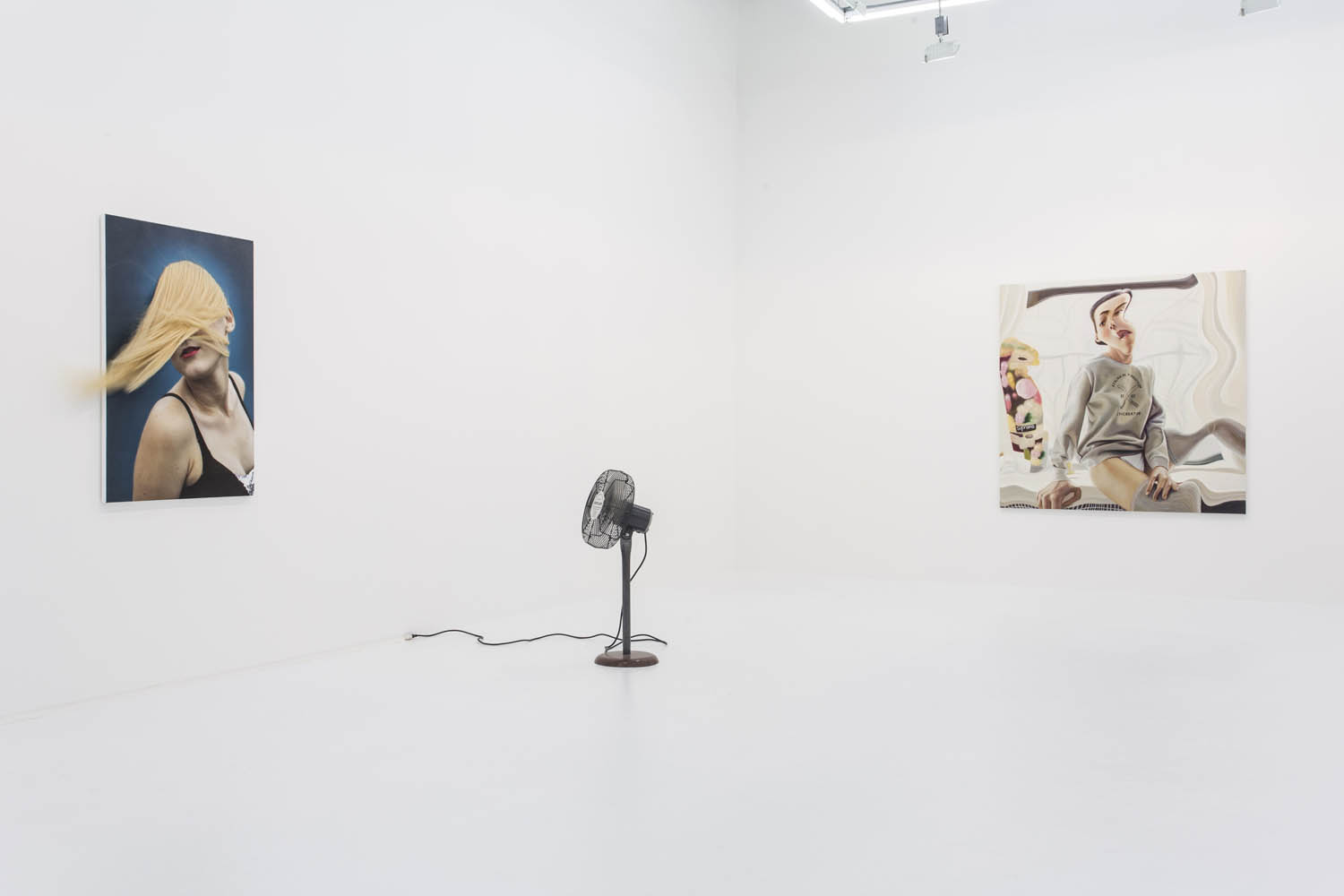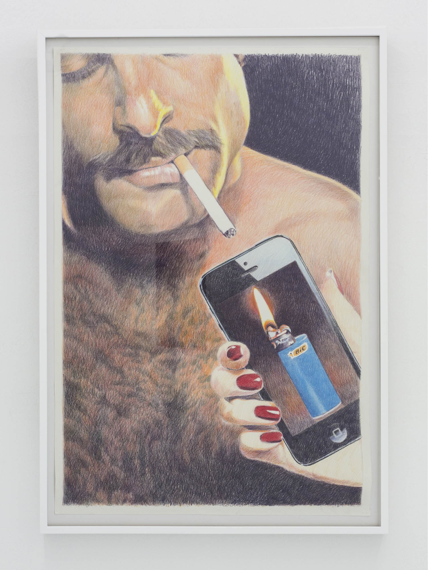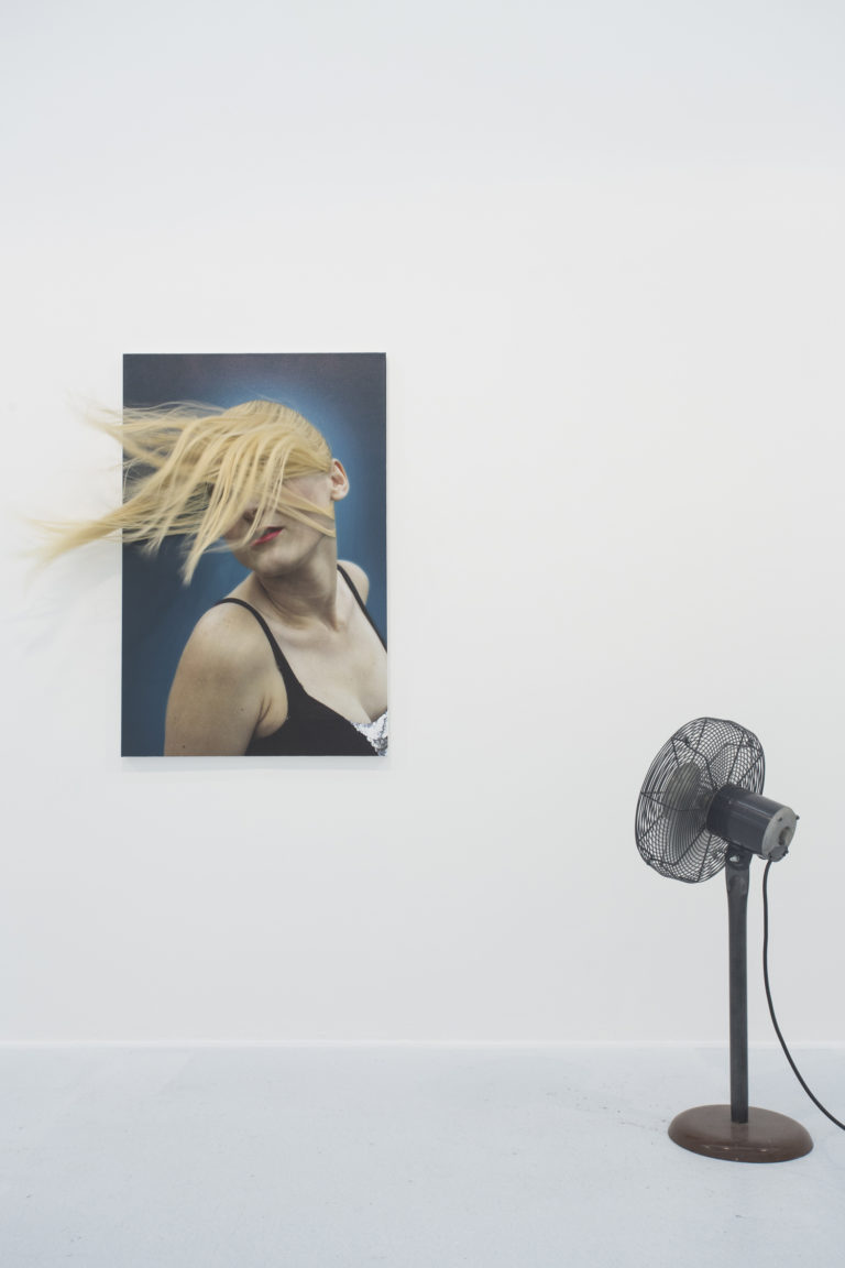 Many artists in this show have a step in their process that includes photography, but they don’t stop there. Ry David Bradley composes digitally evocative images and prints them as dye transfer onto texturized synthetic suede. The “paintings” are then installed “screenicly”, on photographic equipment like ceiling mounts, tripods or flat-screen hardware, giving the works the drama of a photo shoot. Photos become objects: Letha Wilson transfers emulsion photography onto concrete, Kate Bonner on shaped panel, Rachel de Joode onto PVC in anthropomorphic postures evocative of a disfigured Bacon perched on a stool; Kate Steciw punks up photography with hanging sculpture in dibond, plexi and hardware, while Adam Parker Smith prints a woman’s photo onto canvas and gives her a long blond human hair blowing in an electric fan breeze. The photograph is not a window into anything, not a record of anything, not the point; as in Eric Yahnker’s work pictured above, the photo is absurdly no longer tied to the thing itself, a digital image of a lighter produces no heat.