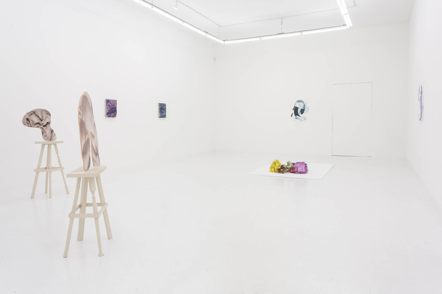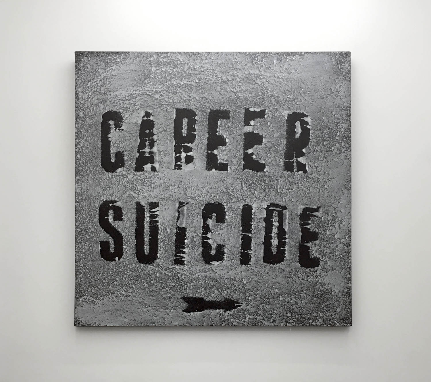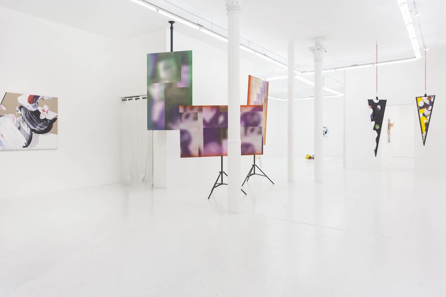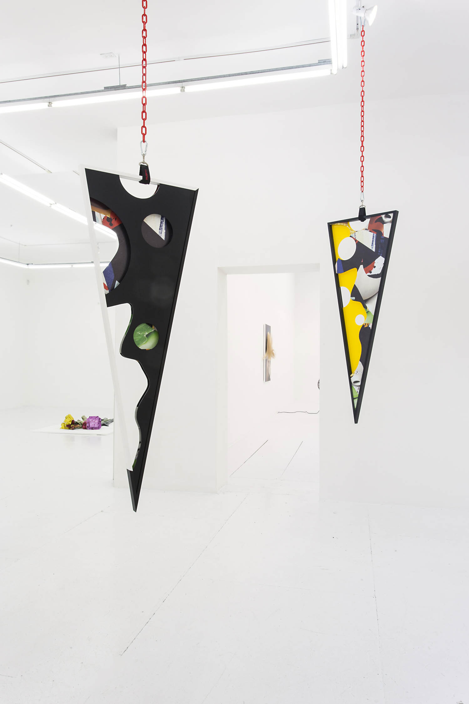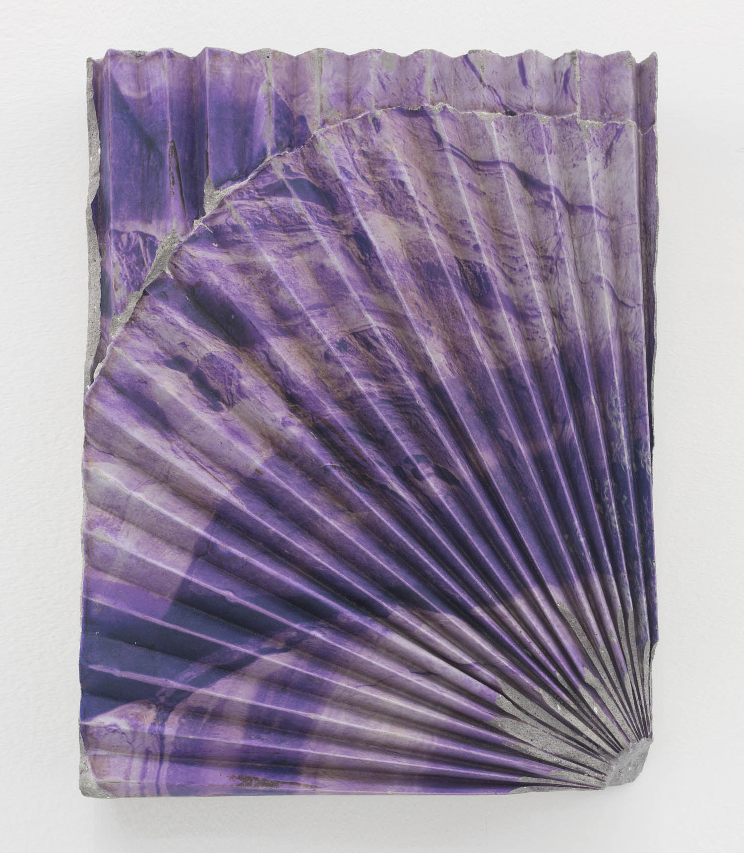Many artists in this show have a step in their process that includes photography, but they don’t stop there. Ry David Bradley composes digitally evocative images and prints them as dye transfer onto texturized synthetic suede. The “paintings” are then installed “screenicly”, on photographic equipment like ceiling mounts, tripods or flat-screen hardware, giving the works the drama of a photo shoot. Photos become objects: Letha Wilson transfers emulsion photography onto concrete, Kate Bonner on shaped panel, Rachel de Joode onto PVC in anthropomorphic postures evocative of a disfigured Bacon perched on a stool; Kate Steciw punks up photography with hanging sculpture in dibond, plexi and hardware, while Adam Parker Smith prints a woman’s photo onto canvas and gives her a long blond human hair blowing in an electric fan breeze. The photograph is not a window into anything, not a record of anything, not the point; as in Eric Yahnker’s work pictured above, the photo is absurdly no longer tied to the thing itself, a digital image of a lighter produces no heat.