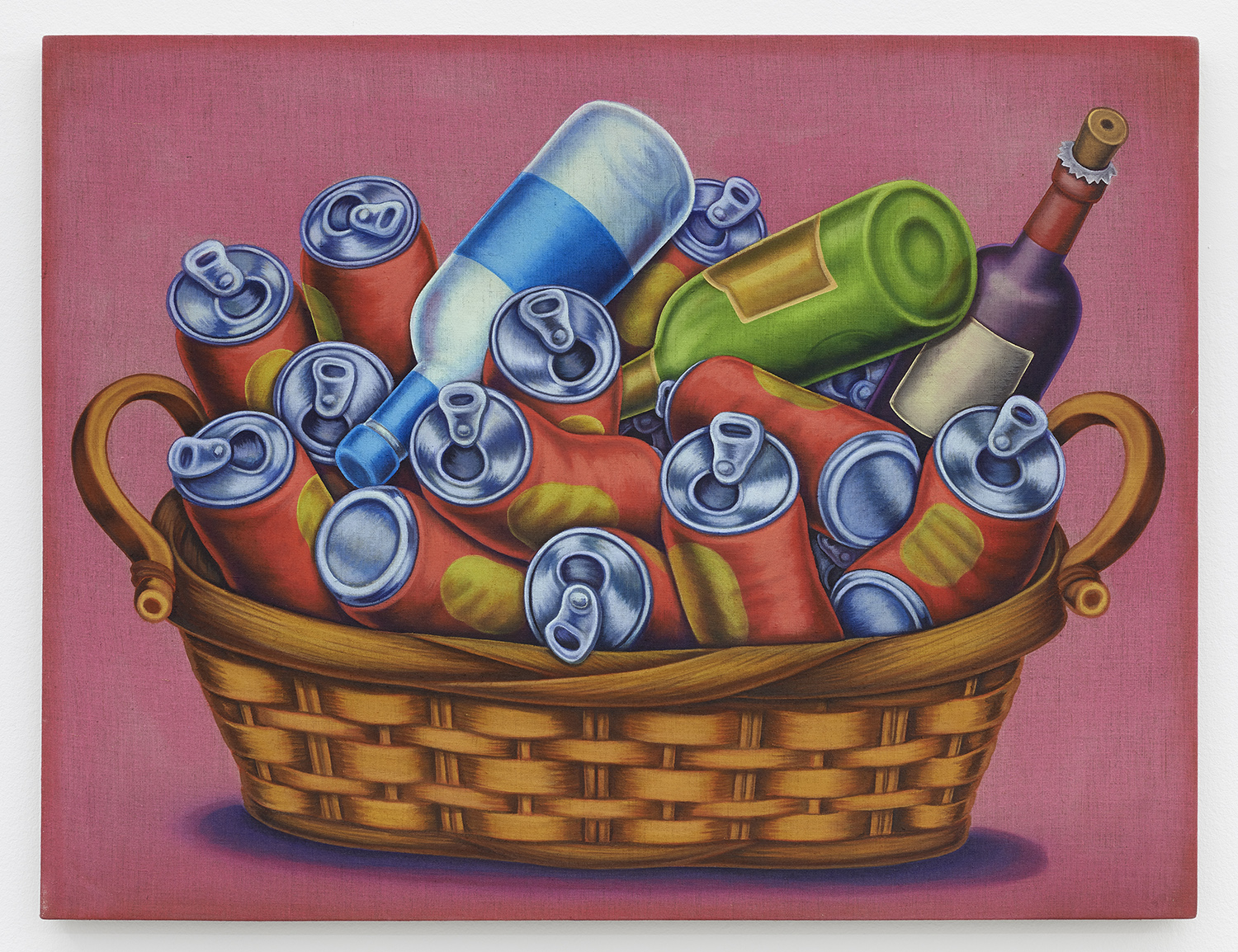 Basket With Bottles And Cans, 2020, Textile paint on linen, 32 x 42 inches, 81 x 107 cm