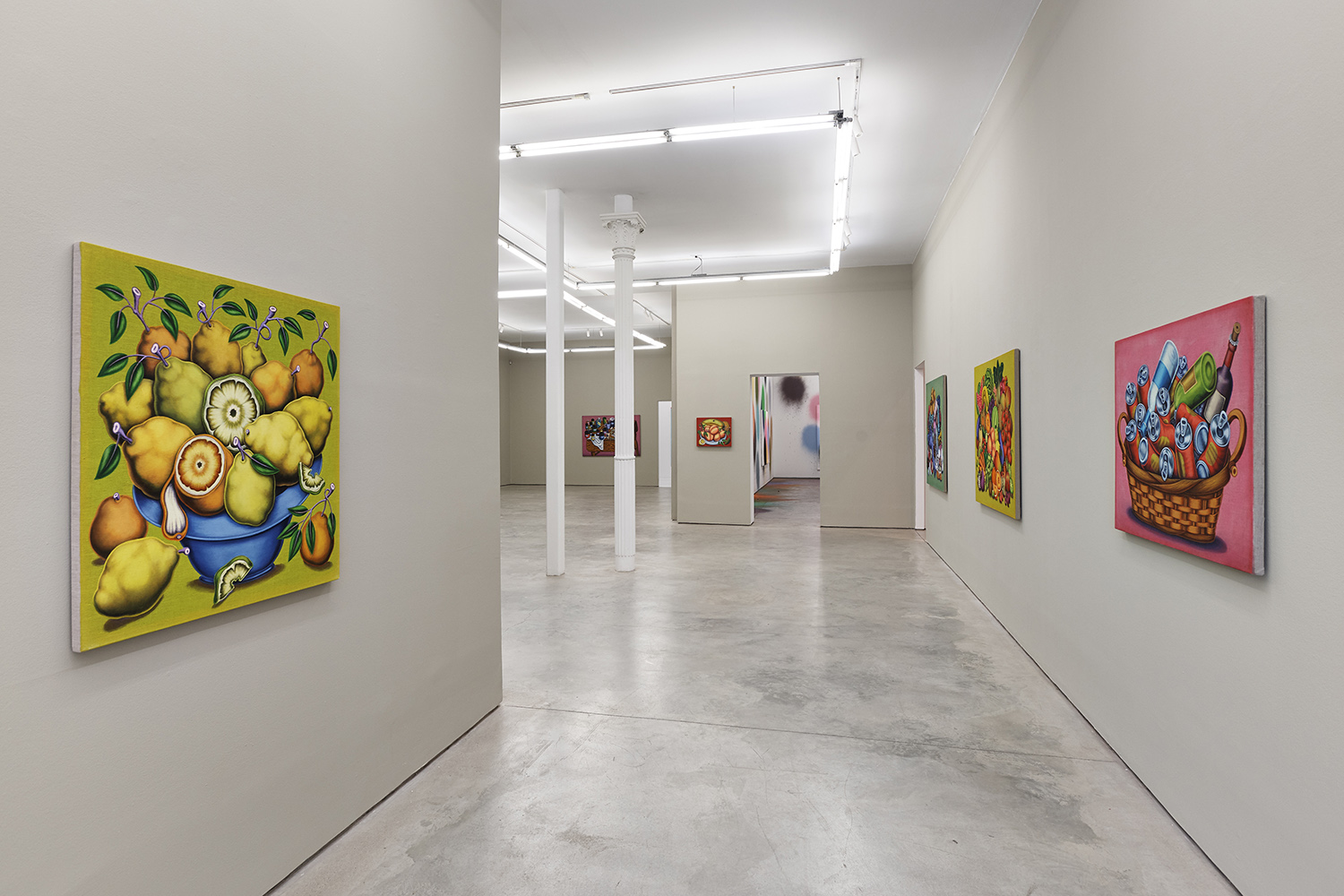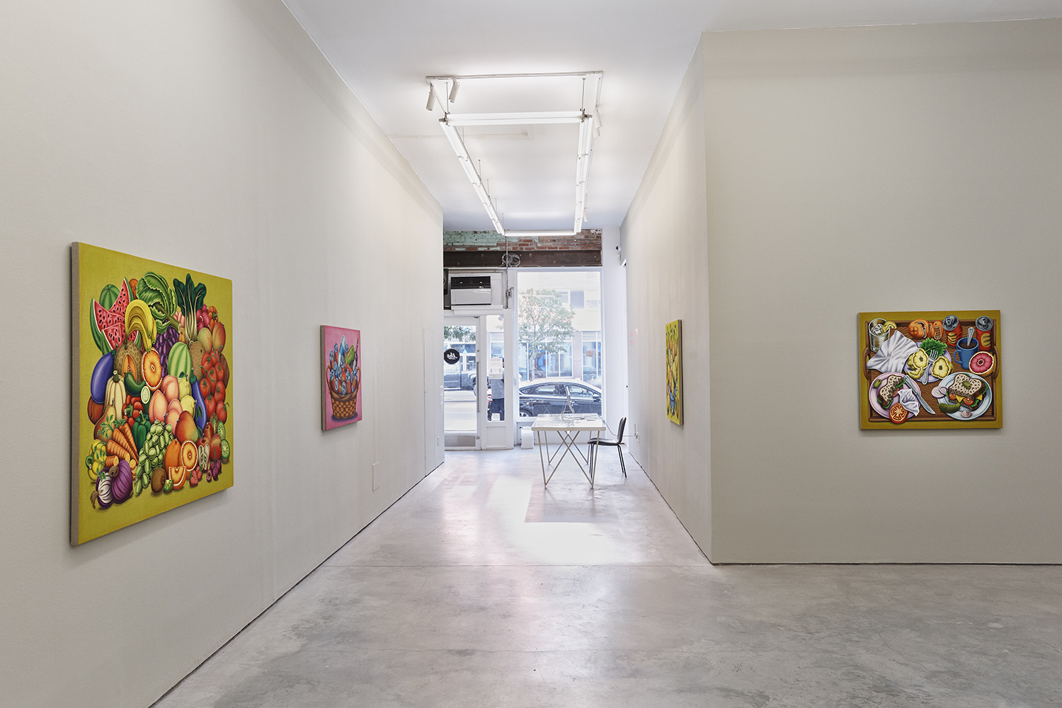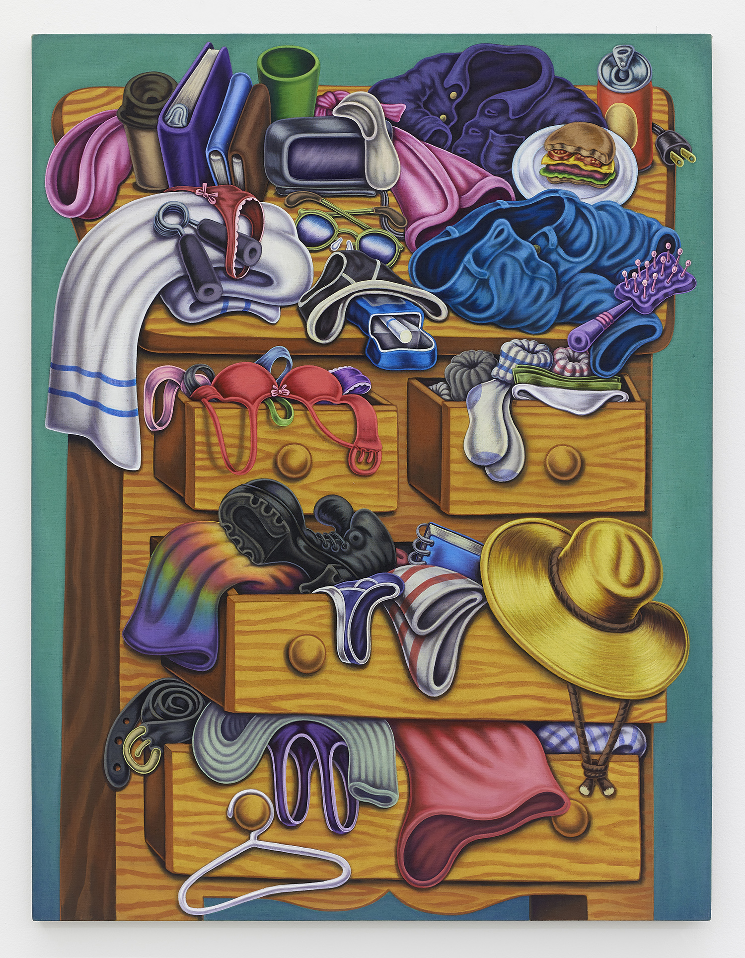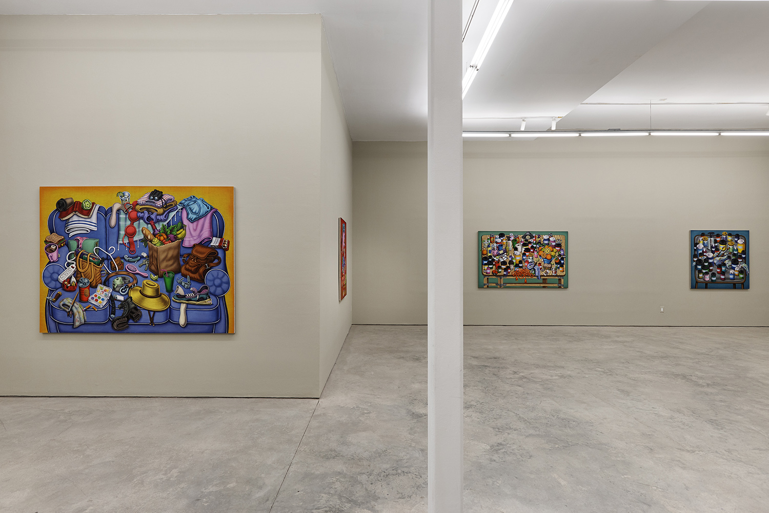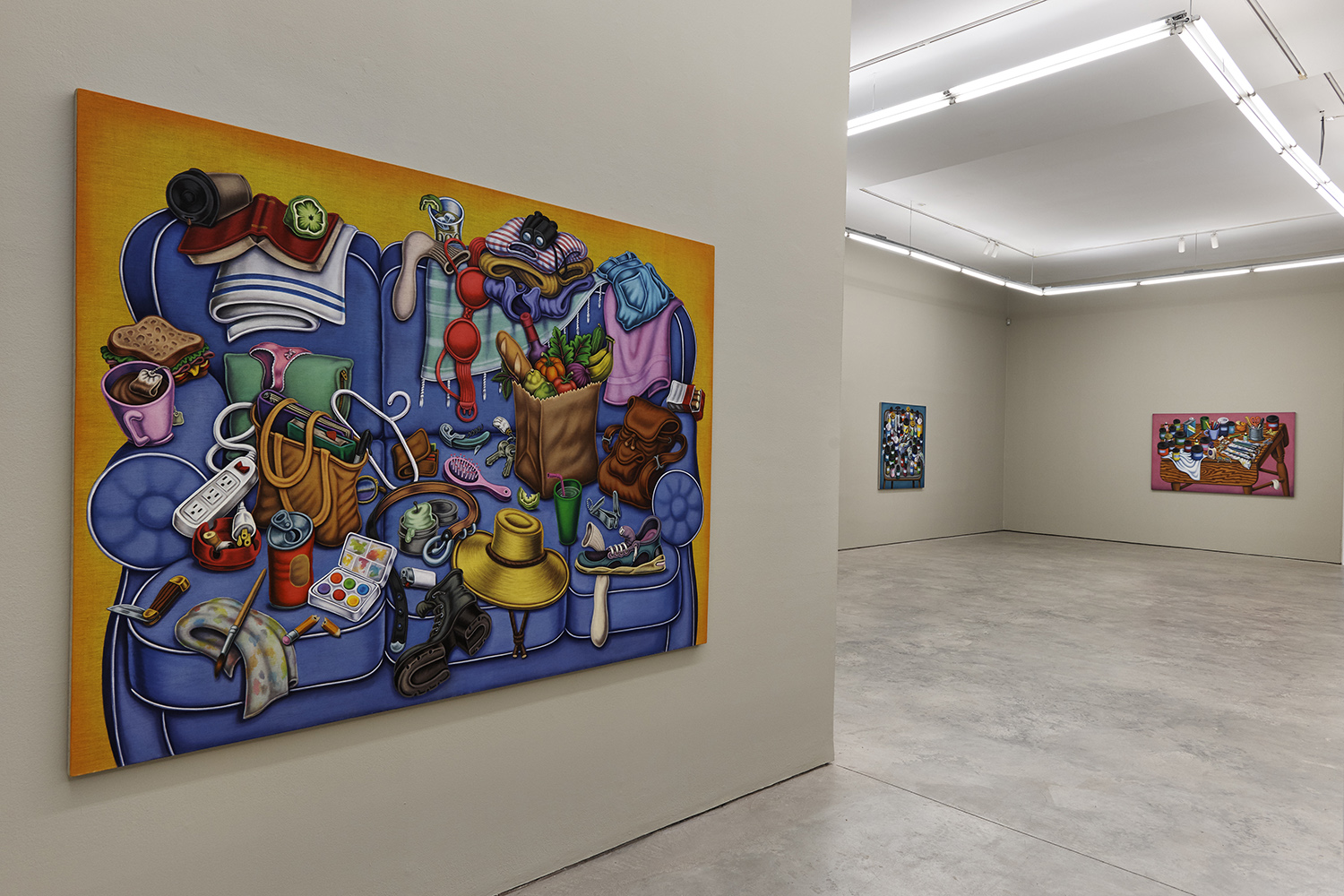 One grouping in this show includes palette tables and painting studio debris; another domestic grouping has couches, dressers and dirty clothes; while a third series renders fruit and veg with more traditional, edible still lifes. Giovanna Garzoni (Italian, 17th Century) is one inspiration in this show, especially the final work completed, Melons, Peaches, Lemon, Pickle and Fly; while many viewers tell me they feel Peter Saul vibes from the funky shapes and colors, I personally see some Eddie Martinez in the flipped up tables covered with crap; certainly these works are vibrant and exciting and simultaneously humble and human, bringing inventiveness to the quotidian still life.