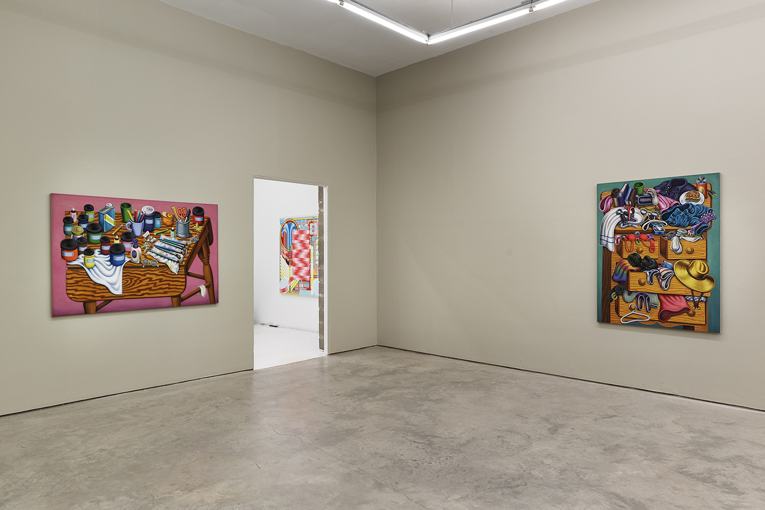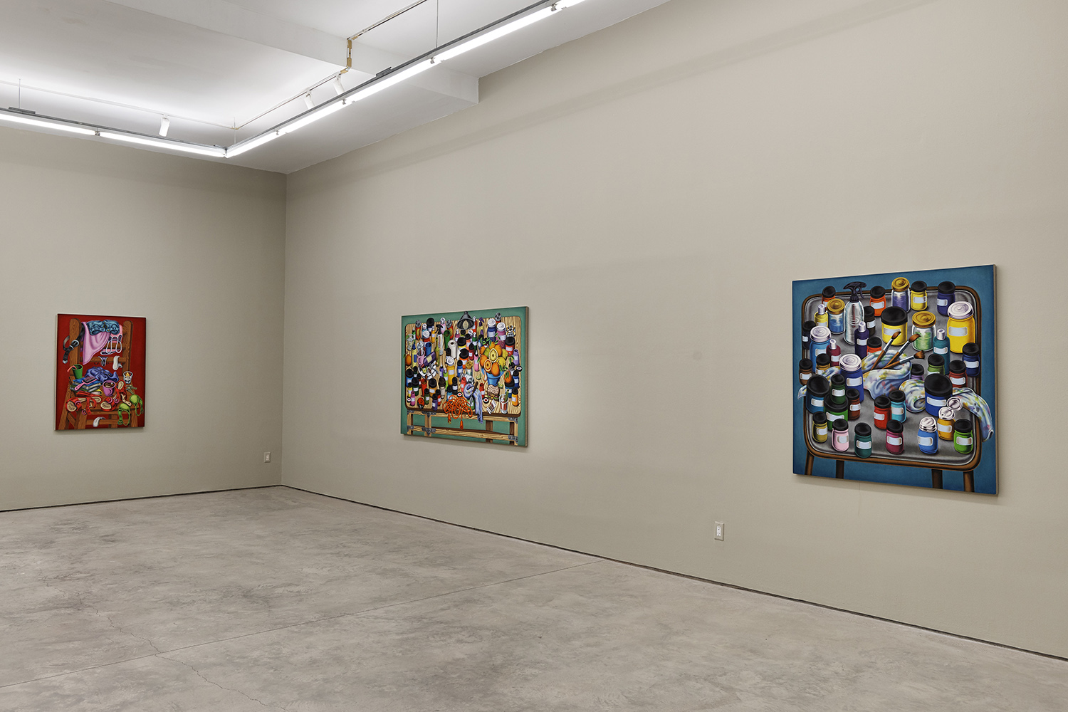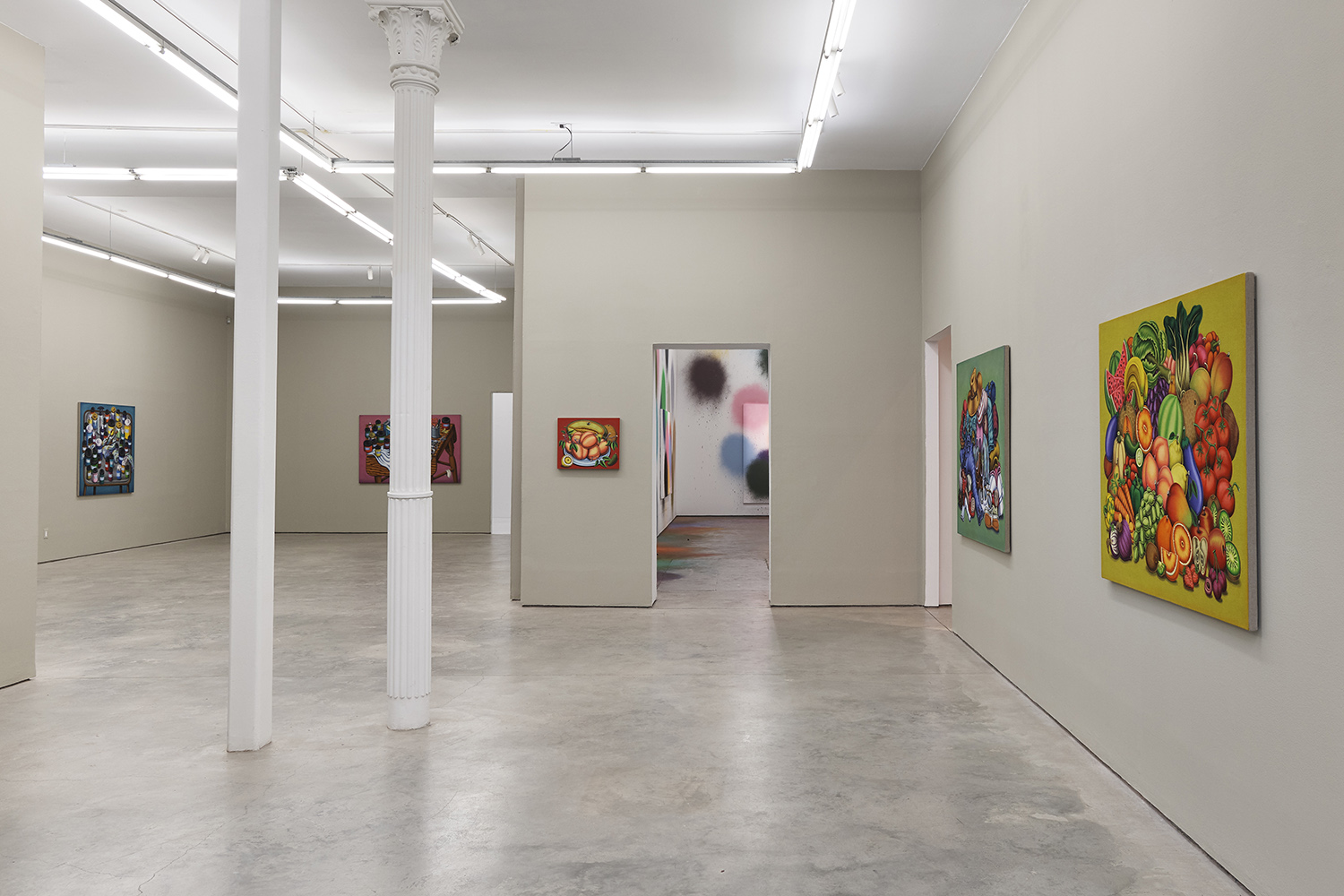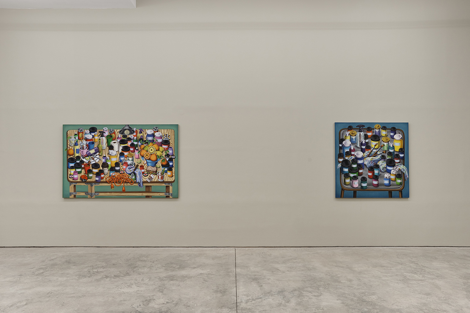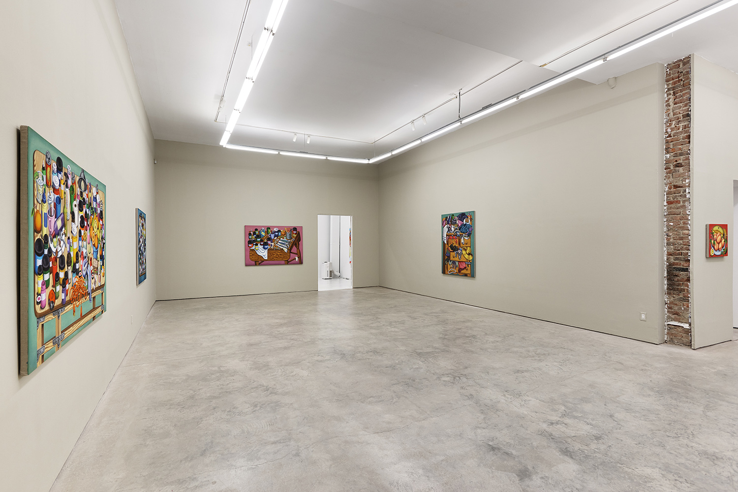 One grouping in this show includes palette tables and painting studio debris; another domestic grouping has couches, dressers and dirty clothes; while a third series renders fruit and veg with more traditional, edible still lifes. Giovanna Garzoni (Italian, 17th Century) is one inspiration in this show, especially the final work completed, Melons, Peaches, Lemon, Pickle and Fly; while many viewers tell me they feel Peter Saul vibes from the funky shapes and colors, I personally see some Eddie Martinez in the flipped up tables covered with crap; certainly these works are vibrant and exciting and simultaneously humble and human, bringing inventiveness to the quotidian still life.