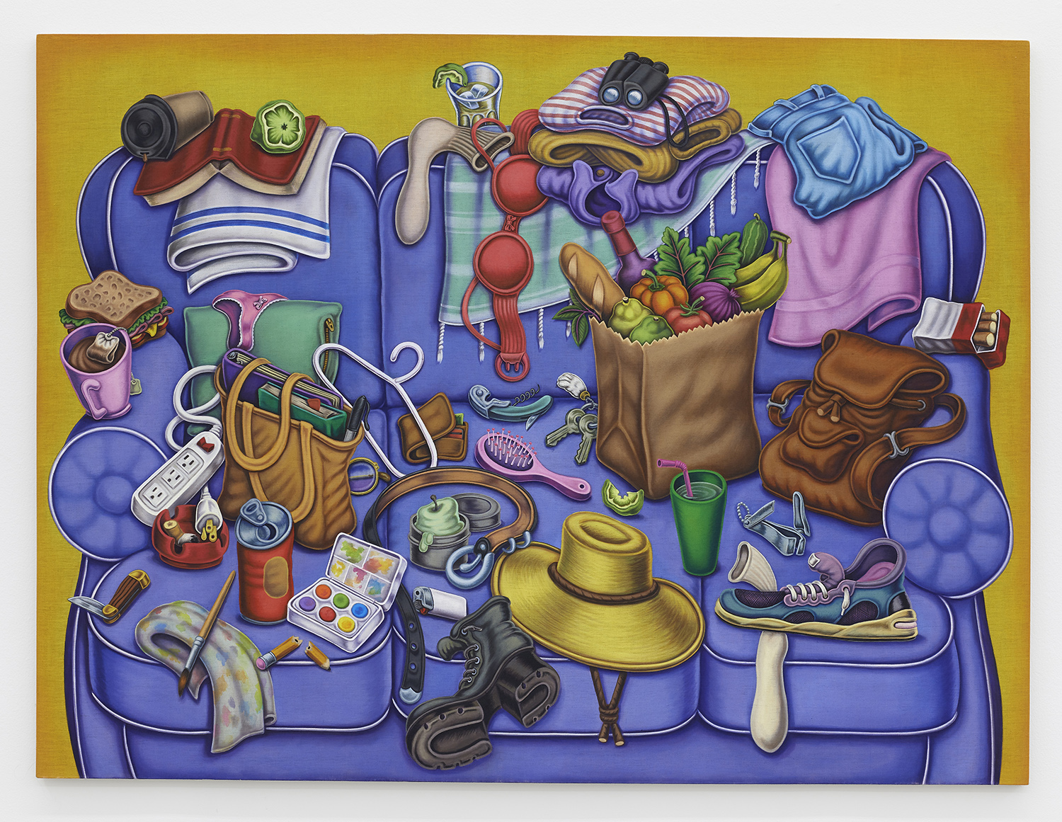 These paintings have an overall muted tonality and soft texture that comes from the technique of painting textile paint onto unprimed linen. Instead of the paint sitting on top of the fabric these works have the pigment soak into the fibers, dyeing them. This however does not prevent the artist from using a palette of bright, beautiful colors and expressive juxtapositions. Puckering navel oranges are convincingly juicy, the American cheese on half-eaten sandwiches evocatively toxic; we have panties, keys and cigarettes, sloppy sneakers and sodden tea bags, fecund melons and sour little pickles; in one giant painting we have almost all those things spread out on a giant studio table.