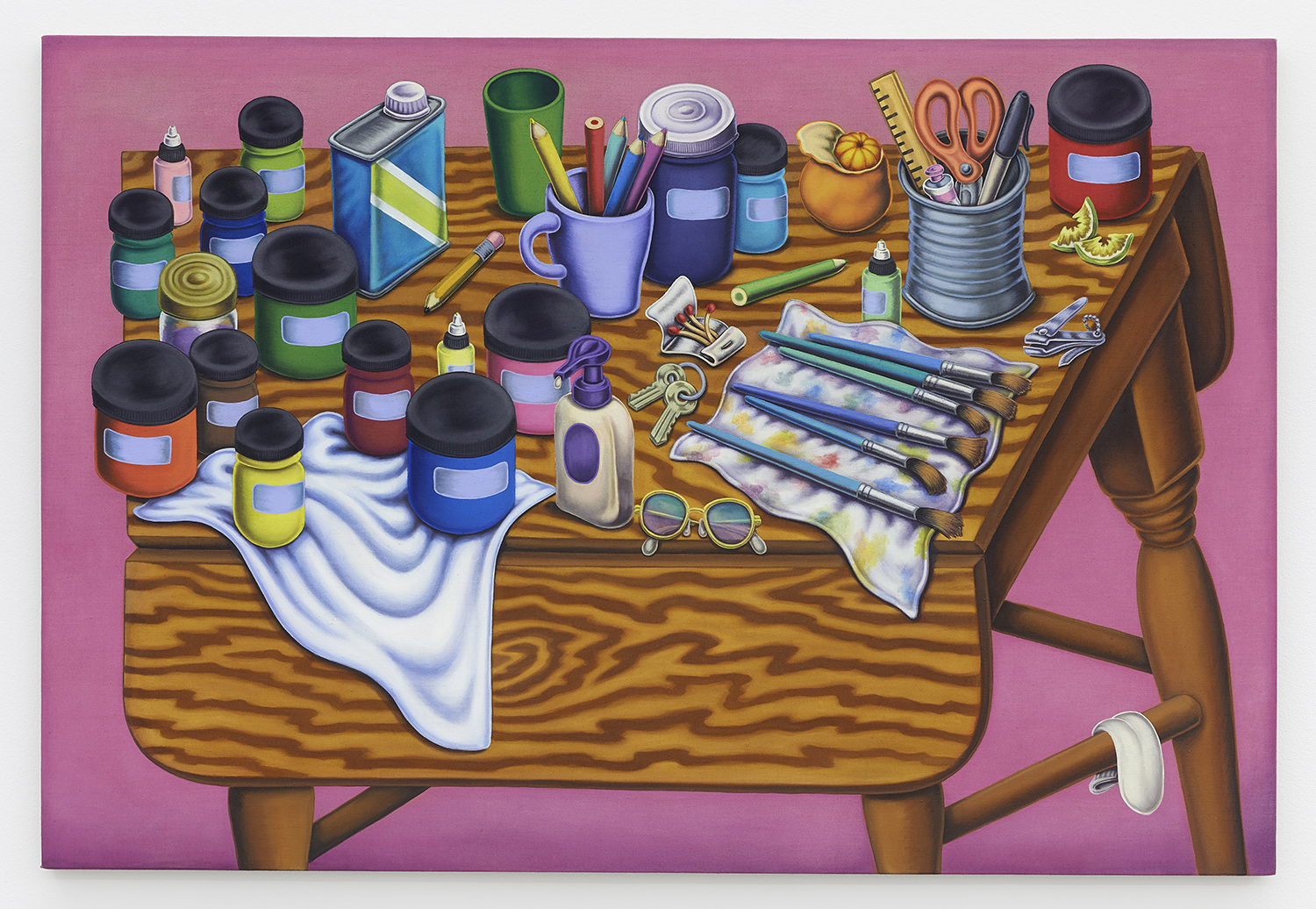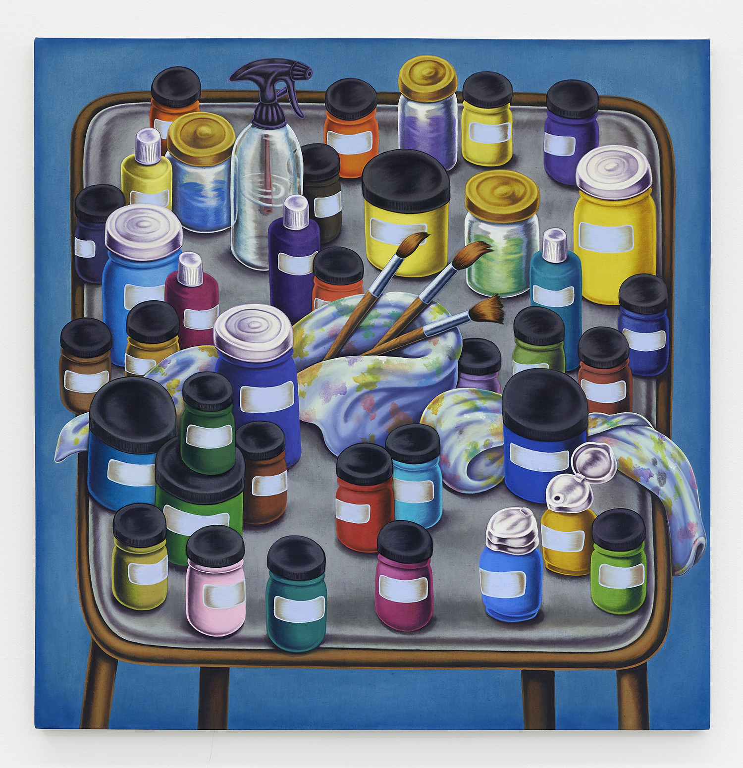 Folding Table With Paint Jars And Rags, 2020, Textile paint on linen, 49 x 48 inches, 125 x 122 cm