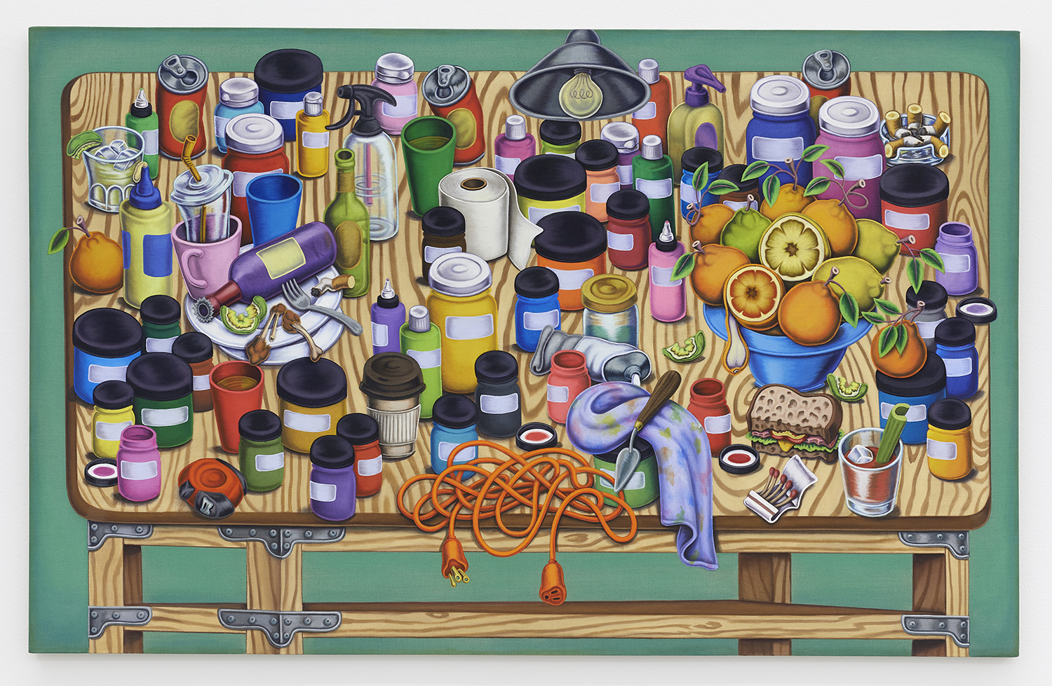 Studio table with Extension Cord, Bowl of citrus, Dirty Plates and Cups, 2020, Textile paint on linen, 48 x 76 inches, 122 x 193 cm