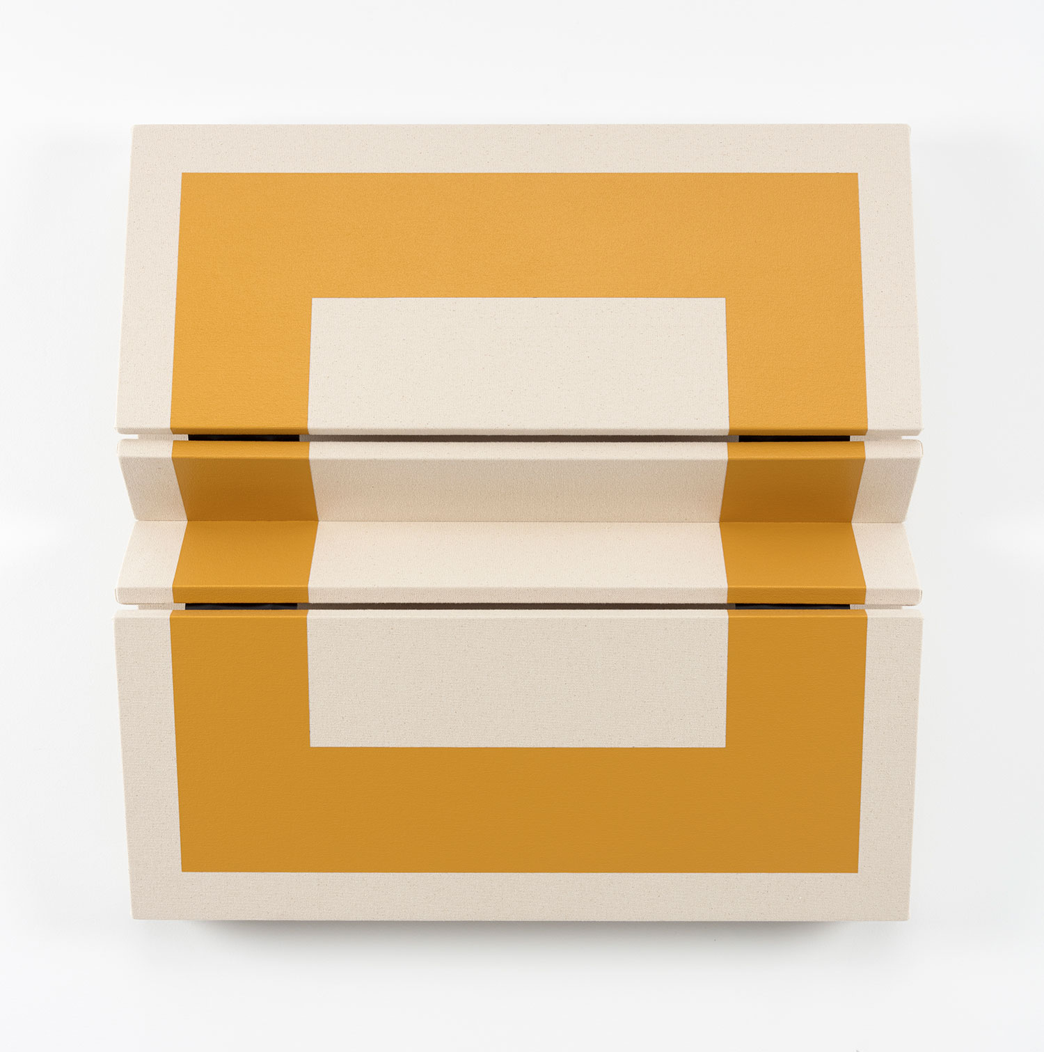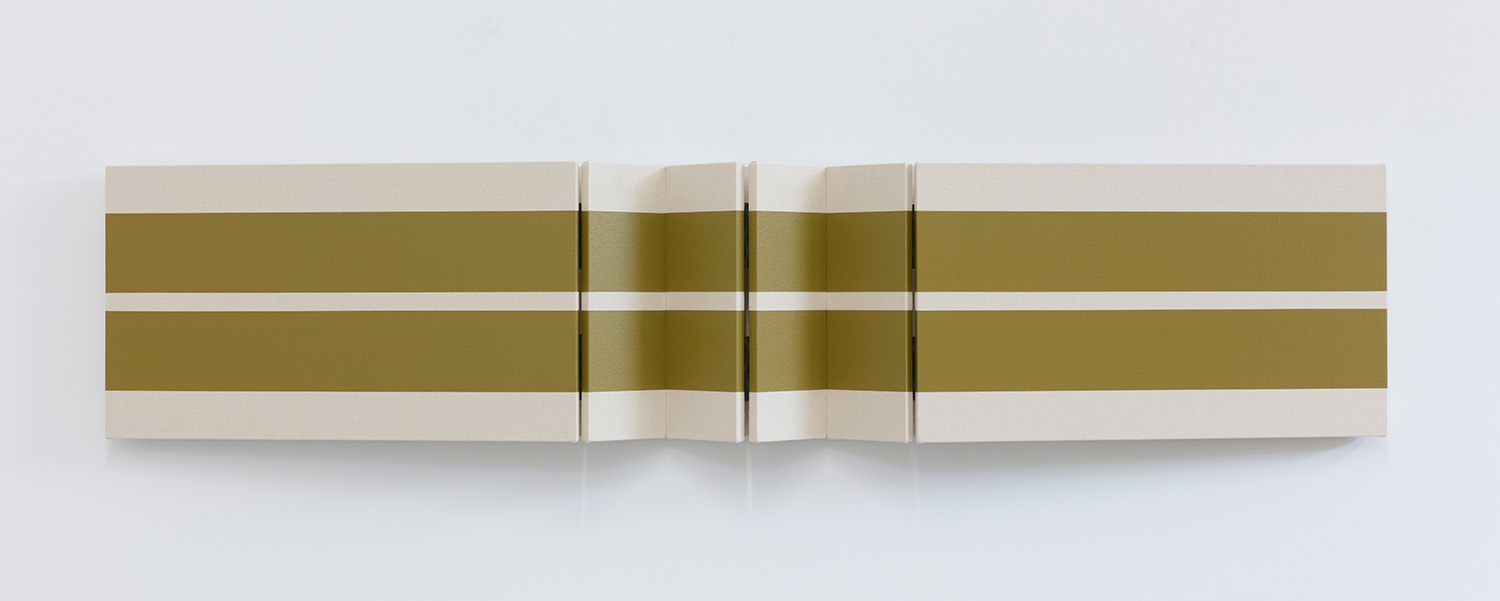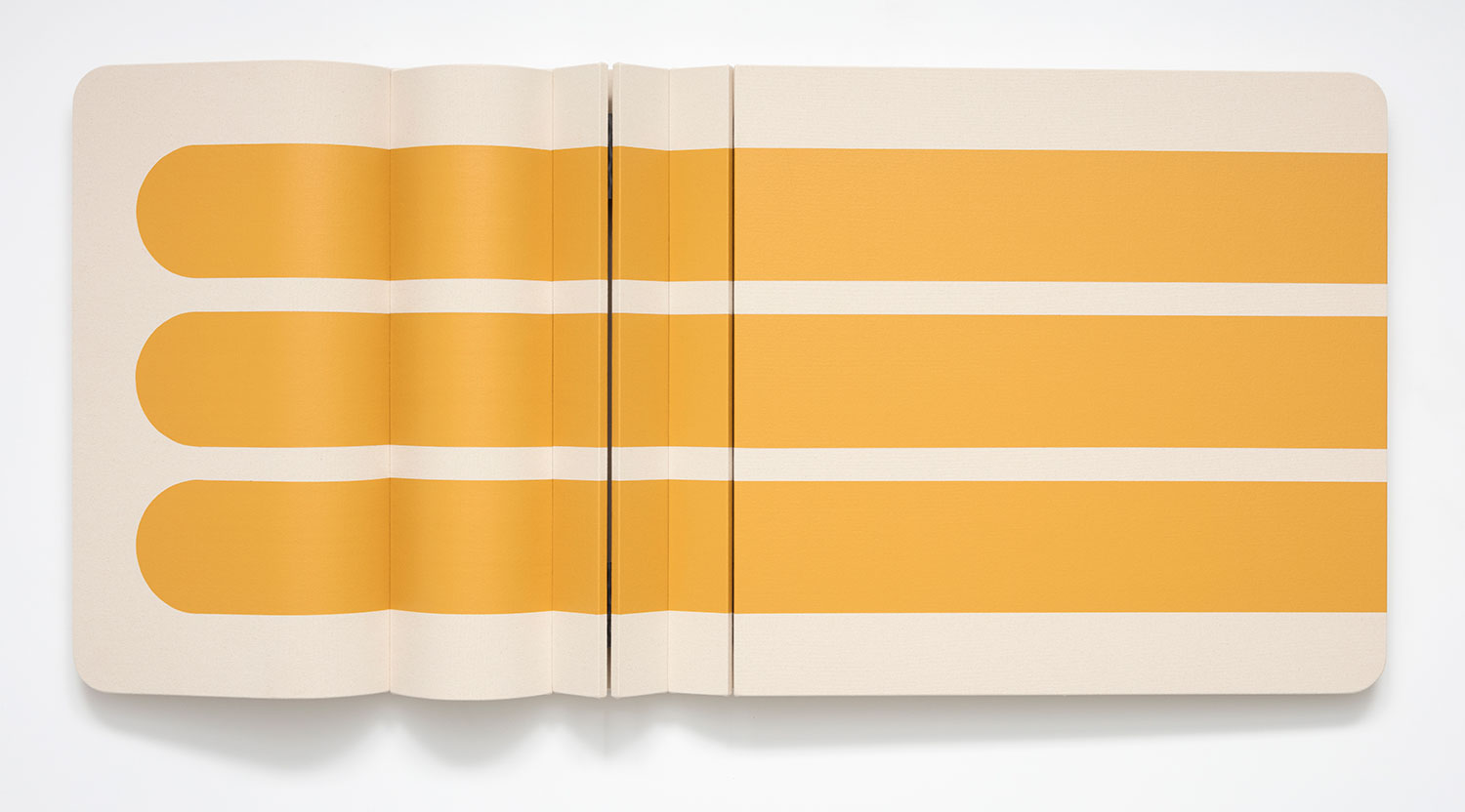 Untitled Three Blunted Yellow Stripes, 2022, canvas on wooden panel with acrylic paint, tacks, leather hinges, 38 x 80 x 5 inches, 97 x 206 x 13 cm.