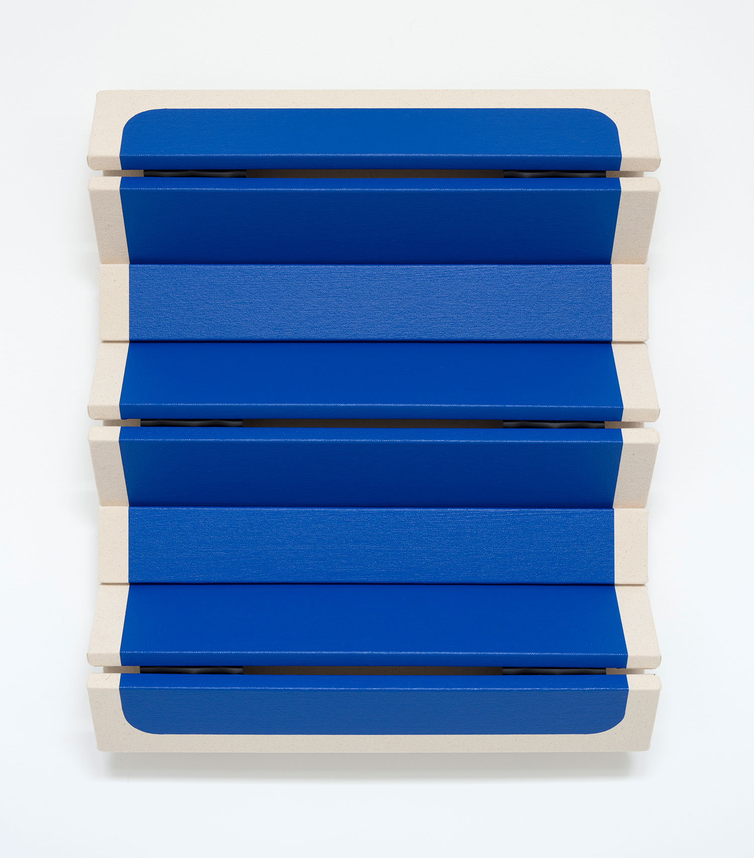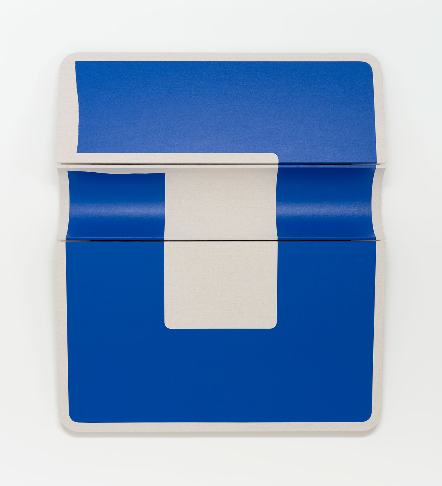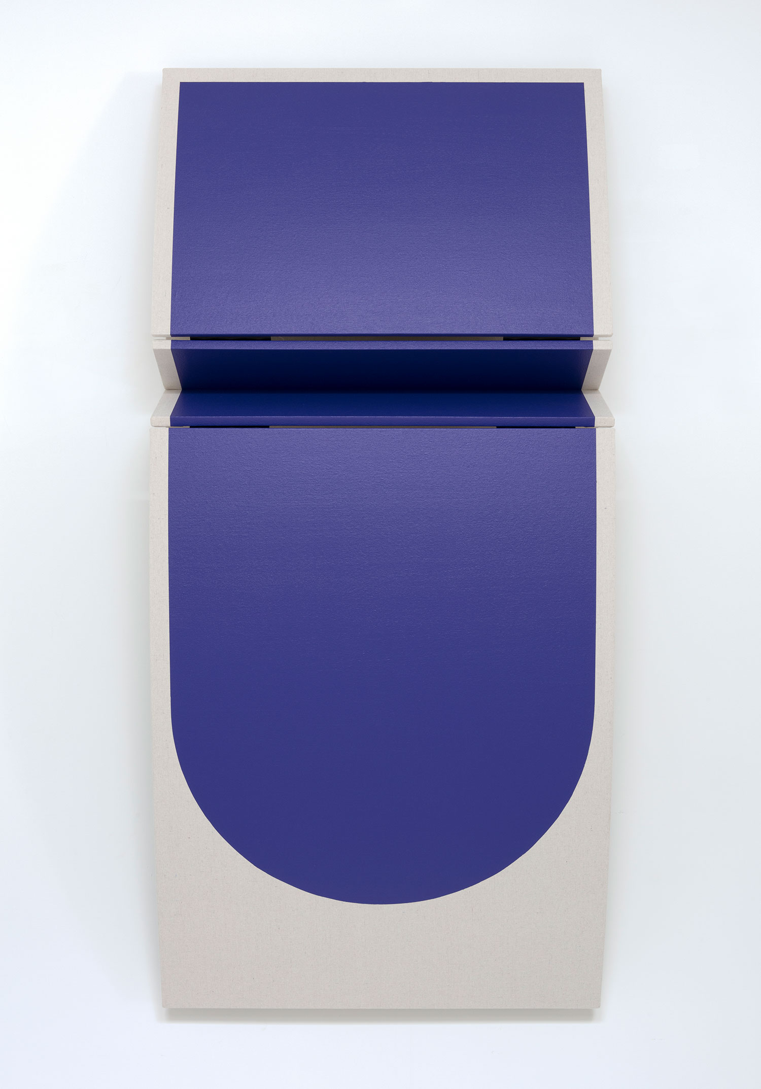 Untitled Blunted Blue Rectangle II, 2022, canvas on wooden panel with acrylic paint, tacks, leather hinges, 26.5 x 22 x 5 inches, 67 x 56 x 13 cm.