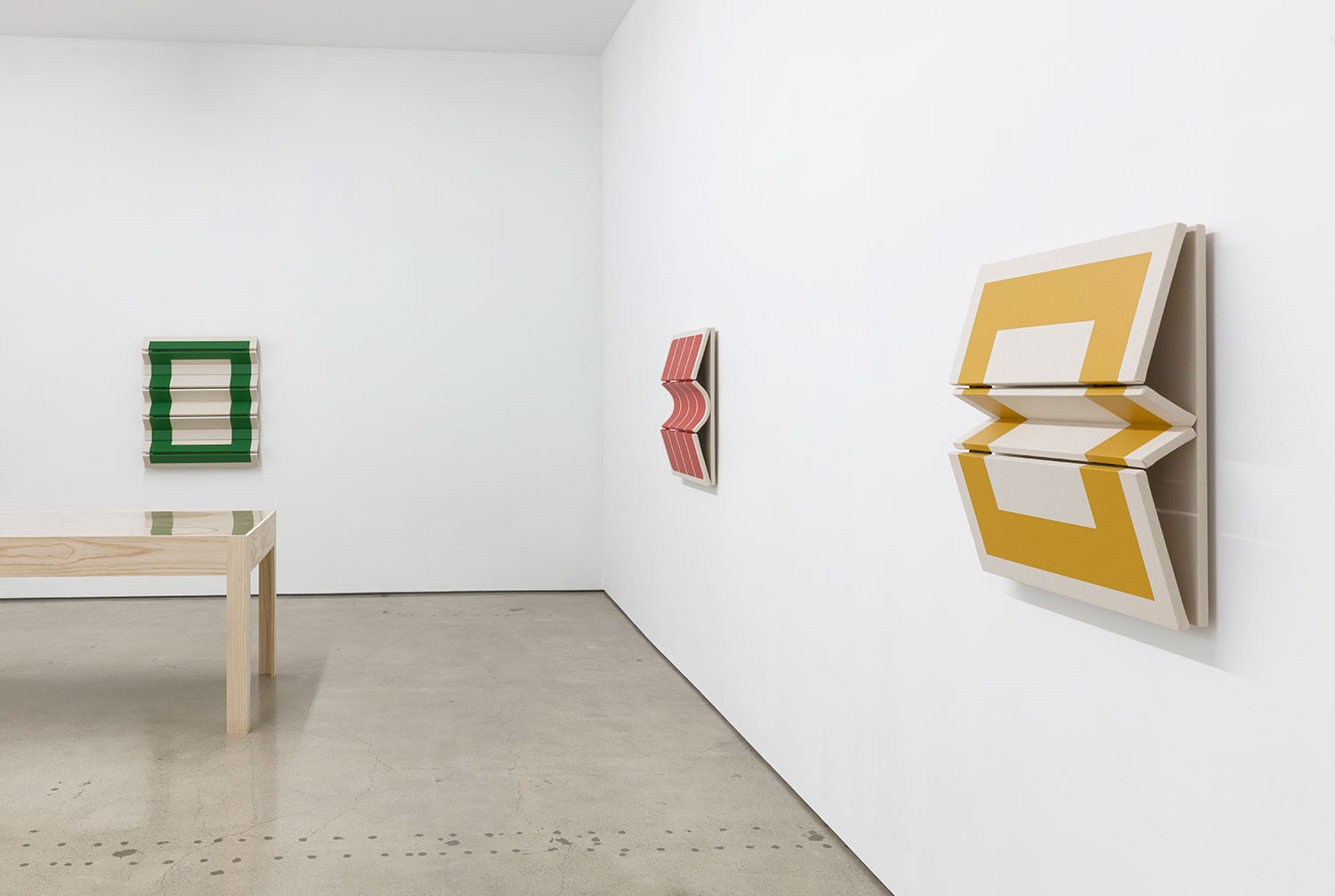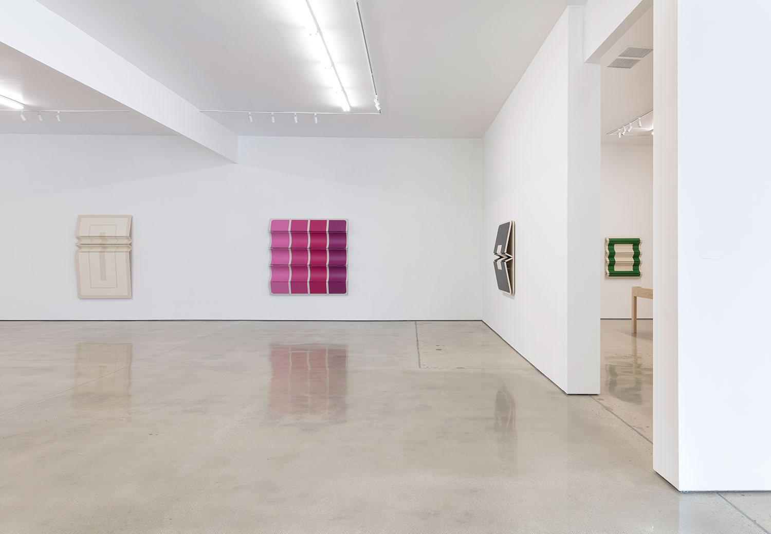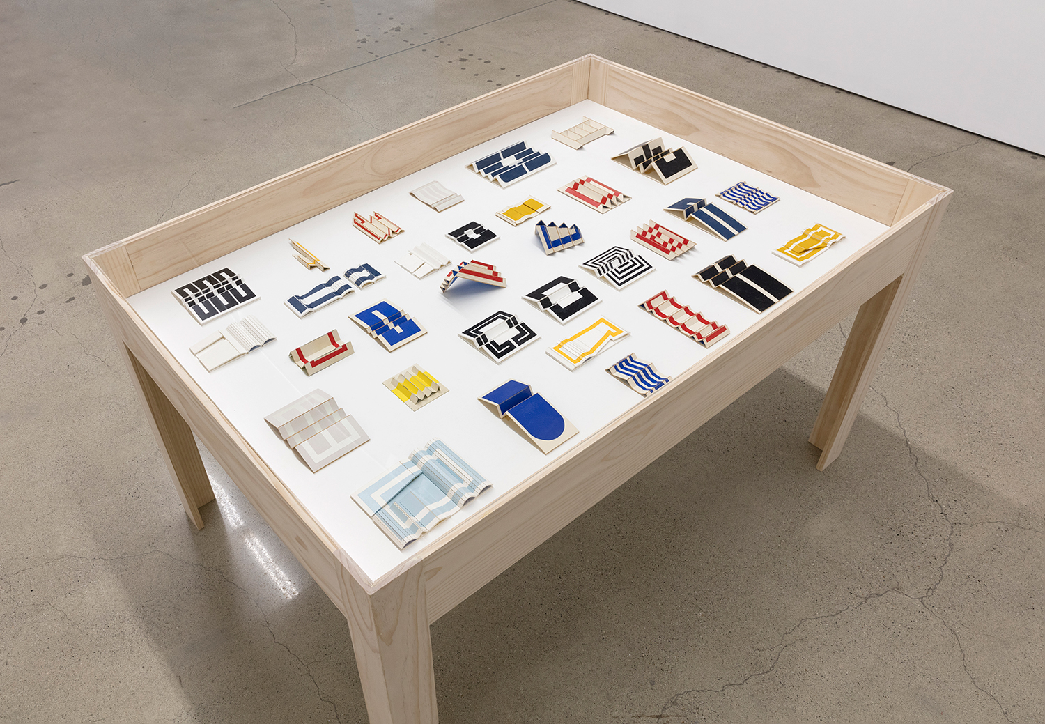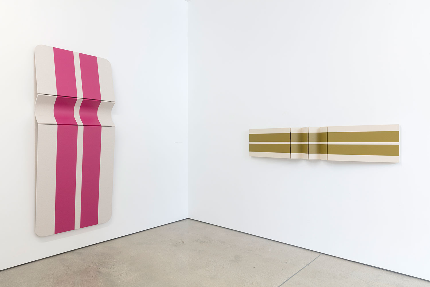 As an introduction to his studies, the artist offers his maquettes – small folded and painted card-stock paper models of potential paintings. At this scale, one is presented with the opportunity to consider the work at a birds-eye level, where the folds of the work most subtly affect the sharp colorful lines of the painting. They become akin to architectural models, but with the delicate nature of origami. Educated by the investigations in paper, the final paintings push the effect of light and shadow across the folded surfaces further with their volume. Exquisitely well-made, the cleanly tacked canvas wraps around perfectly sanded panels that are hinged together with leather. With each degree the curves and angles of the stretched canvas differs, the raw canvas and paint evolve into a range of tones. Observing the wall works at varying viewpoints, the colorful, simple geometric shapes in paint become complicated polygons as they visually slip out of sight and the panels rise and dip along their folds. When the painted shapes are entirely obscured and the canvas is examined only from its profile, the density of the panels is replaced by the negative space behind them, offering only outlines of the forms.