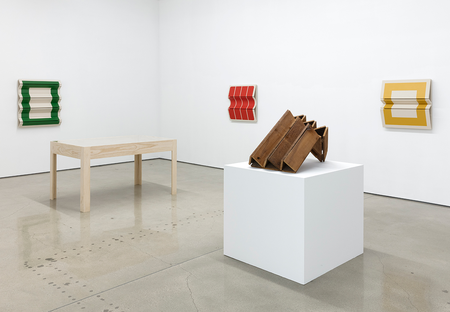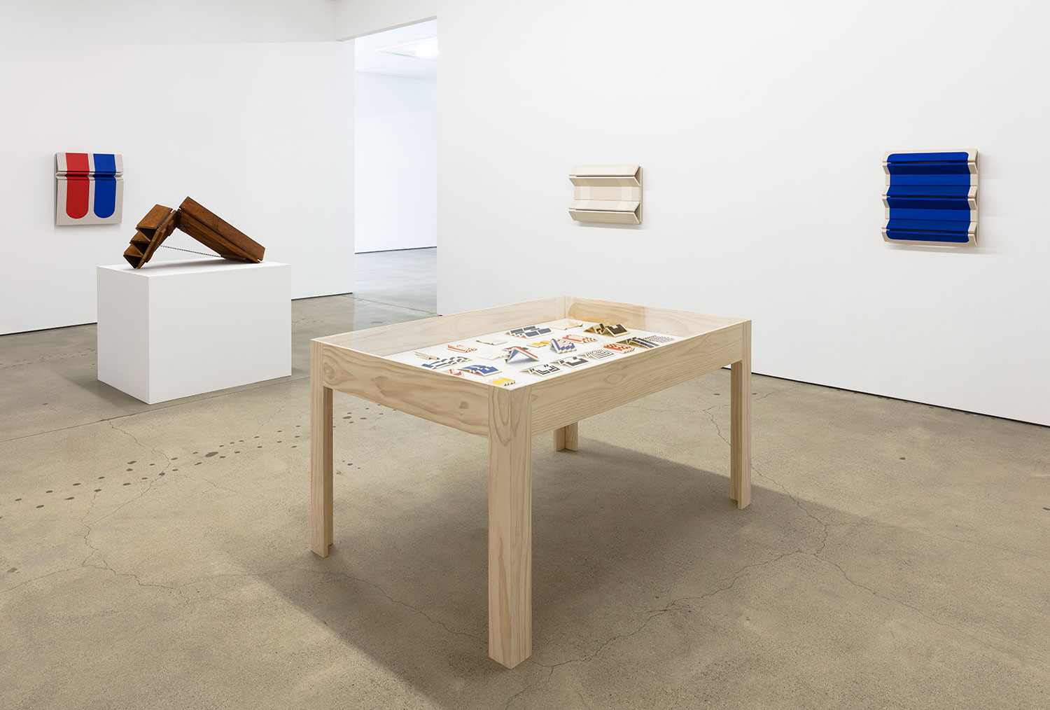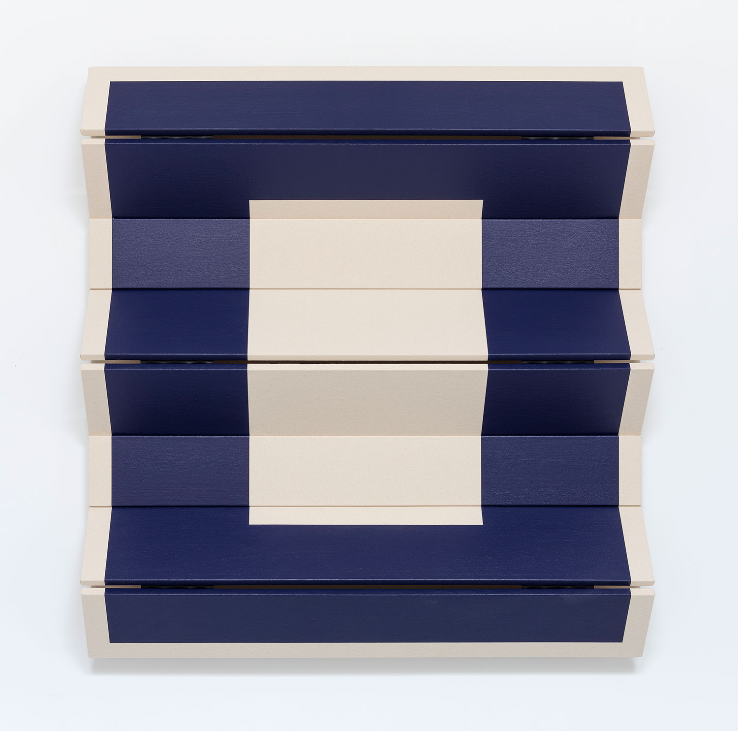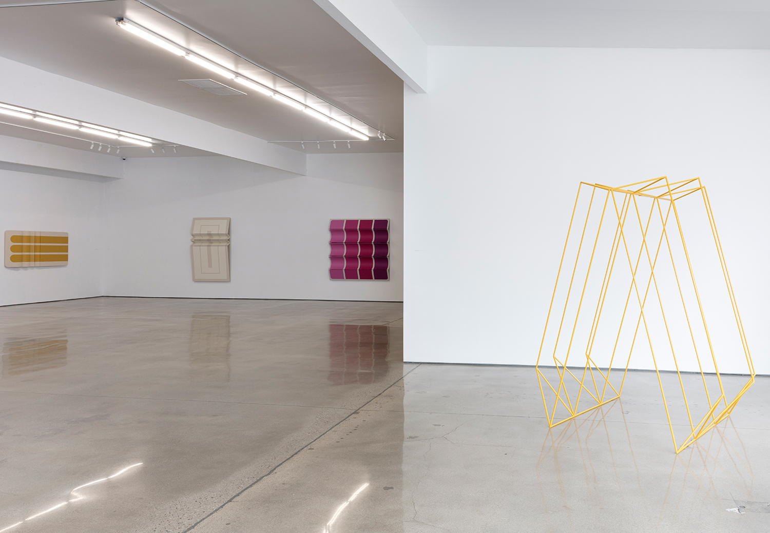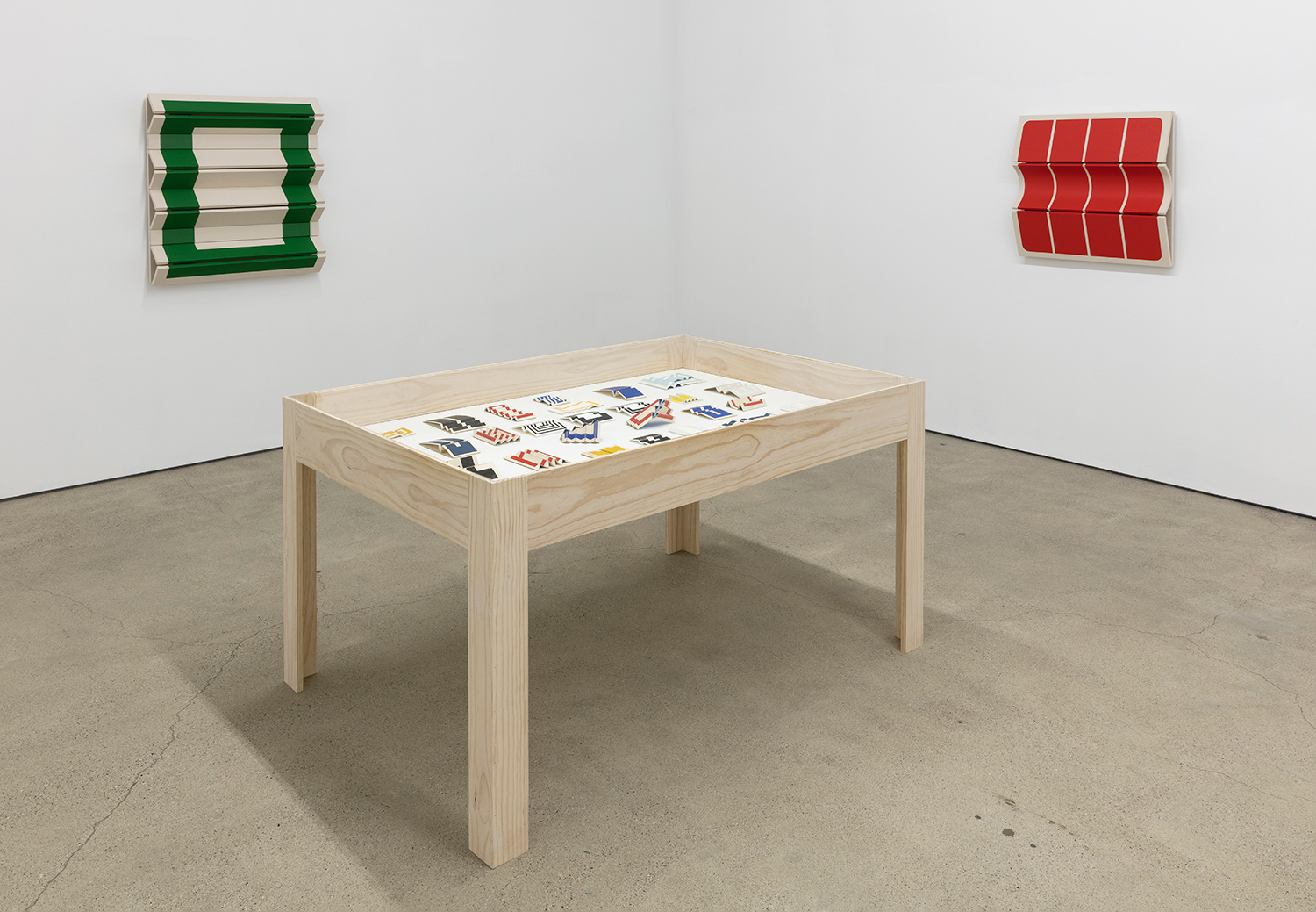 As an introduction to his studies, the artist offers his maquettes – small folded and painted card-stock paper models of potential paintings. At this scale, one is presented with the opportunity to consider the work at a birds-eye level, where the folds of the work most subtly affect the sharp colorful lines of the painting. They become akin to architectural models, but with the delicate nature of origami. Educated by the investigations in paper, the final paintings push the effect of light and shadow across the folded surfaces further with their volume. Exquisitely well-made, the cleanly tacked canvas wraps around perfectly sanded panels that are hinged together with leather. With each degree the curves and angles of the stretched canvas differs, the raw canvas and paint evolve into a range of tones. Observing the wall works at varying viewpoints, the colorful, simple geometric shapes in paint become complicated polygons as they visually slip out of sight and the panels rise and dip along their folds. When the painted shapes are entirely obscured and the canvas is examined only from its profile, the density of the panels is replaced by the negative space behind them, offering only outlines of the forms.