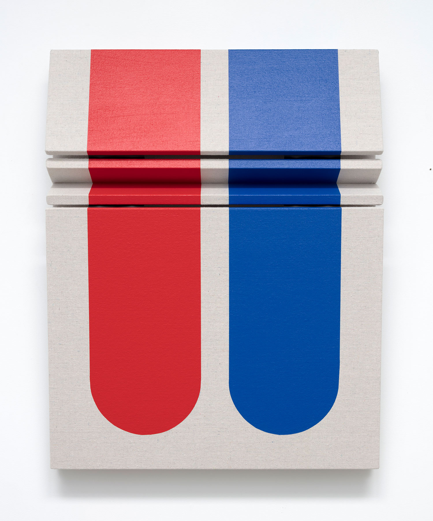 Untitled Red and Blue Composition, 2022, drop cloth on wooden panel with acrylic paint, tacks, leather hinges, 31 x 24 x 6 inches, 79 x 61 x 13 cm.