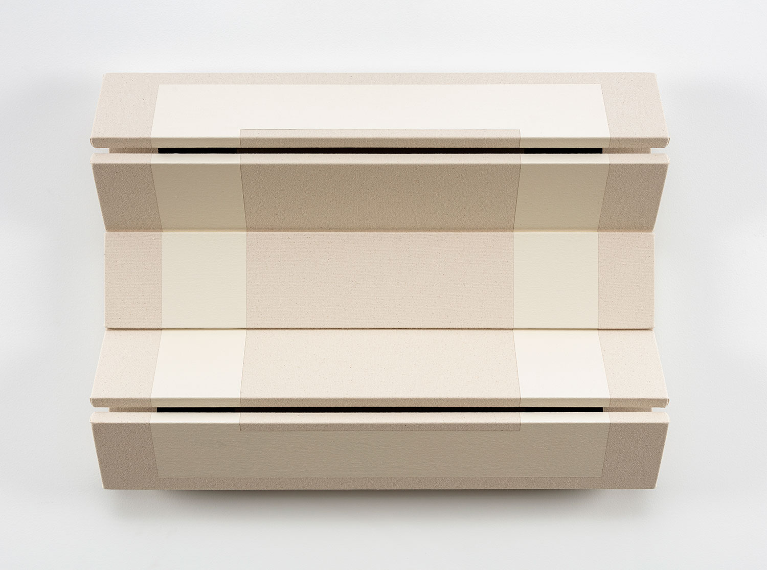 Untitled Muted White Rectangle, 2022, canvas on wooden panel with acrylic paint, tacks, leather hinges, 22 x 29 x 6 inches, 56 x 74 x 15 cm.