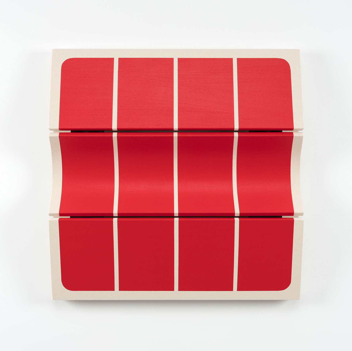 Untitled Blunted Red Composition, 2022, canvas on wooden panel with acrylic paint, tacks, leather hinges, 31 x 37 x 5 inches, 76 x 91 x 13 cm.