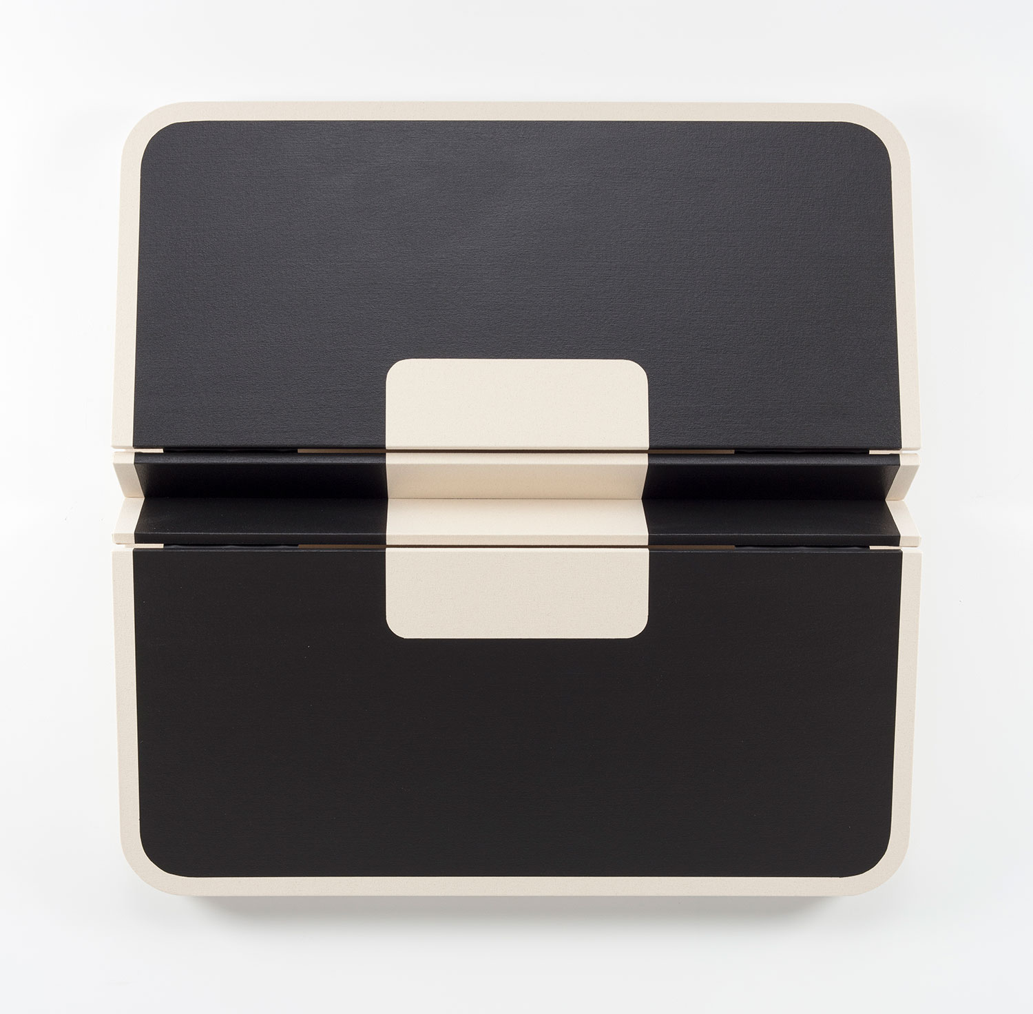 Untitled Blunted Black Rectangle II, 2022, canvas on wooden panel with acrylic paint, tacks, leather hinges, 48 x 48 x 7 inches, 122 x 122 x 18 cm.