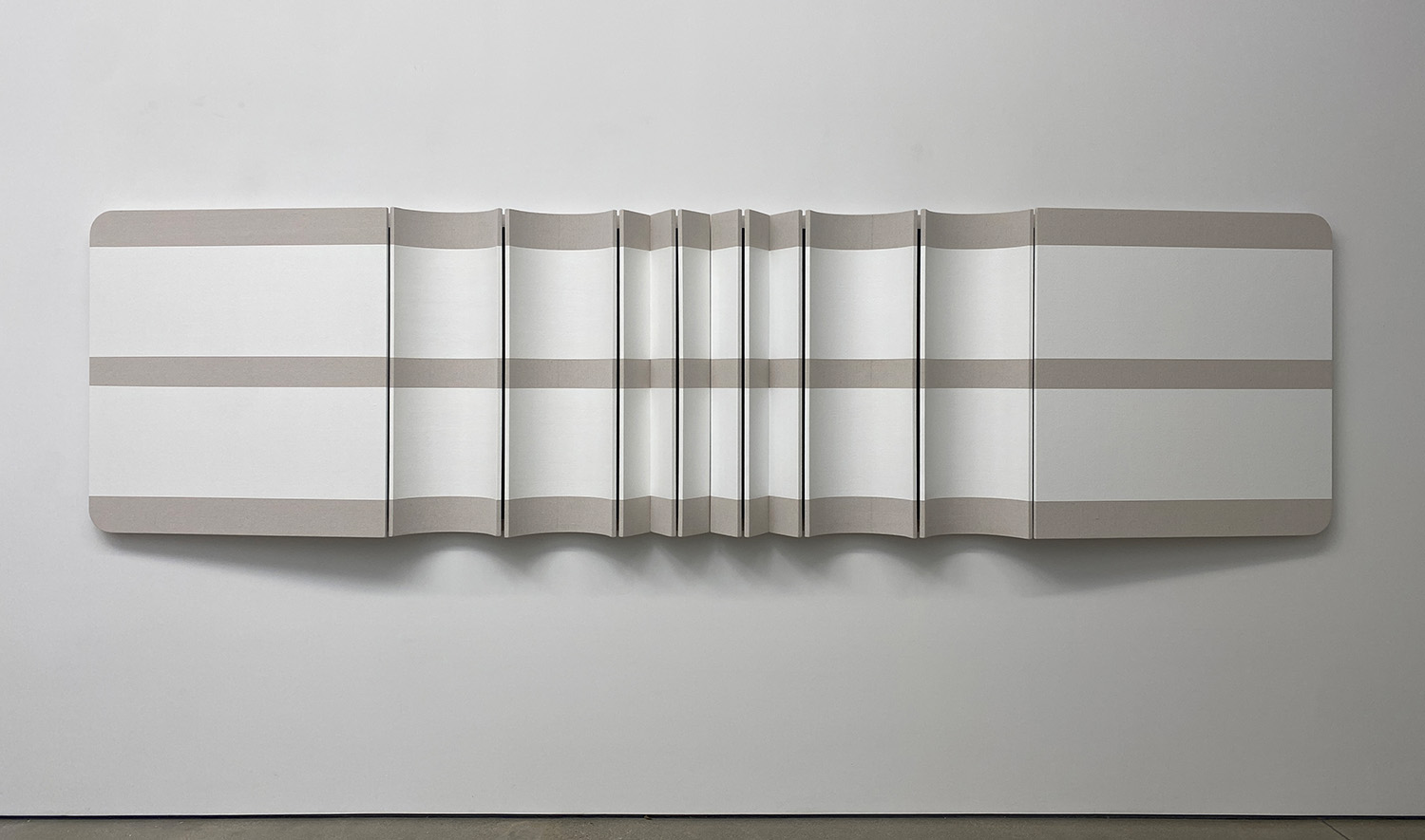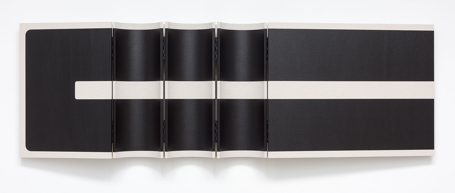 Two Parallel White Stripes, 2022, dropcloth on wooden panel with acrylic paint, tacks and leather hinges, 44 x 172 x 7.5 inches, 112 x 434 x 19 cm.