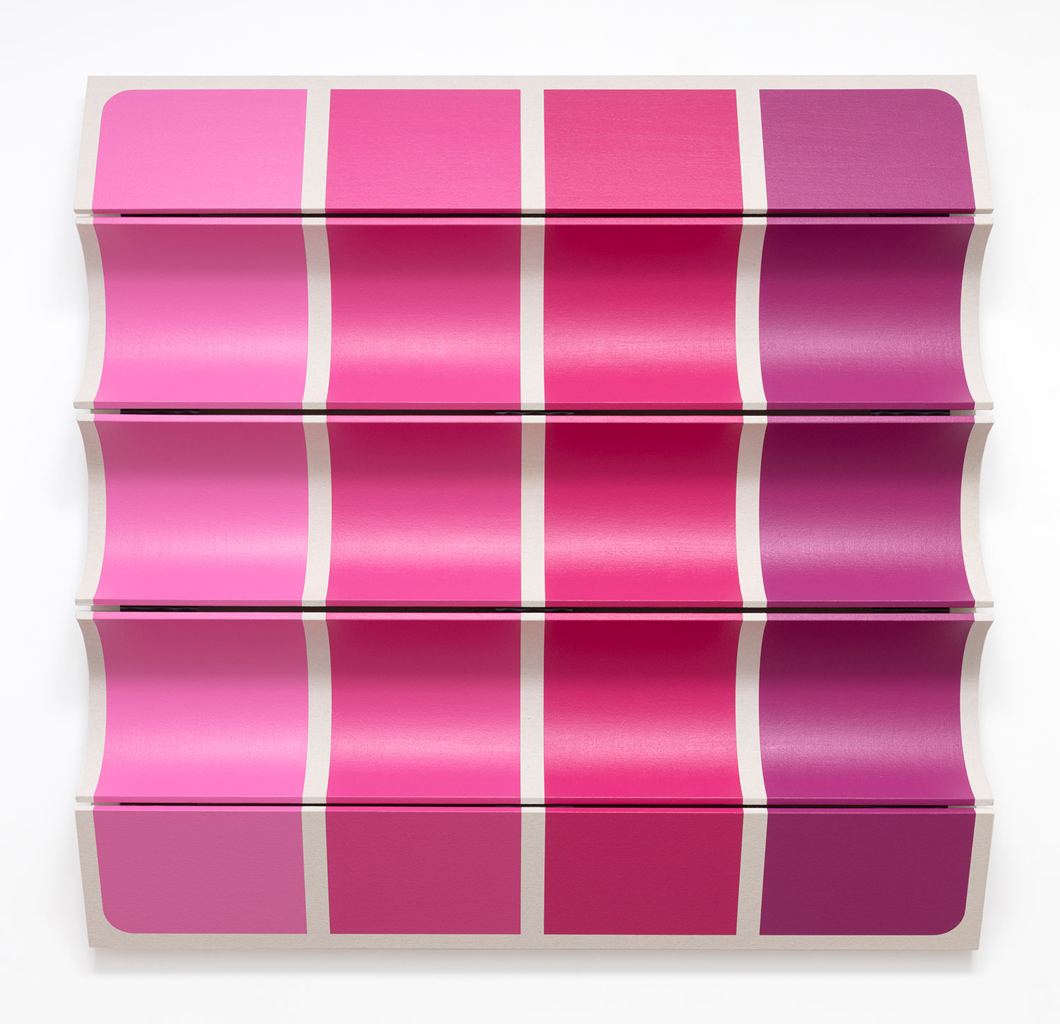 Untitled Pink Pantone, 2022, drop cloth on wooden panel with acrylic paint, tacks, leather hinges, 71 x 72 x 8 inches, 180 x 183 x 18 cm.