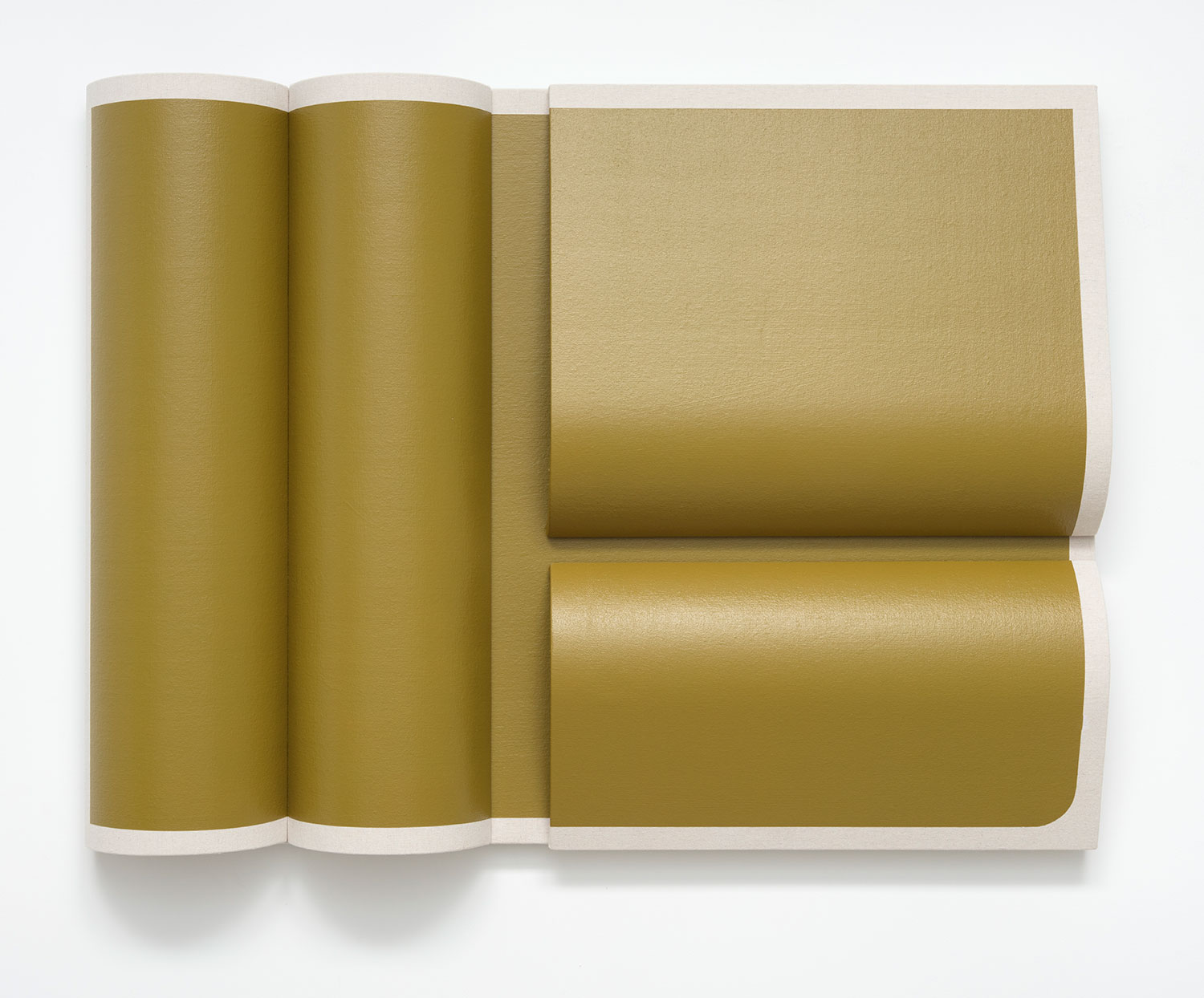 Blunted Olive Rectangle, 2022, dropcloth on wooden panel with acrylic paint, tacks, leather hinges, 36 x 48 x 6 inches, 91 x 122 x 13 cm.