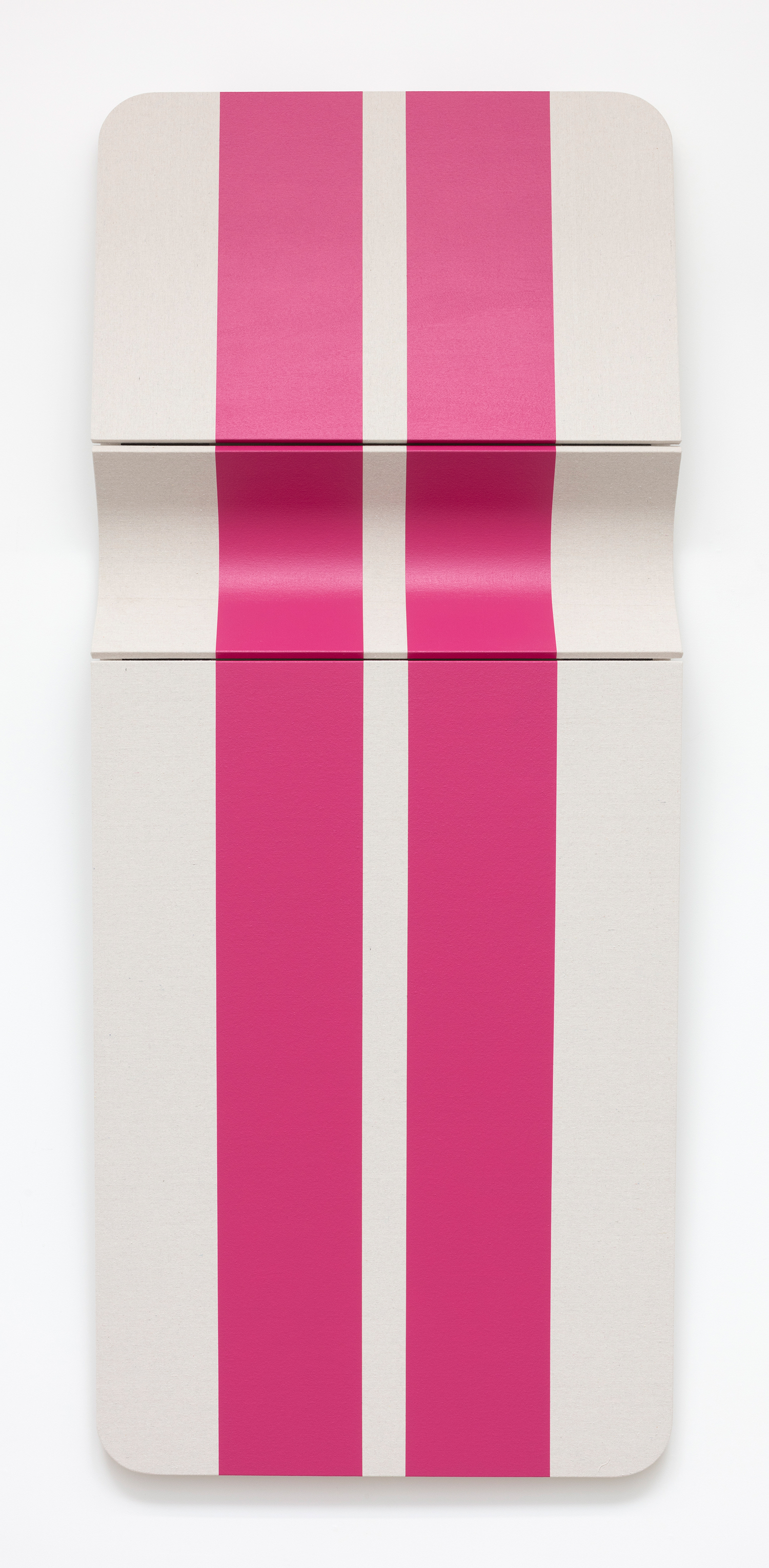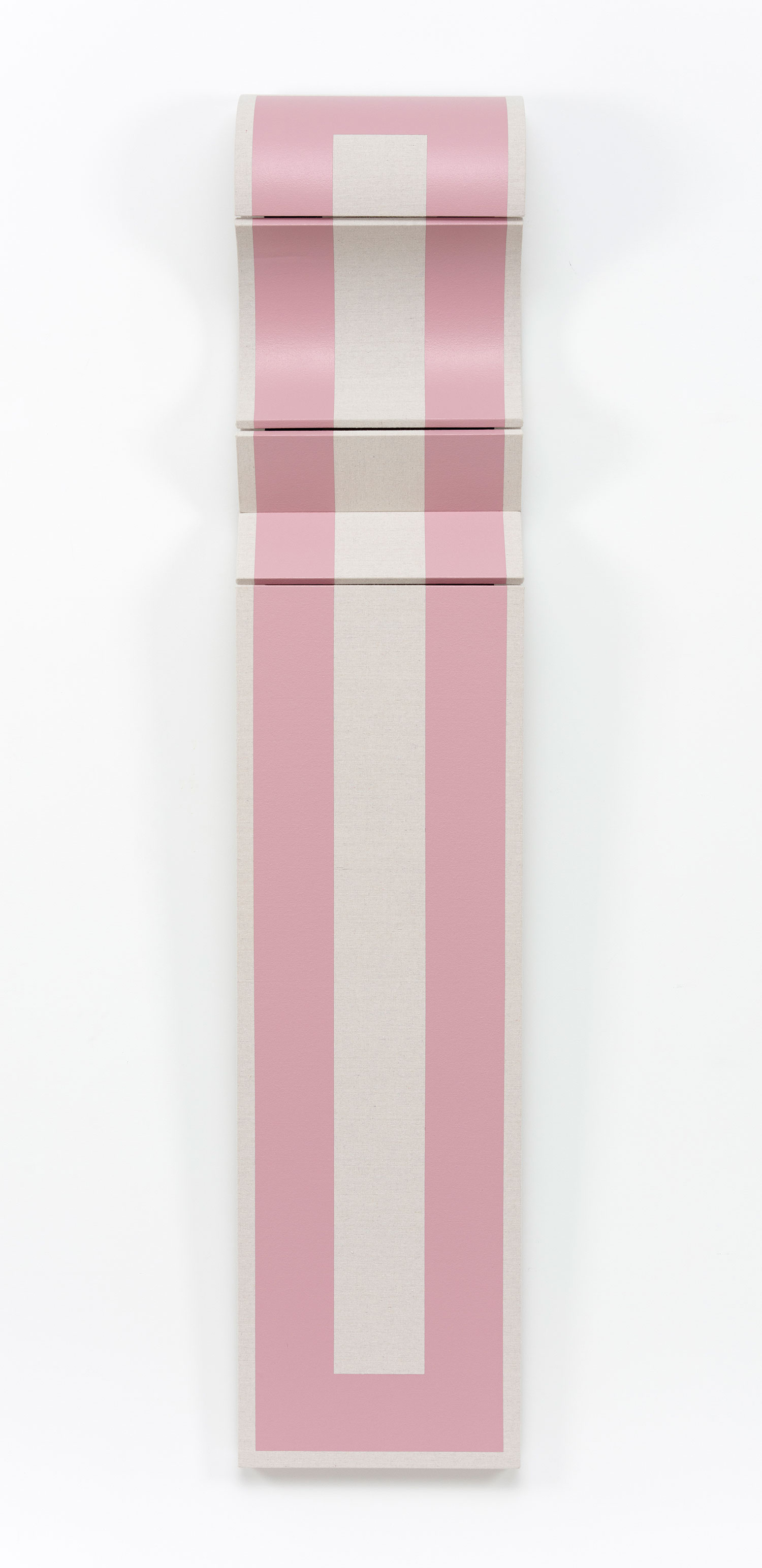 Untitled Two Vertical Pink Stripes, 2022, drop cloth on wooden panel with acrylic paint, tacks, leather hinges, 96 x 41 x 8 inches, 244 x 102 x 18 cm.