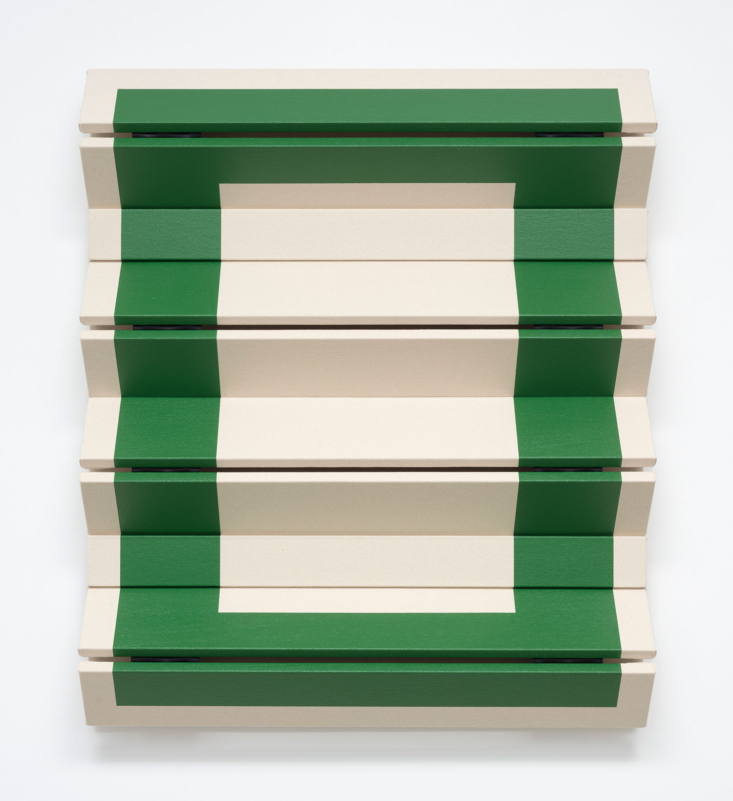 Two Horizontal Green Stripes, Canvas on wooden panel with acrylic paint, tacks, leather hinges, 17 x 80 x 5 inches, 43 x 203 x 13 cm.