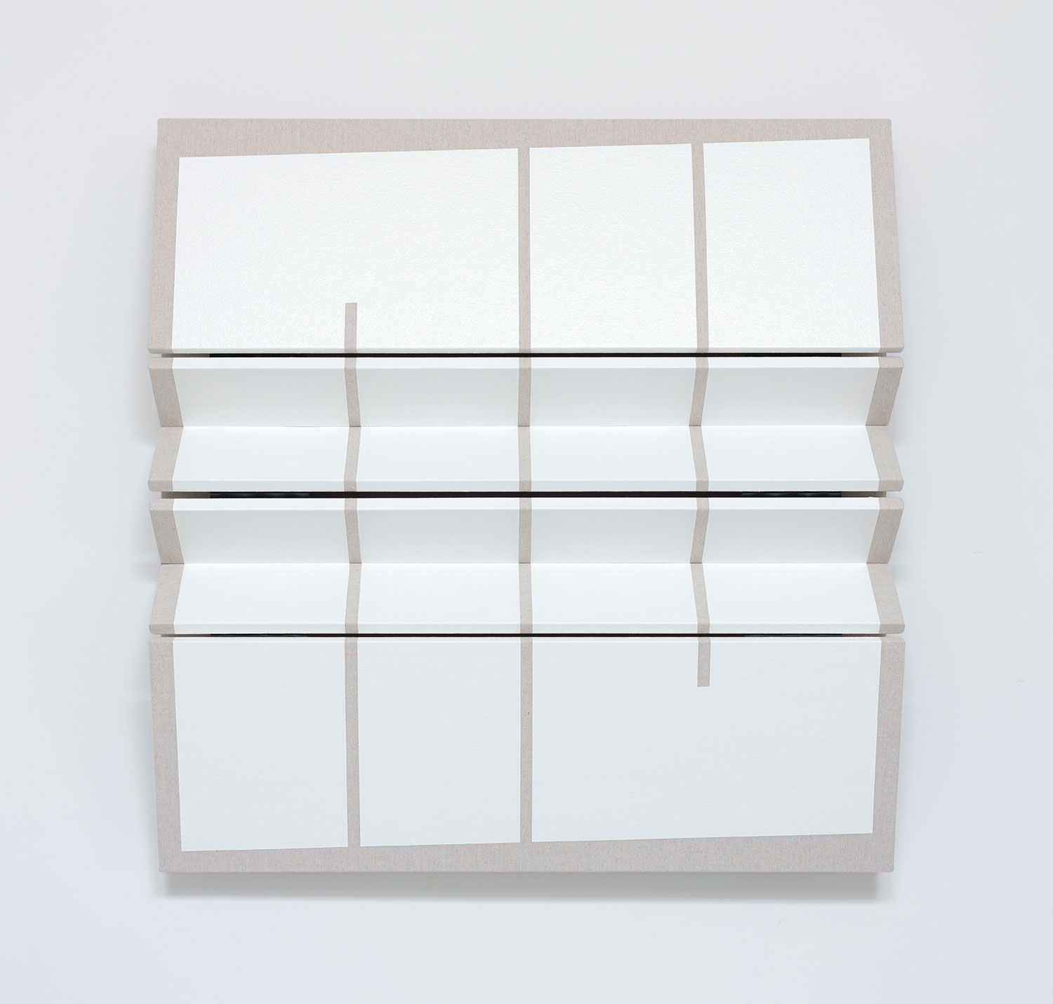 Untitled Shifted White Composition, 2022, drop cloth on wooden panel with acrylic paint, tacks, leather hinges, 40 x 39 x 7 inches, 102 x 99 x 15 cm.