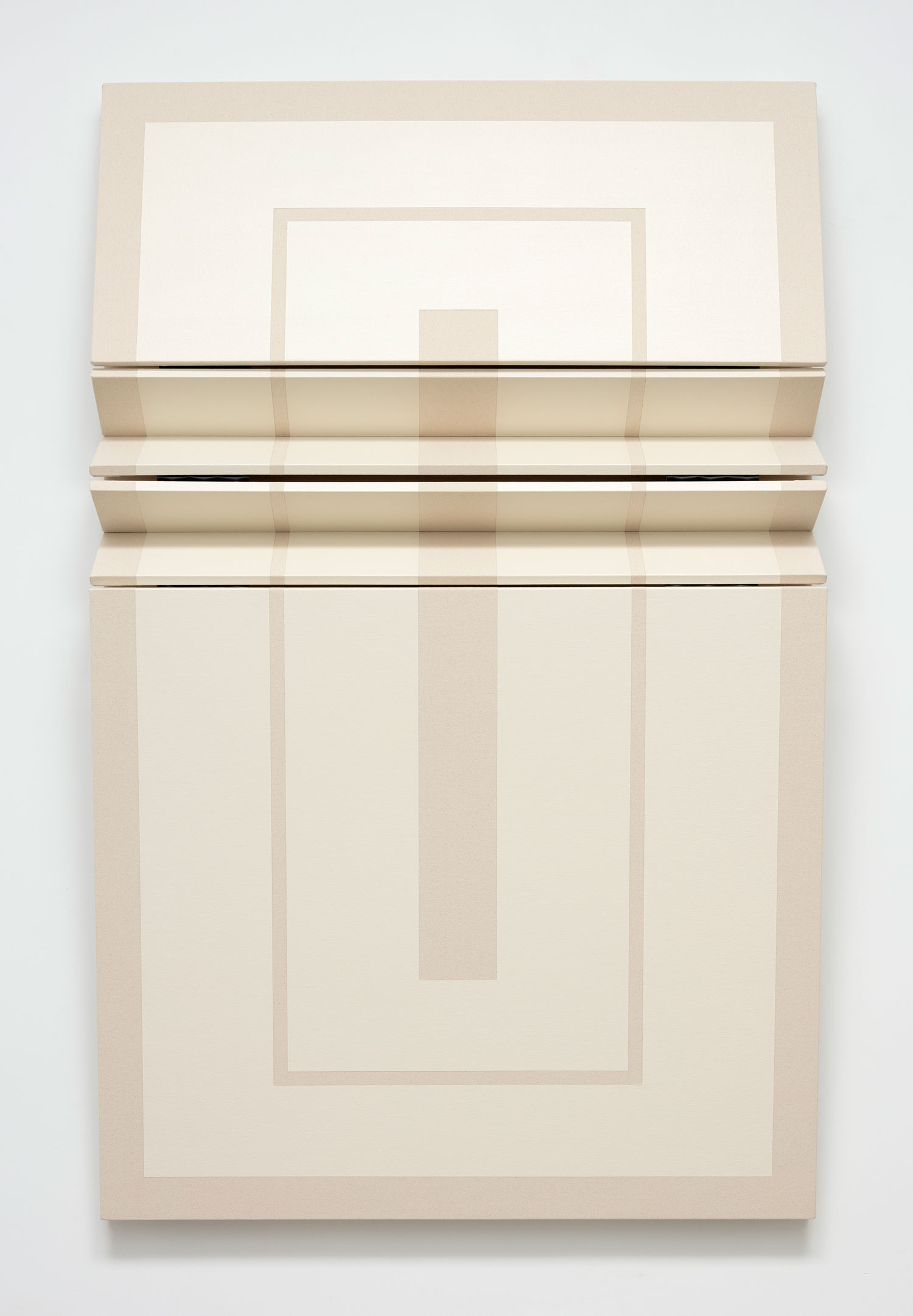 Untitled Muted White Rectangles, 2022, canvas on wooden panel with acrylic paint, tacks, leather hinges, 77 x 49 x 8 inches, 193 x 122 x 20 cm.