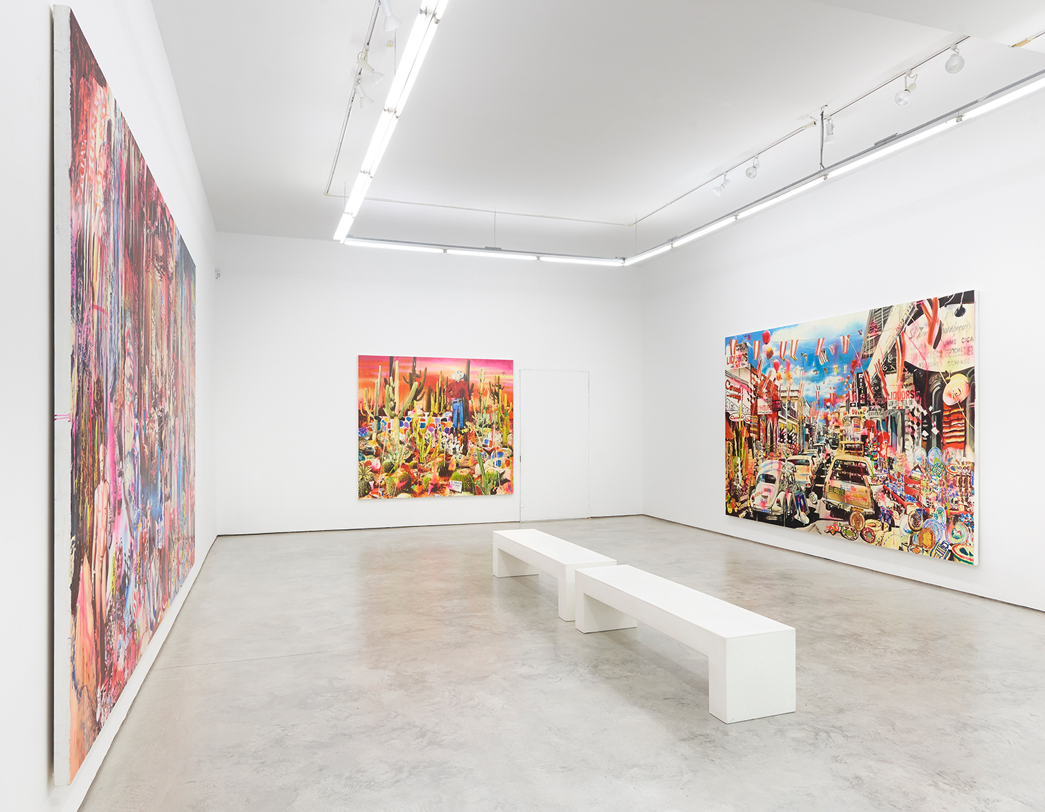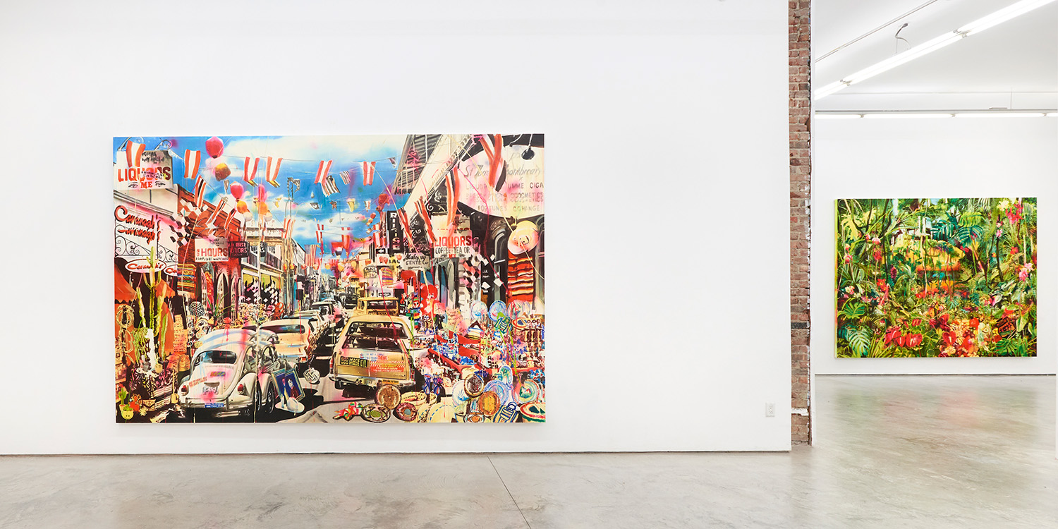 This new exhibition features ten immersive panorama paintings that meditate on our 2019 moment in America. In what is her most urgent and timely work to date, she grapples with the erosion of American institutions and even of reality and truth itself. “Chaos autopsies” she calls them, each taking on specific aspects of her thinking—or dreaming—about current issues. KonMari is about the latest trend of disciplinary minimalism but depicts a giant landfill of “fast fashion”; After the Rapture in a Border Town shows a human-free street at the Mexican border; Volcanic Eruption at the Junk Yard is a fierce, fiery pit of melting old cars, while Ocean Front Property in Arizona is pretty self explanatory. No humans are present in any of the works, unless a cardboard cutout or statue; in this trust fall there is no one to catch us.