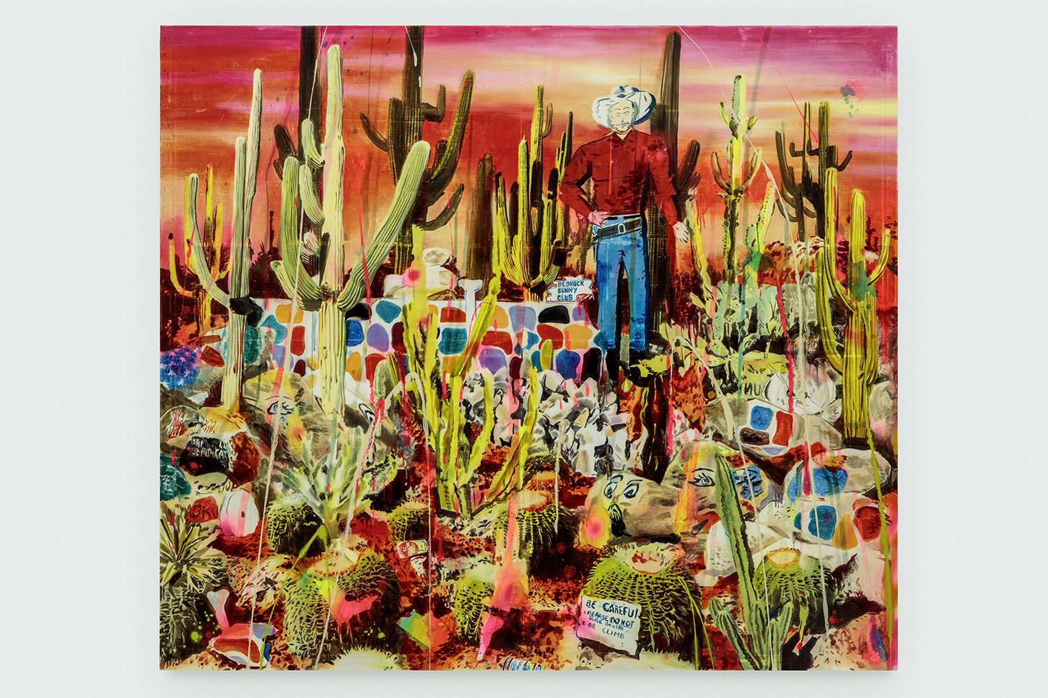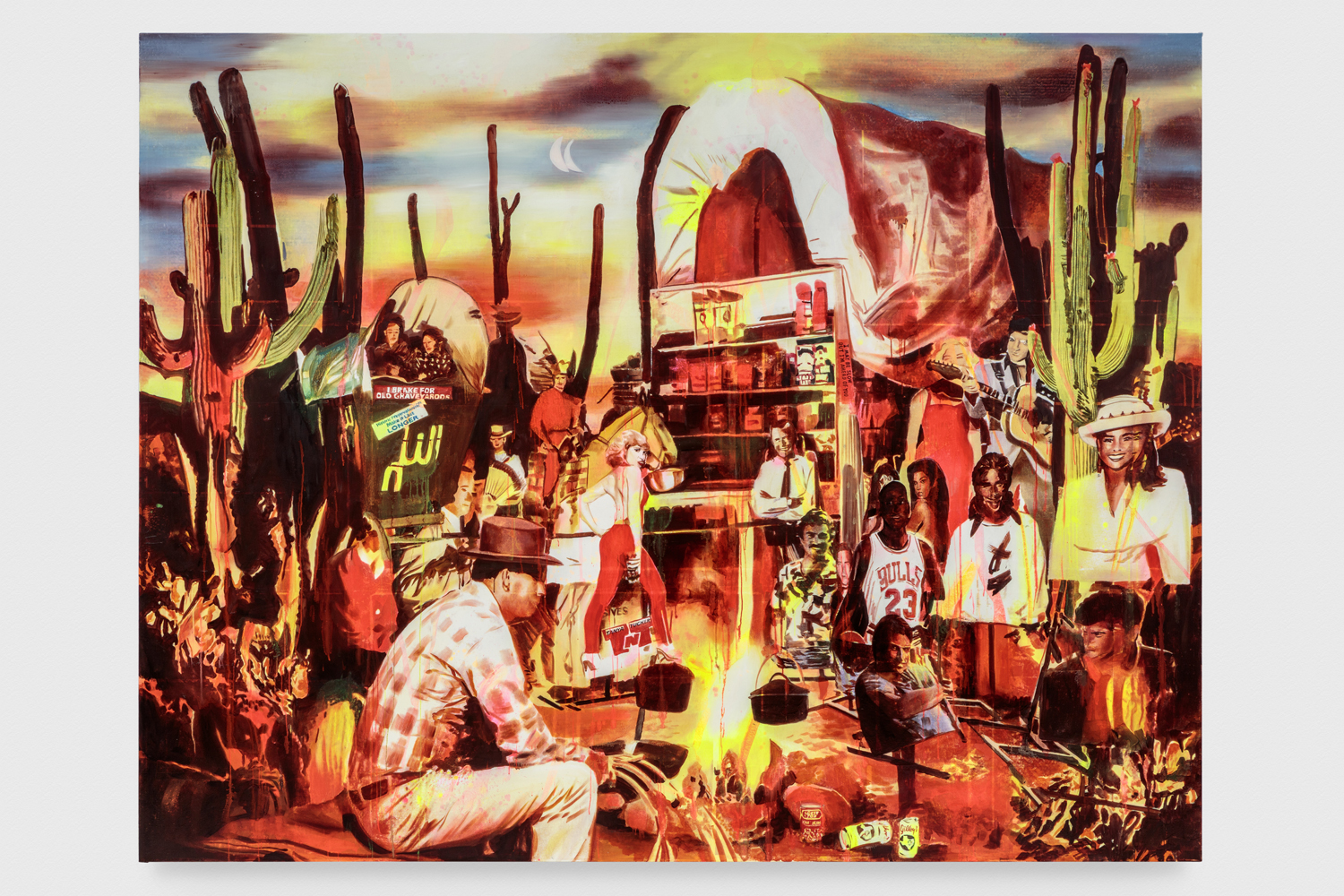 Standoff at the Bedrock Bunny Club, 2019. Acrylic, spray paint, photo transfer, oil and enamel on canvas, 84 x 96 inches, 213 x 244 cm