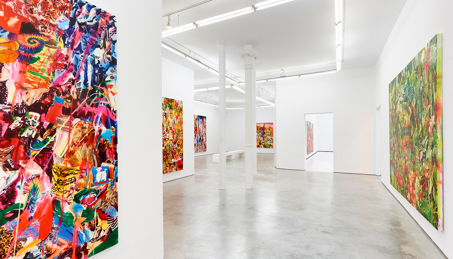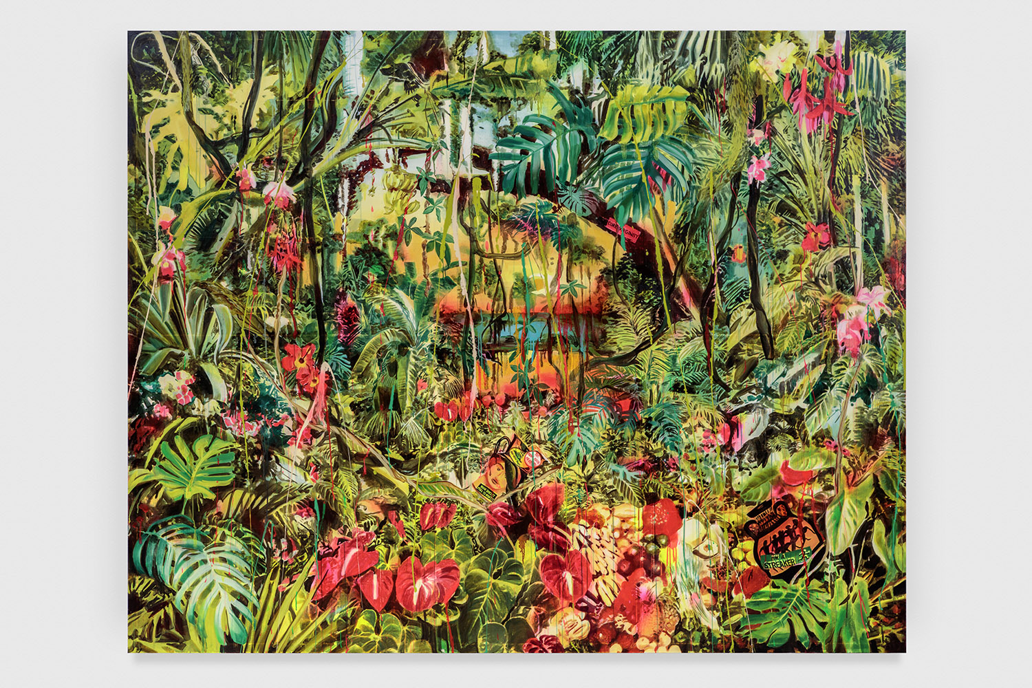 Garden of Eden Recreation, 2019. Acrylic, spray paint, photo transfer, oil and enamel on canvas, 96 x 120 inches, 244 x 305 cm