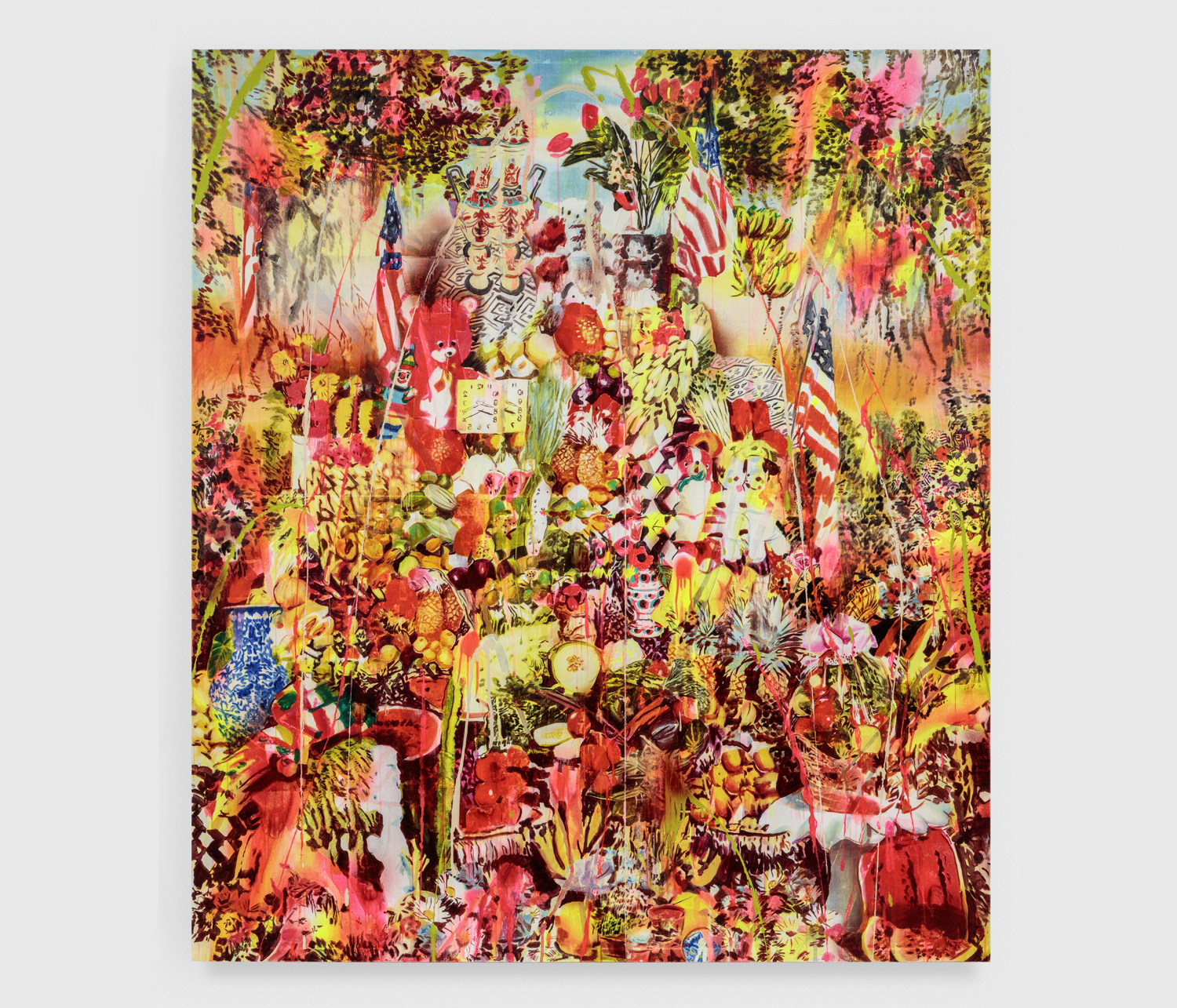 Offering to the Gods, 2019. Acrylic, spray paint, photo transfer, oil and enamel on canvas, 96 x 84 inches, 244 x 213 cm