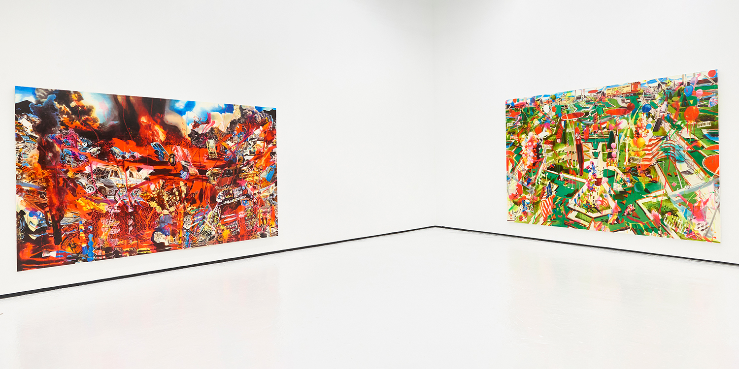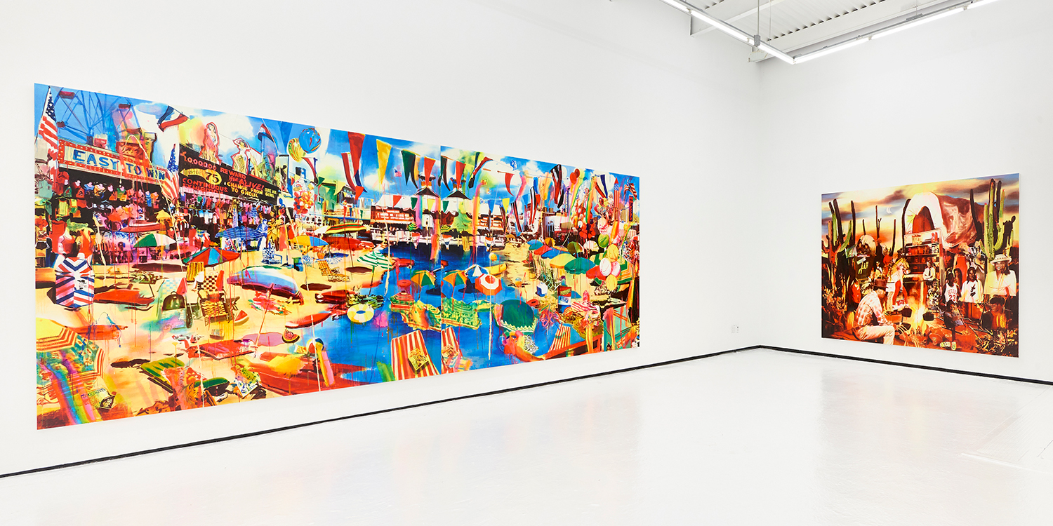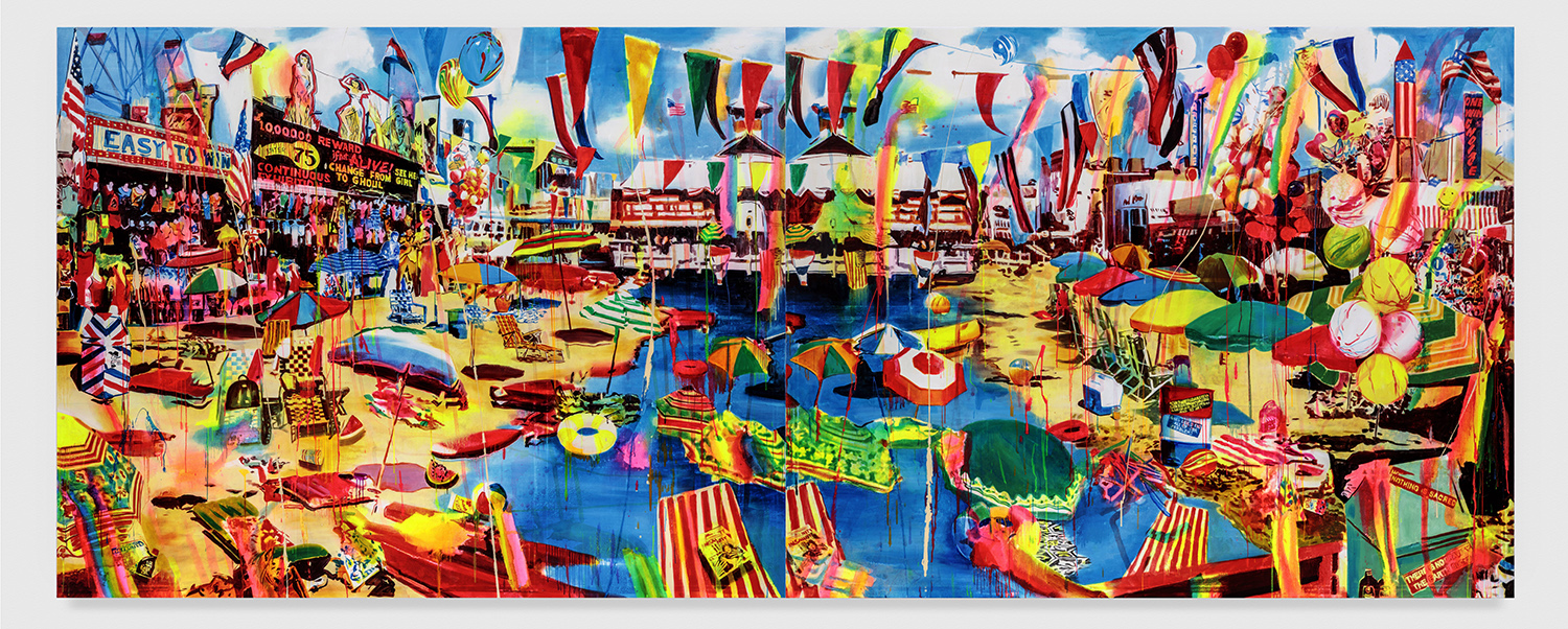 Ocean Front Property in Arizona, 2019. Acrylic, spray paint, photo transfer, oil and enamel on canvas, two panels: 94 x 240 inches, 239 x 610 cm