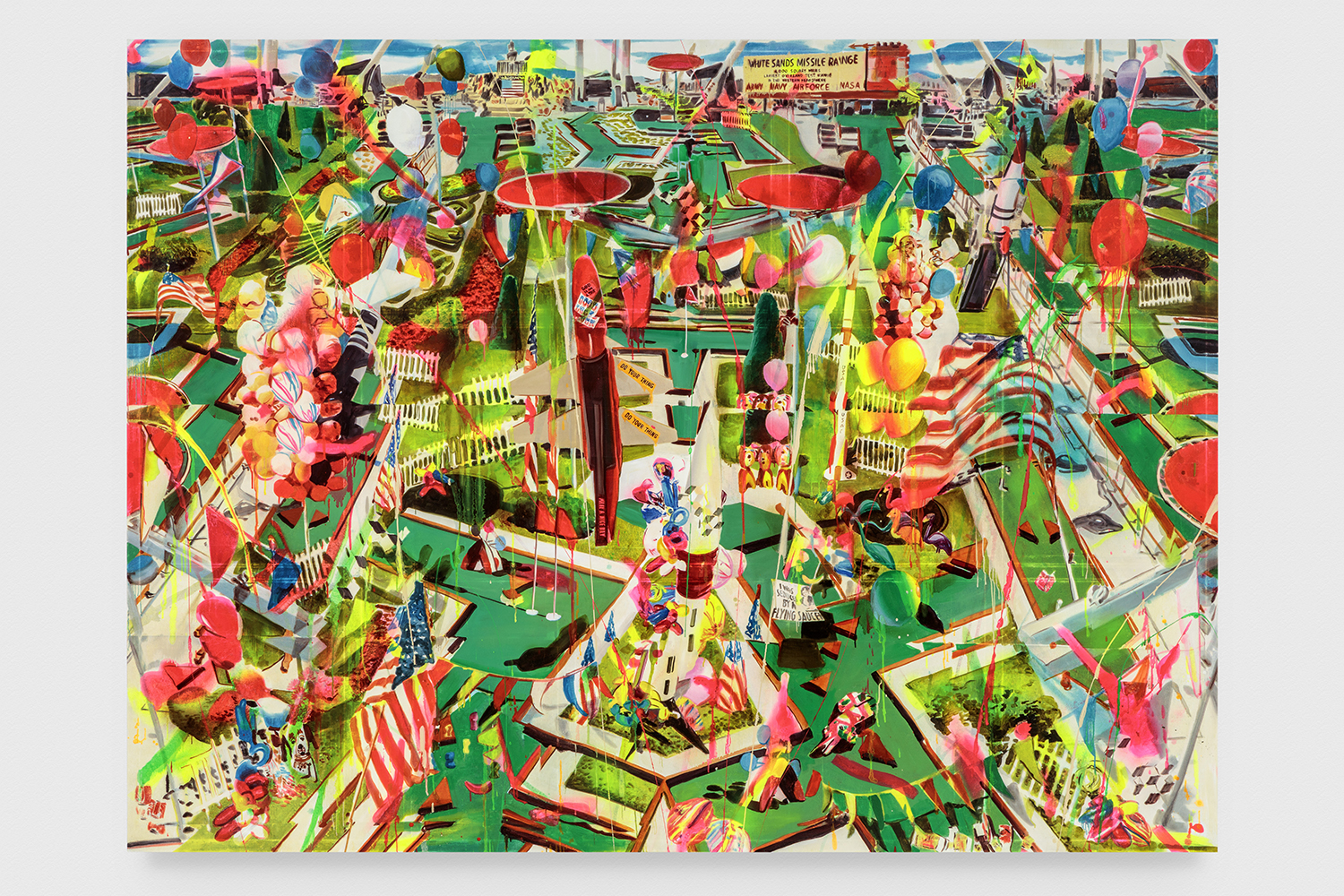 Putt Putt Golf Course on White Sands Missile Range, 2019. Acrylic, spray paint, photo transfer, oil and enamel on canvas, 94 x 126 inches, 238.8 x 320 cm
