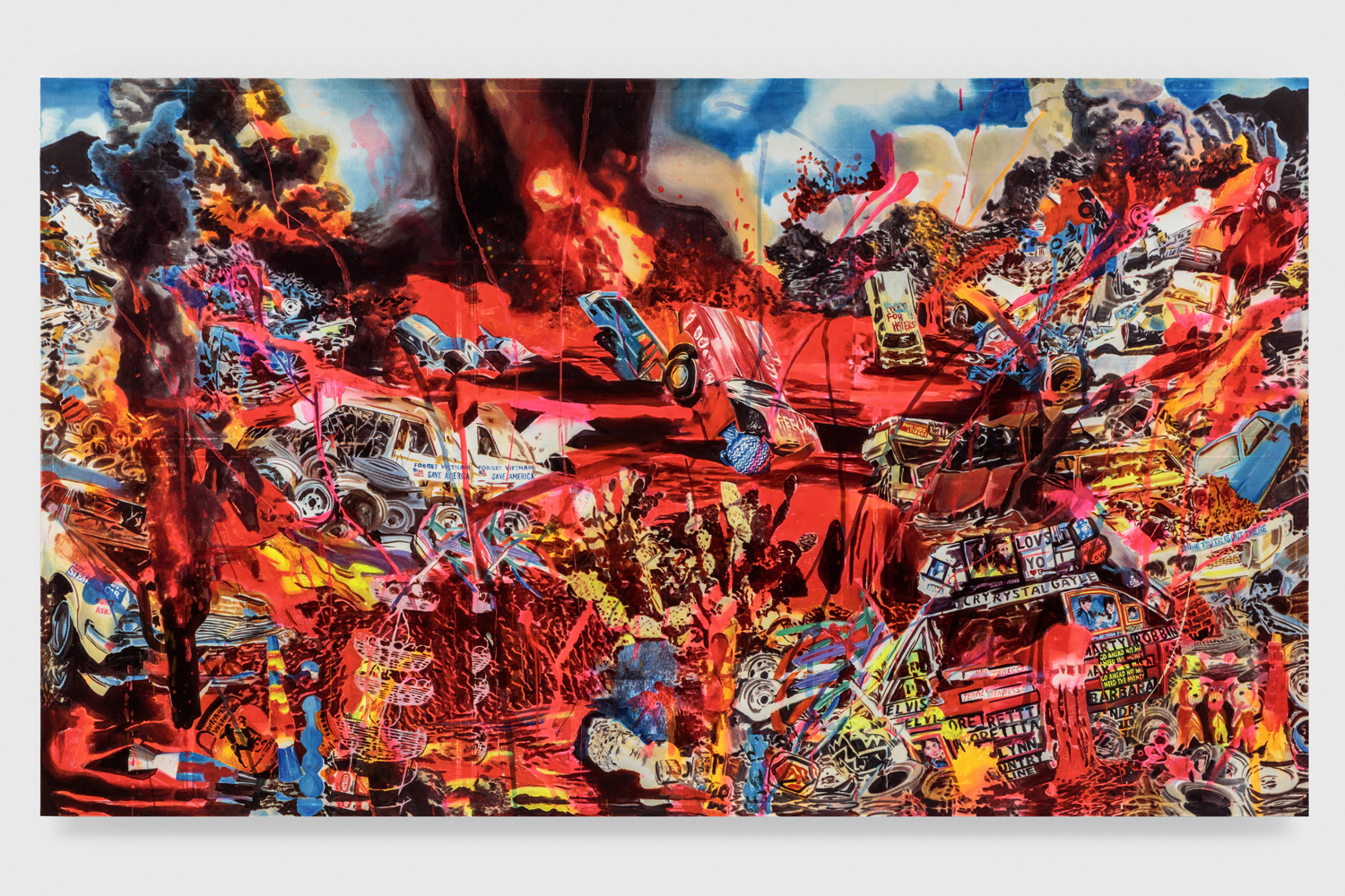 Volcanic Eruption At The Junk Yard, 2019. Acrylic, spray paint, photo transfer, oil and enamel on canvas, 84 x 144 inches, 213 x 366 cm