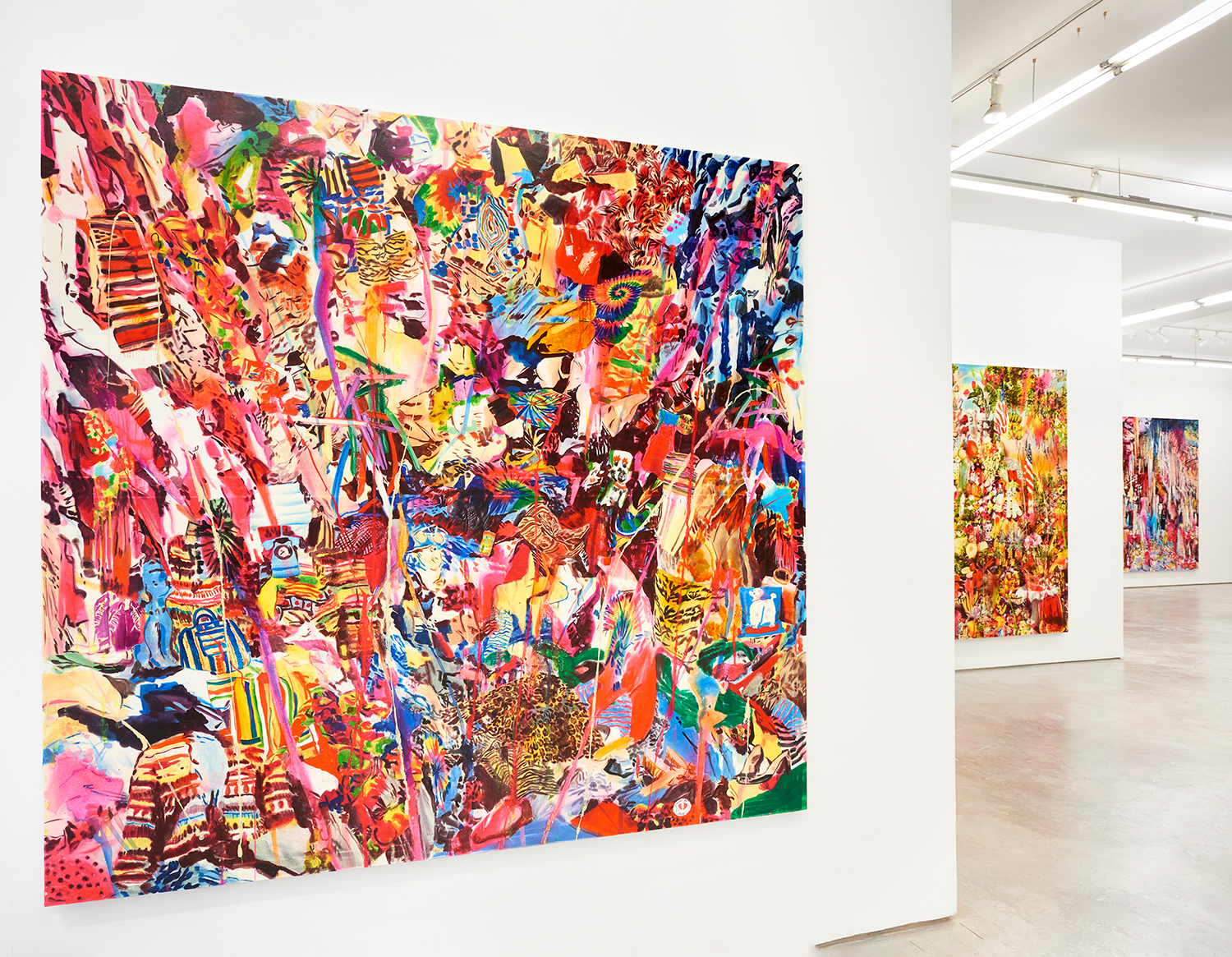 KonMari, 2019. Acrylic, spray paint, photo transfer, oil and enamel on canvas, 84 x 87 inches, 213 x 221 cm
